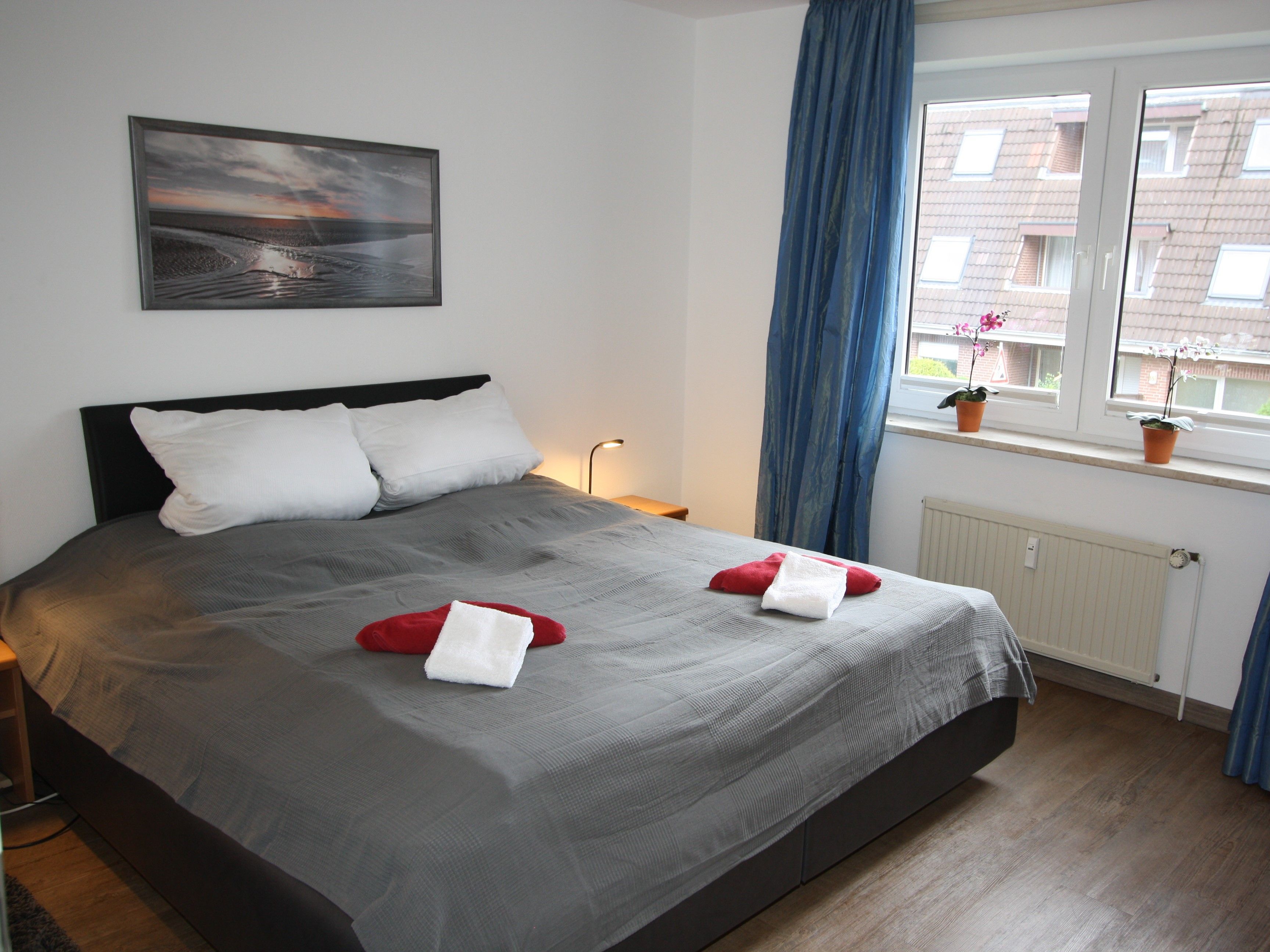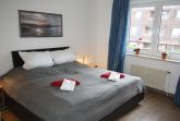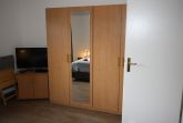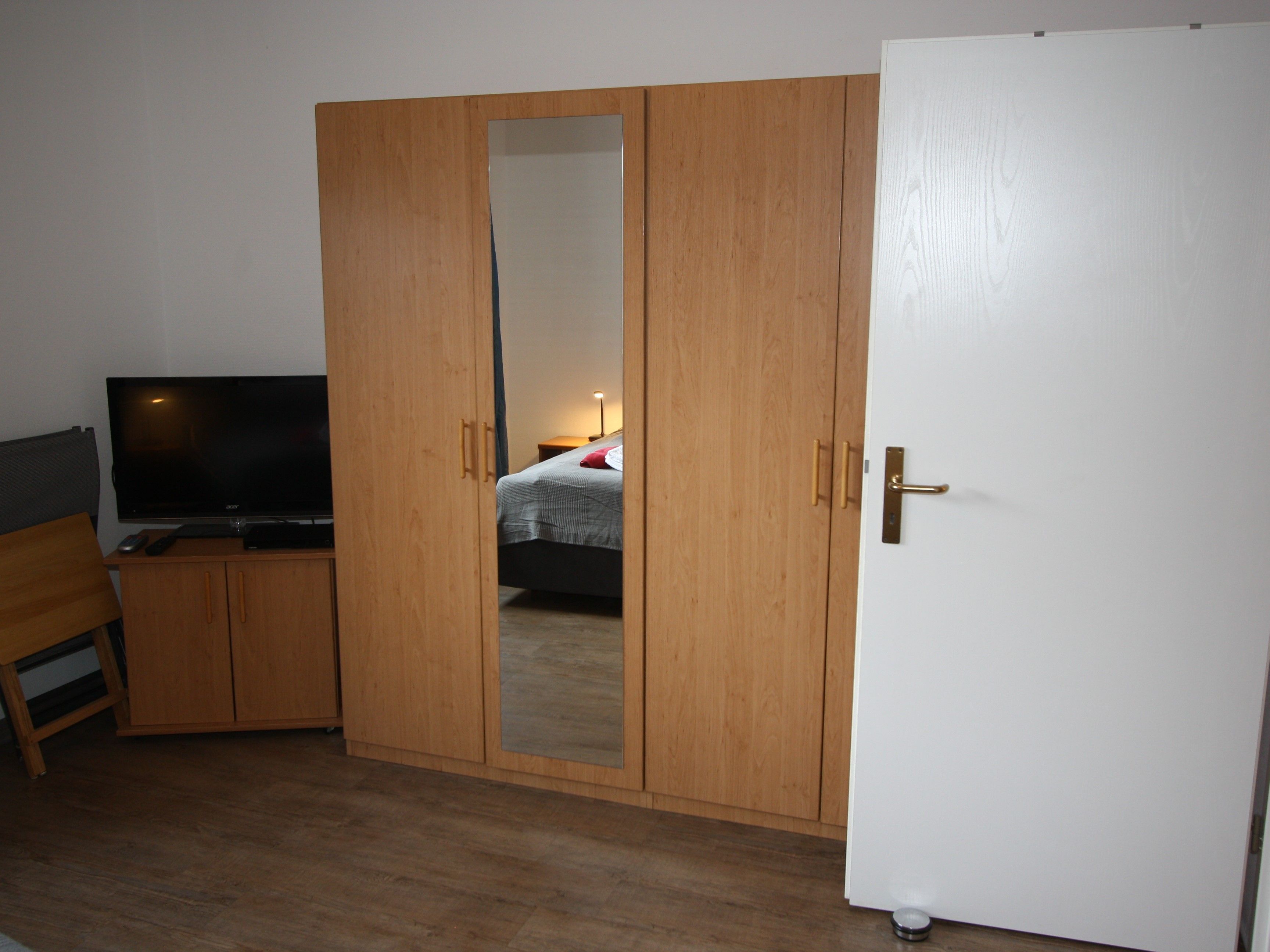 Schlafzimmer: mit modernem großem Doppelbett (200 cm x 200 cm) in Sitzhöhe, verstellbaren Lattenrosten und Kopfpolster, fahrbarem 2. LED Flachbildschirm zum bequemen Fernsehen vom Bett oder der kleinen Sitzgruppe, Blue-ray Player, ausreichend Platz im Kleiderschrank mit Ganzkörperspiegel, Verdunklungsrollo, Platz für zusätzliches Kinderbett.
