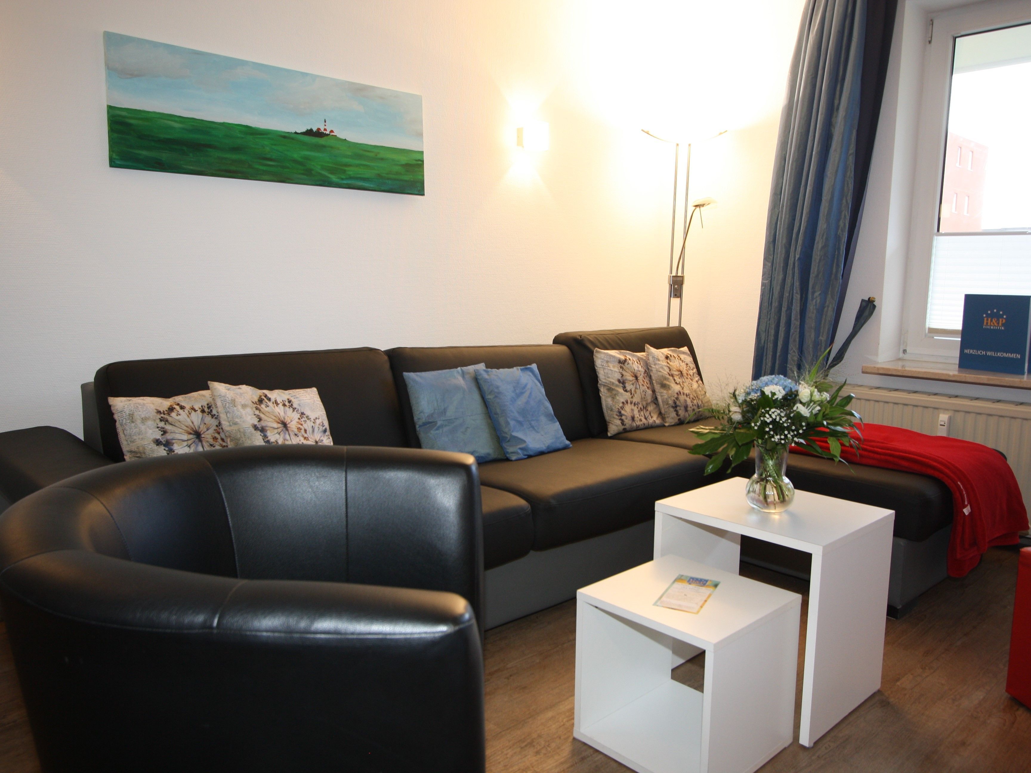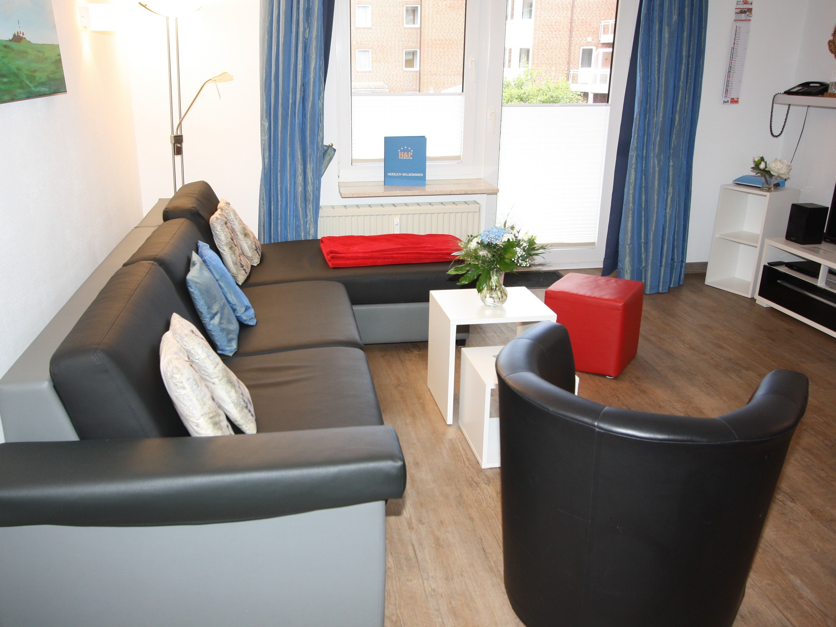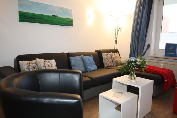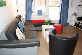 Wohn-Schlafraum: mit leicht umzubauender Doppelbettcouch (170 cm x 200 cm) mit sitzhoher Liegefläche und Longchair /Ottomane, Verdunkelungsgardinen, 40 LED Flachbildschirm SAT-TV, HiFi-Anlage mit CD und USB-Anschluss, DVD Player.