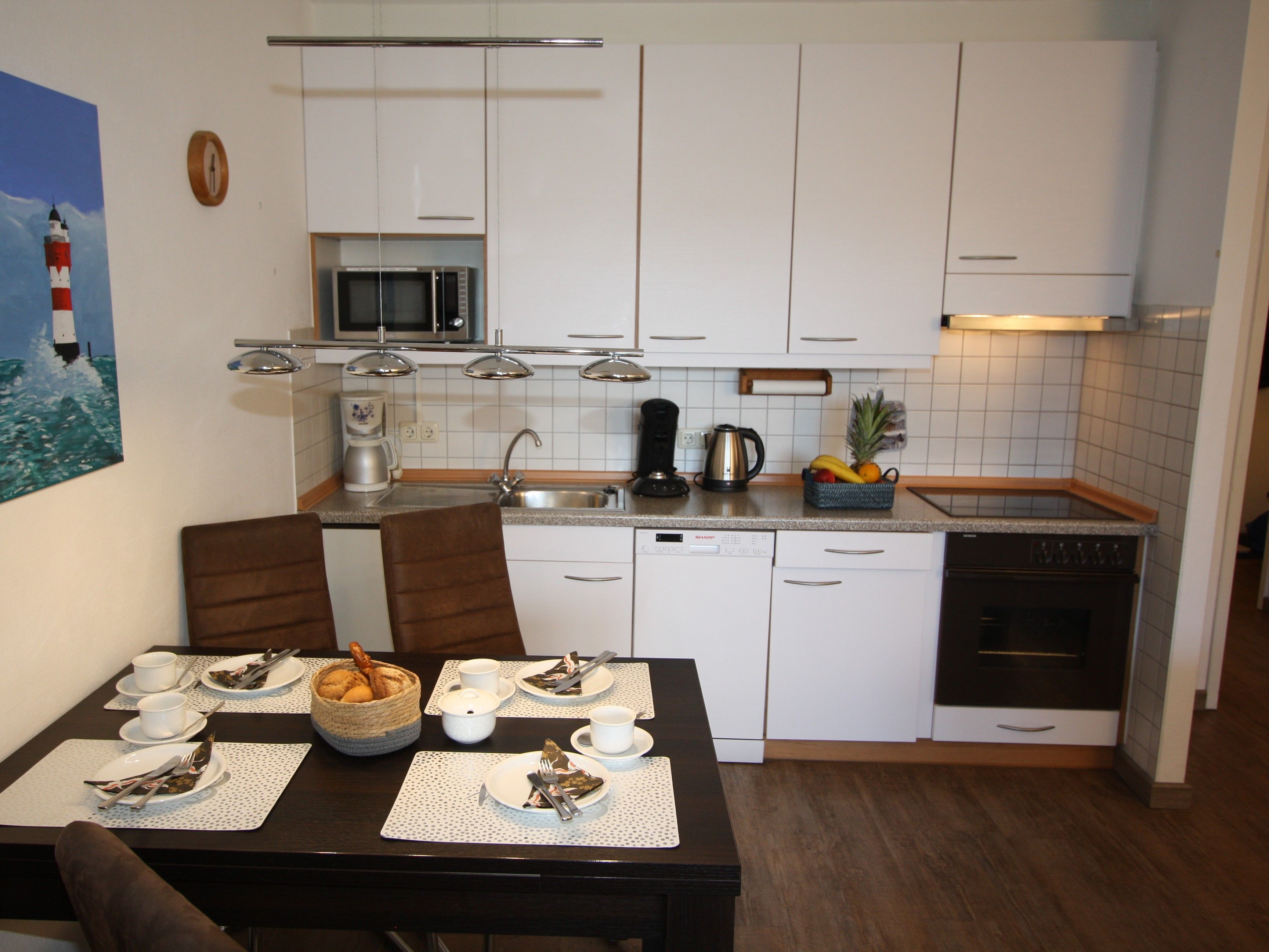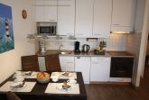 Separater Essplatz mit modernen Schwingstühlen, voll ausgestatteter Küchenbereich mit Ceranfeld, Backofen und Dunstabzughaube, geräuscharmer Spülmaschine, Grill-Mikrowelle, Kaffeemaschine, Senseo Kaffeepadmaschine mit Milchaufschäumer, Wasser- und Eierkocher.
