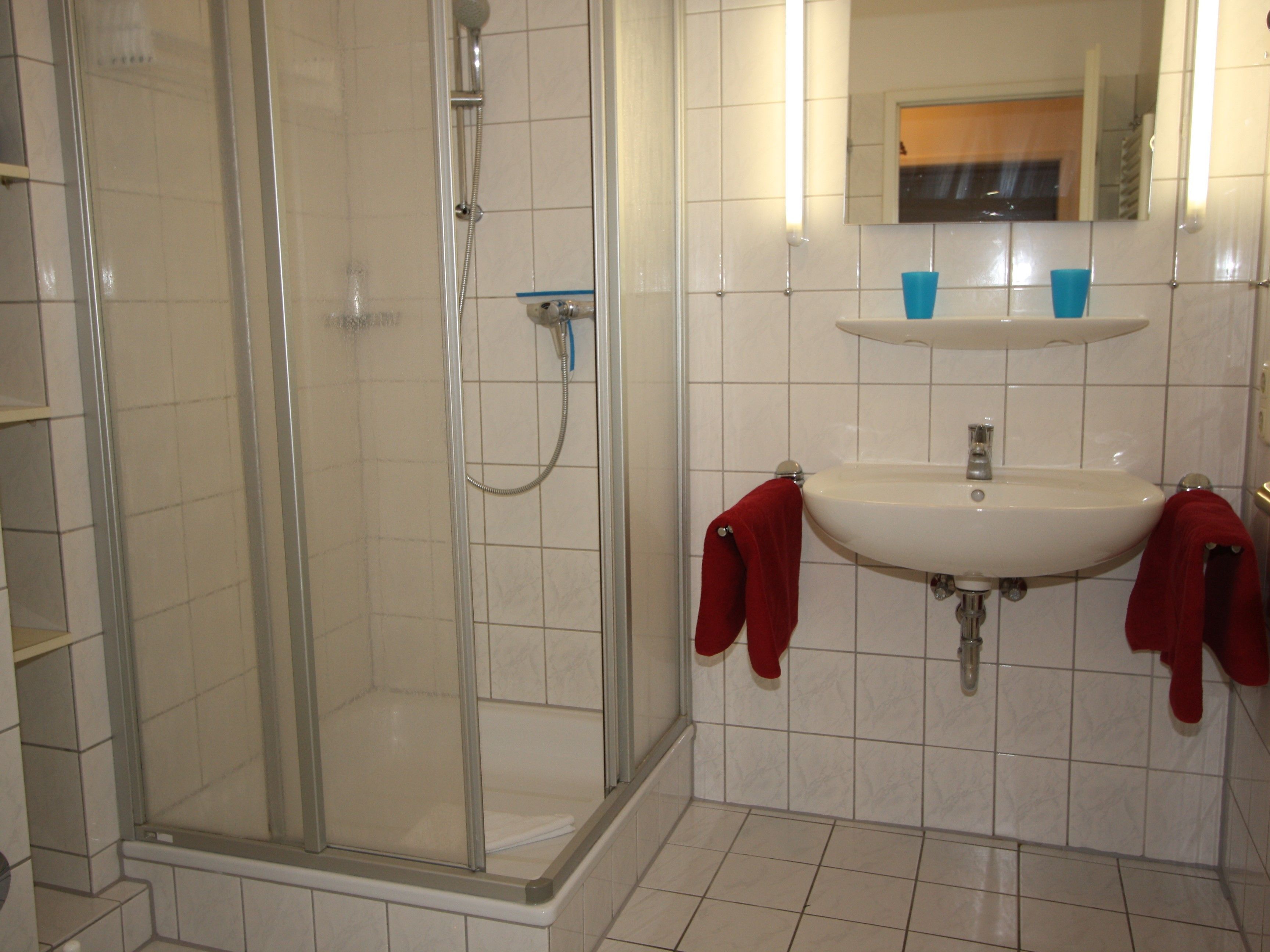 Geräumiges Badezimmer mit Dusche, ausreichend Ablagefläche im Regal, Hocker und Föhn, transportabler Vergrößerungsspiegel.