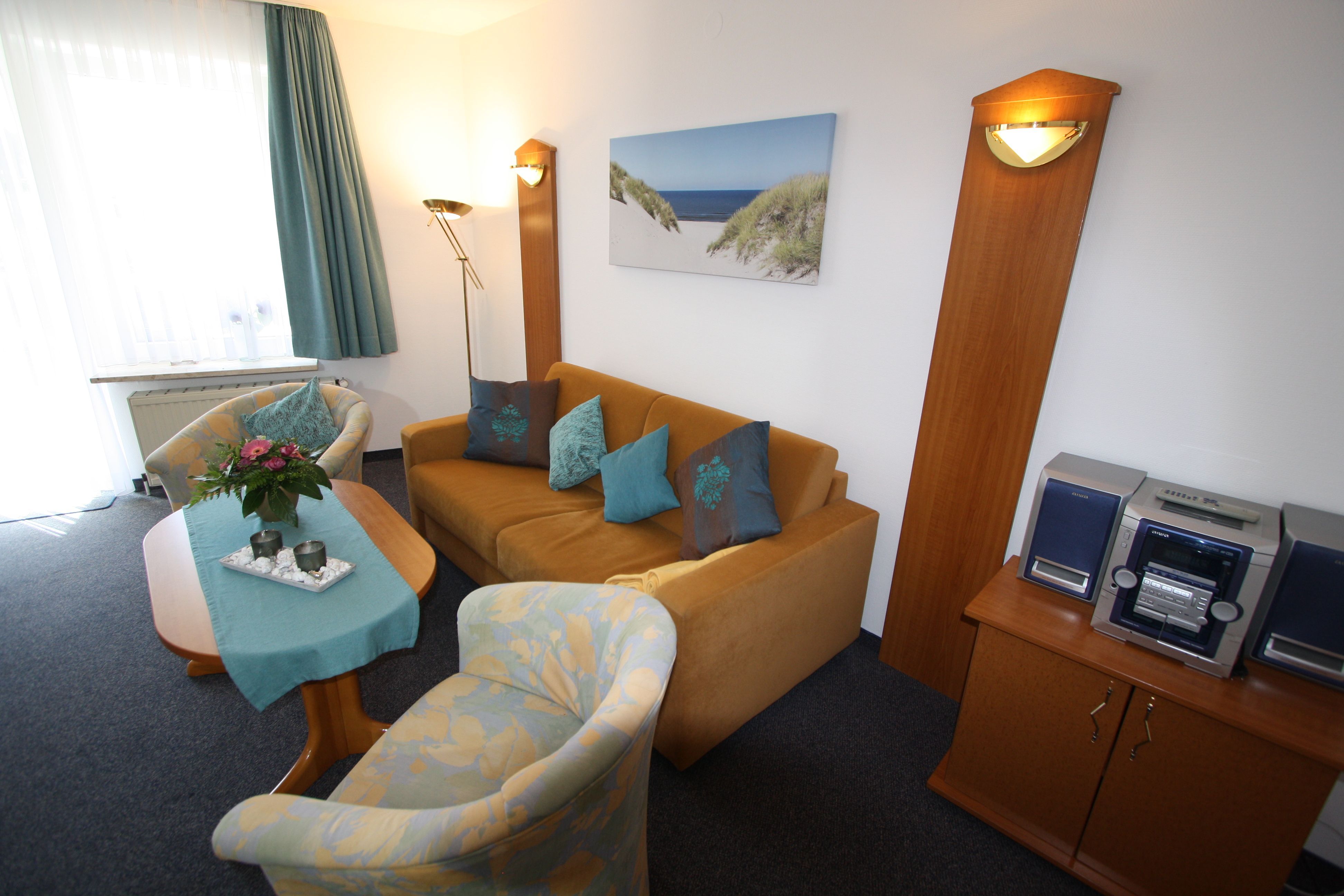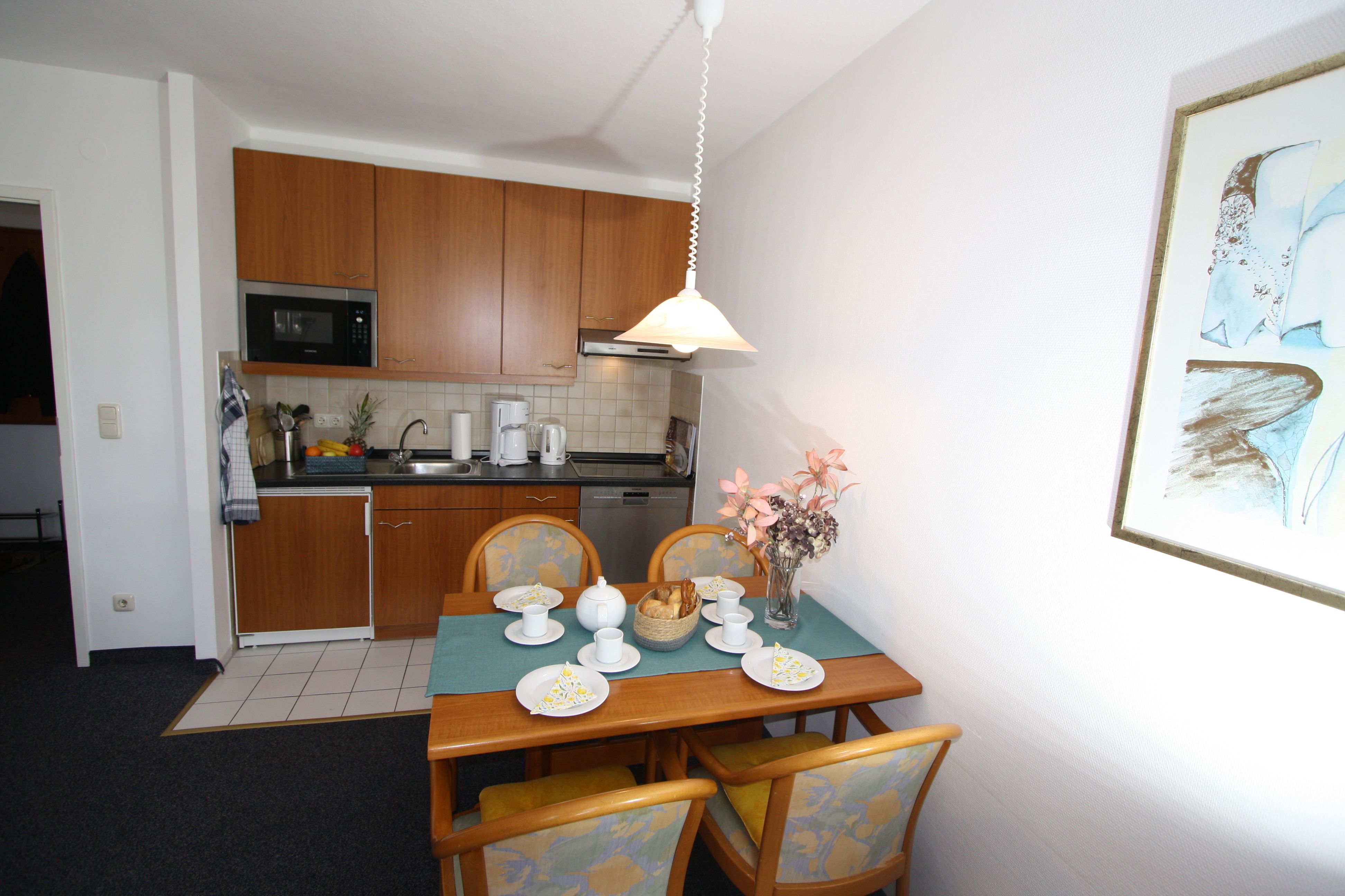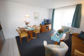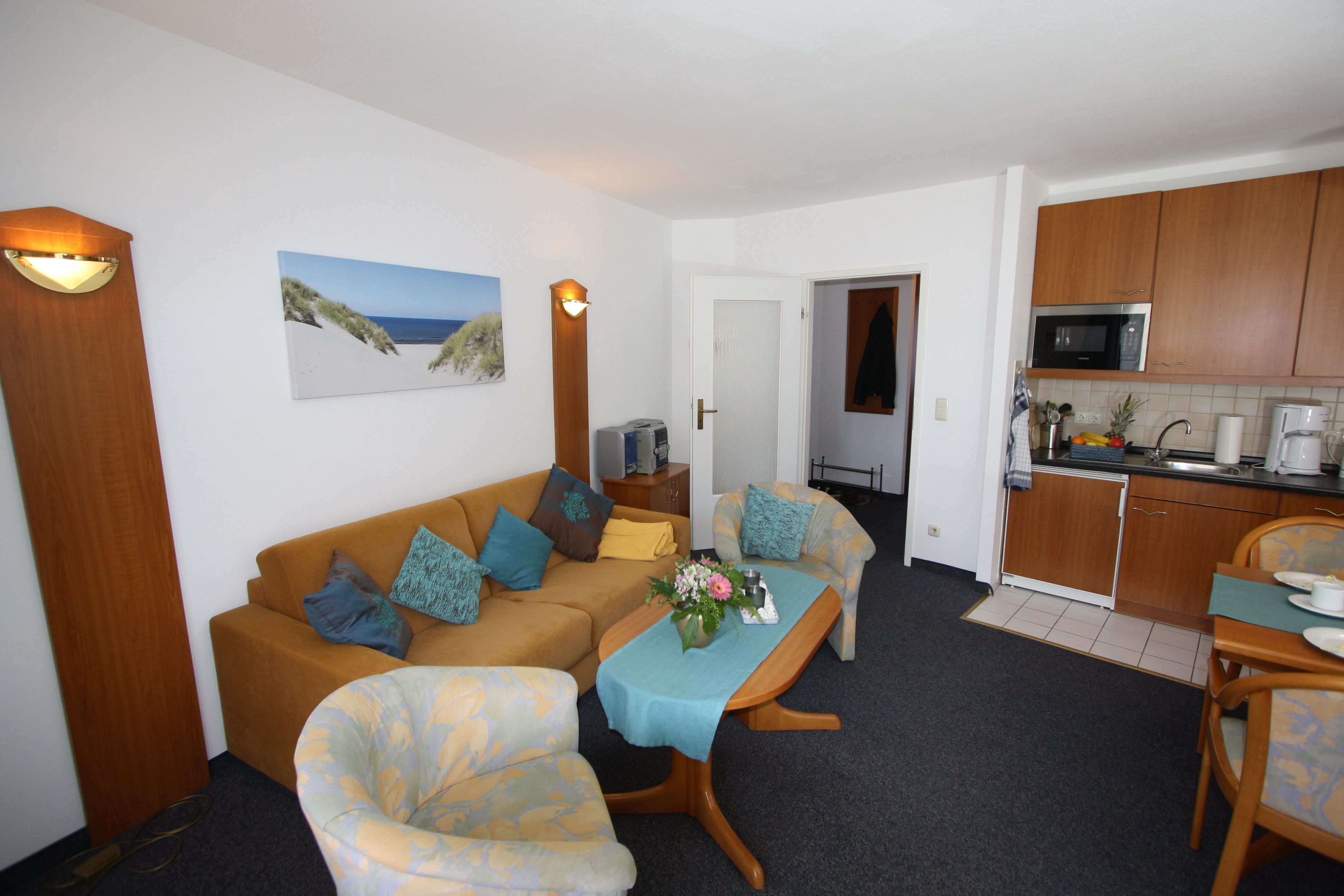 Sie wohnen in einem 2-Zimmer-Appartement für bis zu 4 Personen auf ca. 51 m² Wohnfläche im Erdgeschoss. Ein Schlafzimmer mit Doppelbett, Wohn-/Schlafraum mit bequemer Doppelbettcouch, separater Essplatz, voll ausgestatteter Küchenbereich, Dusche/WC, Terrasse und SAT-TV, kostenloses WLAN. PKW-Stellplatz in der Tiefgarage.