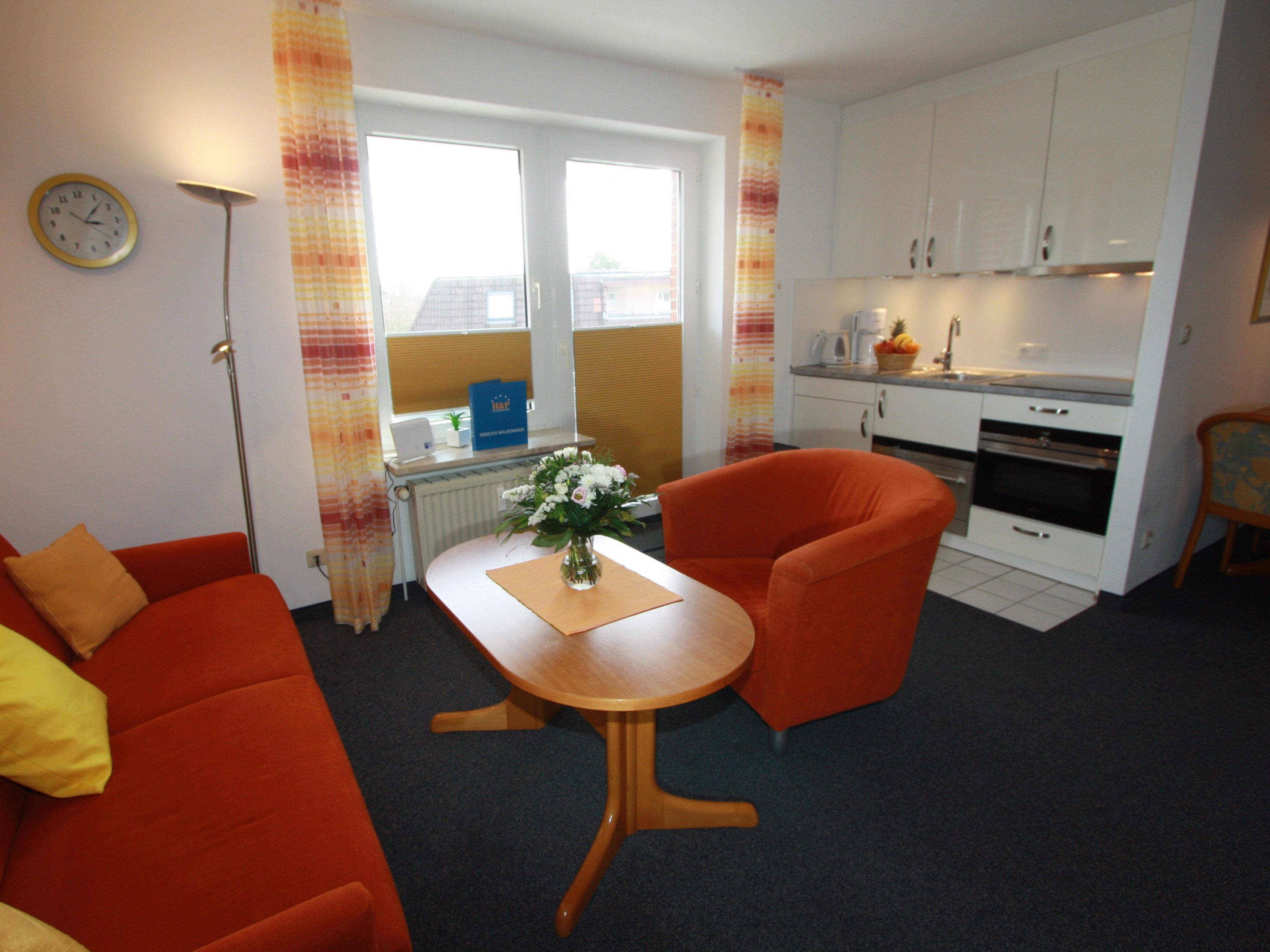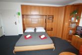 Sie wohnen in einem großzügigen 1-Raum-Appartement von ca. 35 m² für bis zu 2 Personen. Im Wohn-/Schlafraum befinden sich eine exklusive Doppelbettcouch (140 cm x 200 cm) und ein Schrankbett (160 cm x 190 cm), ein geräumiger Kleiderschrank, ein separater Essplatz mit großem Esstisch. Die hochwertige Küchenzeile hat eine Spülmaschine, eine im Backofen integrierte Mikrowelle und ein Ceranfeld mit vier Kochstellen. Es gibt einen Blu-ray-Player, Stereoanlage mit CD-Player und Radio sowie SAT-LCD-TV. Das Tageslichtbad mit Dusche/WC ist sehr geräumig und im Jahr 2021 teilrenoviert.