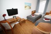 3-türiger Kleiderschrank, zwei Einzelbetten mit Nachttischen, Schreibtisch, Korbsessel, zweiter Flachbild-TV, Fliegengitter vor dem Fenster