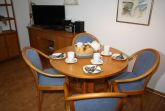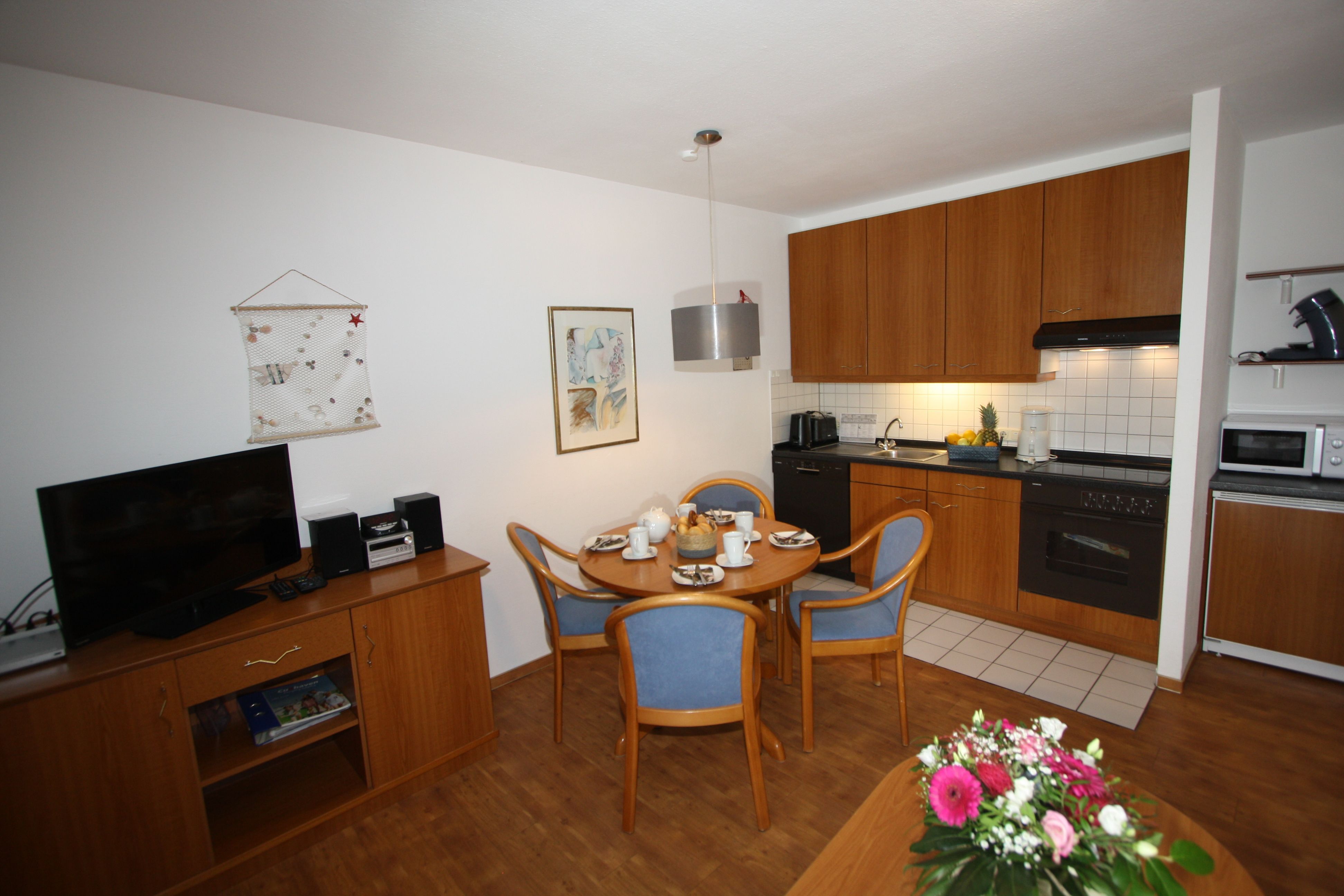 breites bequemes Sofa, Esstisch mit vier Lehnstühlen, Telefon (kostenfreies Festnetz), kostenfreies WLAN, HiFi-Anlage mit CD-Player, 32 Zoll Fernseher, Blu-ray-Player, Fliegengitter vor dem Fenster Küchenzeile