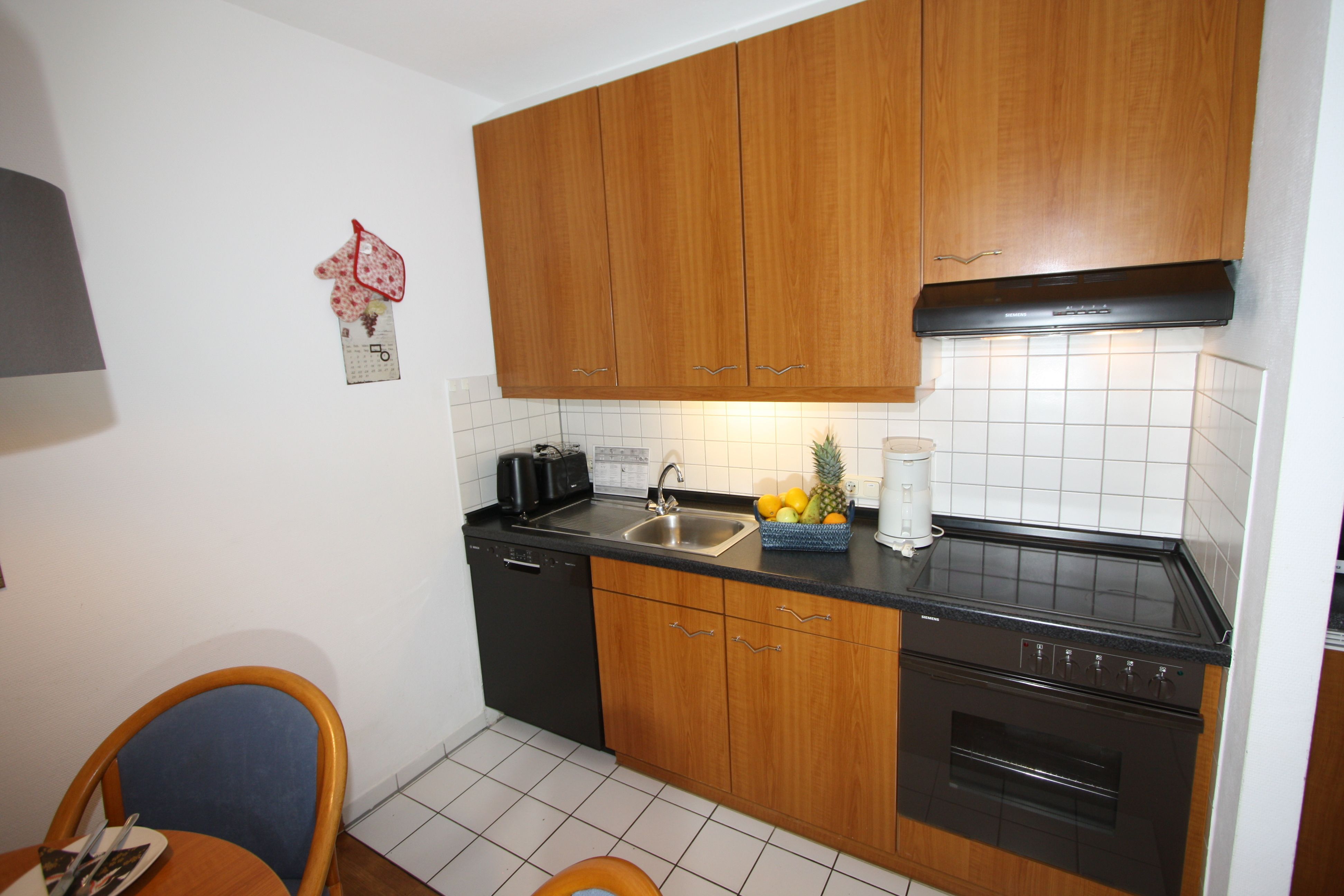 geräuscharme Spülmaschine, 4-er Ceranfeld mit Backofen, leiser Kühlschrank mit Gefrierfach, Mikrowelle, Kaffeemaschine, Senseo-Pad-Maschine, Toaster, Wasserkocher, Eierkocher, Thermoskanne, reichlich Geschirr, Besteck, Töpfe