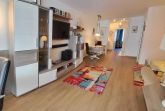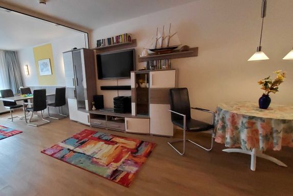 Wohnzimmer: Gemütliche Sitzecke in L-Form, moderne Schrankwand mit 46(120 cm) LED-TV mit Ambilight und Soundbar, HiFi-Anlage mit CD, Video- und DVD-Player mit div. DVD. Separater Essbereich mit modernen Lederschwingstühlen für vier Personen und kleiner Essbereich für zwei Personen, Fenster mit Verdunklungsrollo und festinstallierten Fliegengitter.