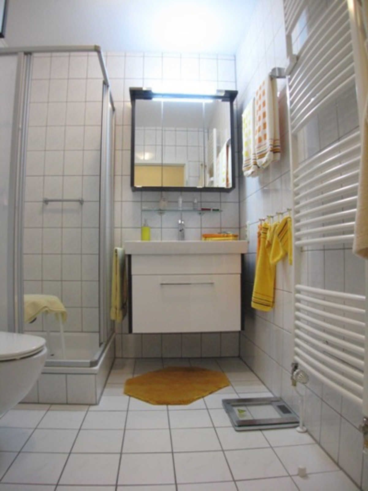 Geräumiges Badezimmer: Dusche, Spiegelschrank, Hocker, Föhn, Handtuchheizung und ausreichend Ablagefächer.