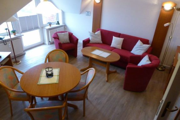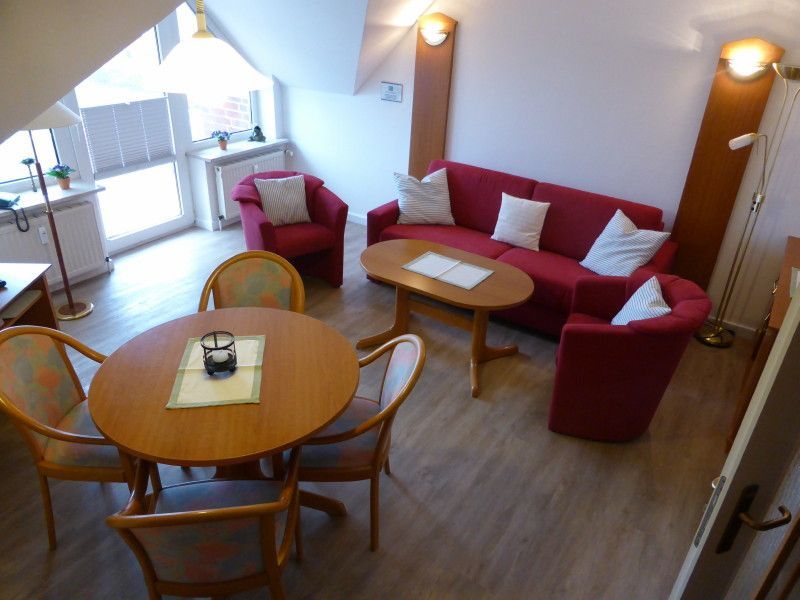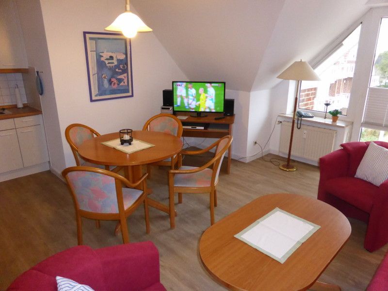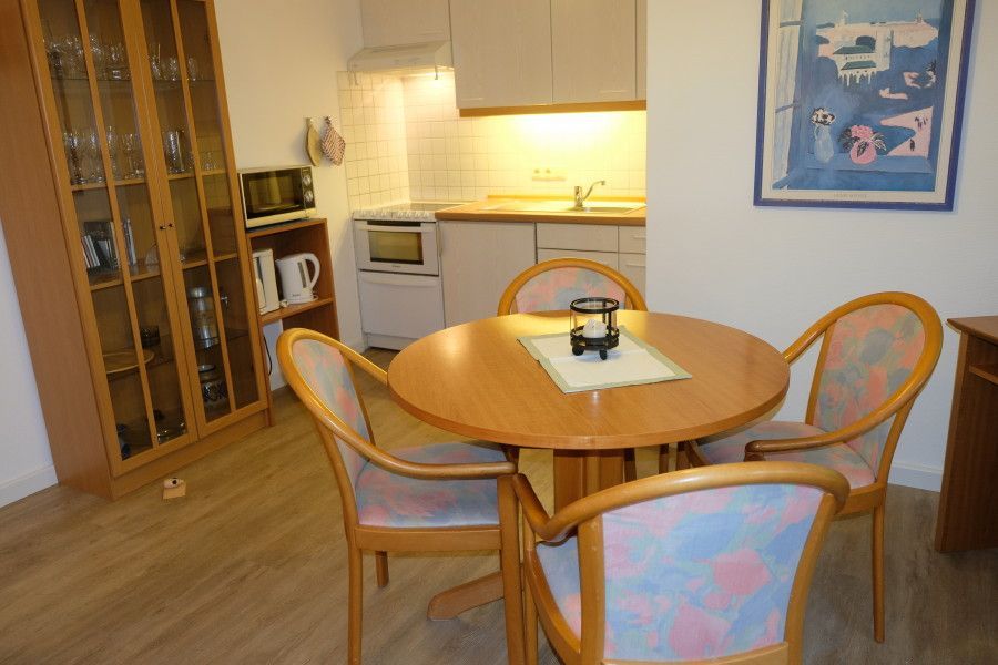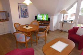 Schlafzimmermit Doppelbett, Wohn-/Schlafraum mit bequemer Doppelbettcouch und Sesseln, digitaler SAT-TV (Flachbild), DVD/CD-Spieler mit diversenDVDs und CDs, Stereoanlage, Internetzugang, separater Essplatz, voll ausgestatteter Küchenbereich mit Geschirrspüler und Mikrowelle. Vom Wohnraum gelangen Sie auf den nach Süden gerichteten Balkon. Das Duschbad/WC verfügt über ein großes Fenster. Ein PKW-Einstellplatz befindet sich in einer separaten Einzelgarage.