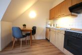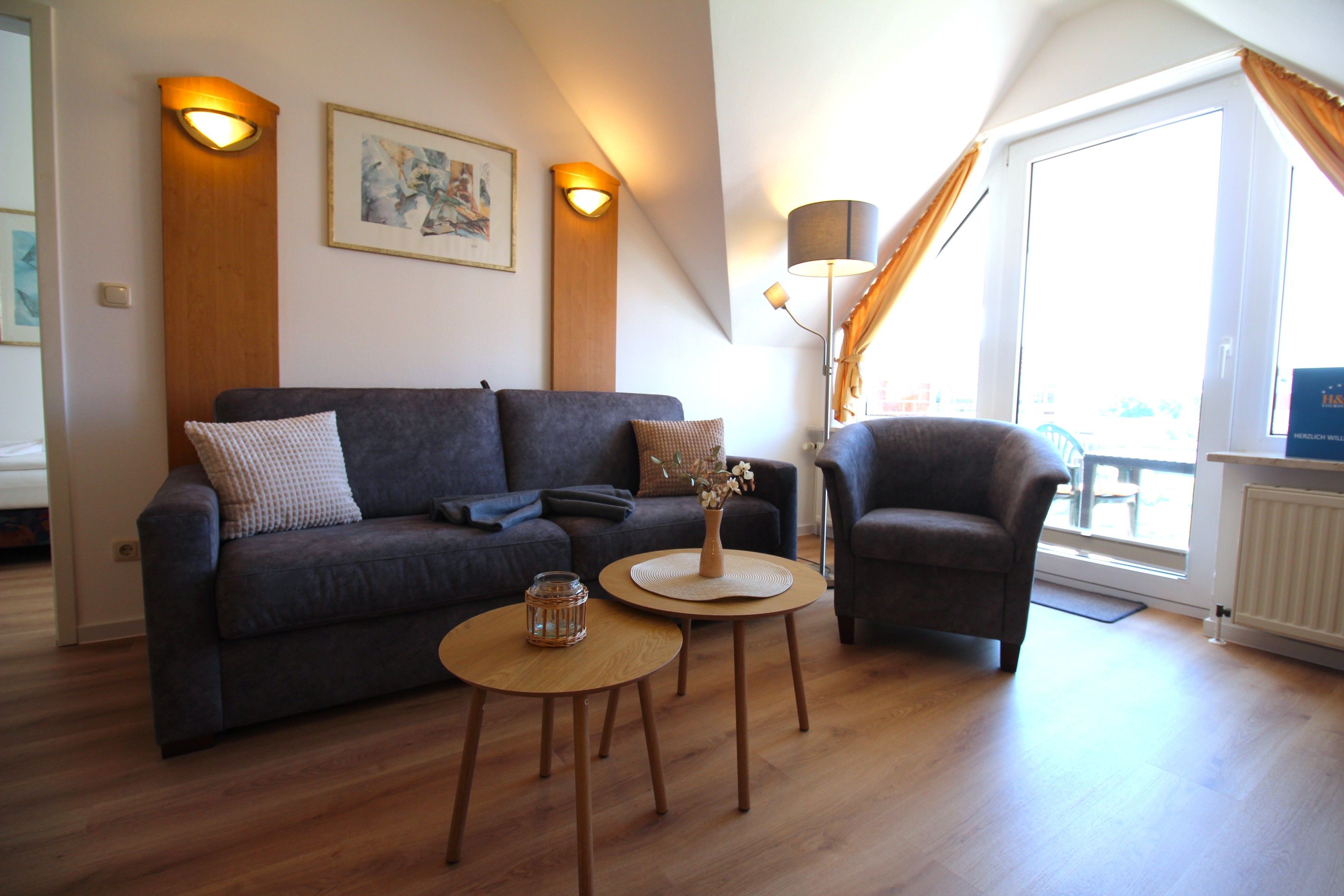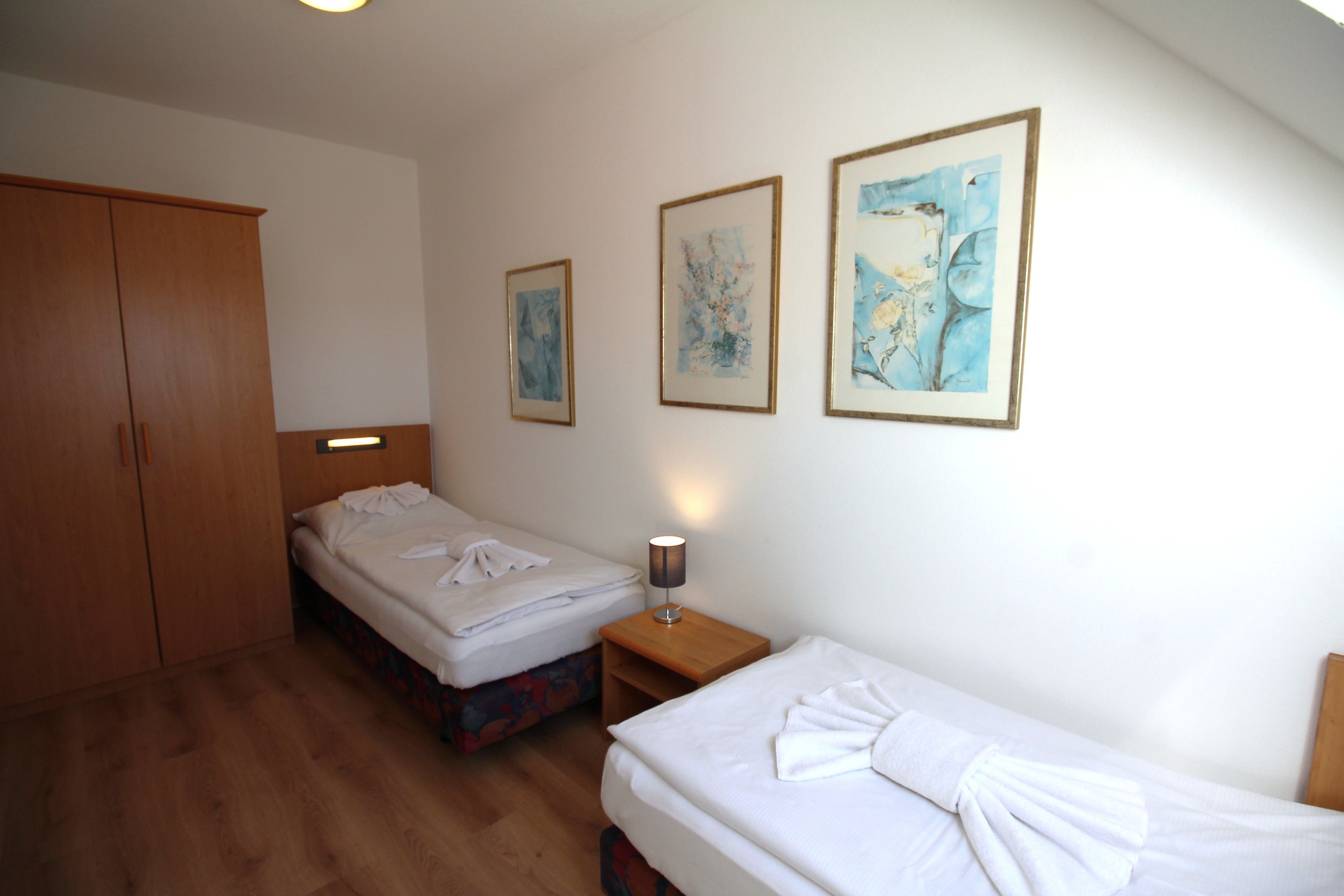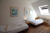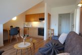 Das separate Schlafzimmer bietet zwei Einzelbetten 80 cm x200 cm mit integrierten Leselampen, geräumigem Kleiderschrank und die Schlafcouch im Wohnzimmer bietet außerdem mit 170 cm x 200 cm Liegefläche Platz für eine dritte Person. Die Wohnung verfügt über einen voll ausgestatteten Küchenbereich und ein lichtdurchflutetes Tageslichtbad.