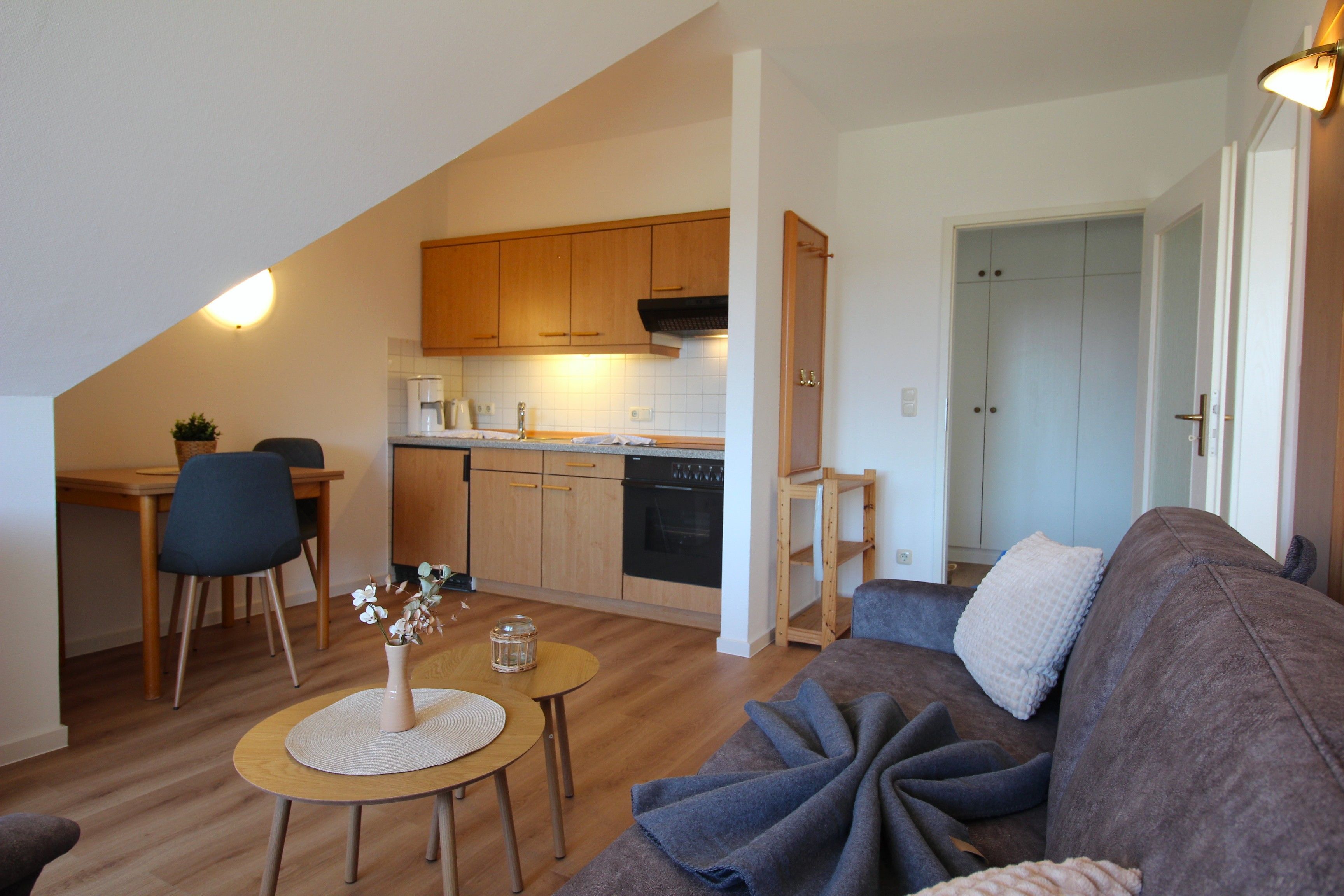 Diese charmant moderne Ferienwohnung bietet Ihnen alles, was Sie für einen entspannten Kurzurlaub benötigen. Durch den offenen Küchen-Wohnbereich lässt sie sich optimal nutzen, trotz der kleinen Größe von 35qm wirkt sie geräumig und luftig.