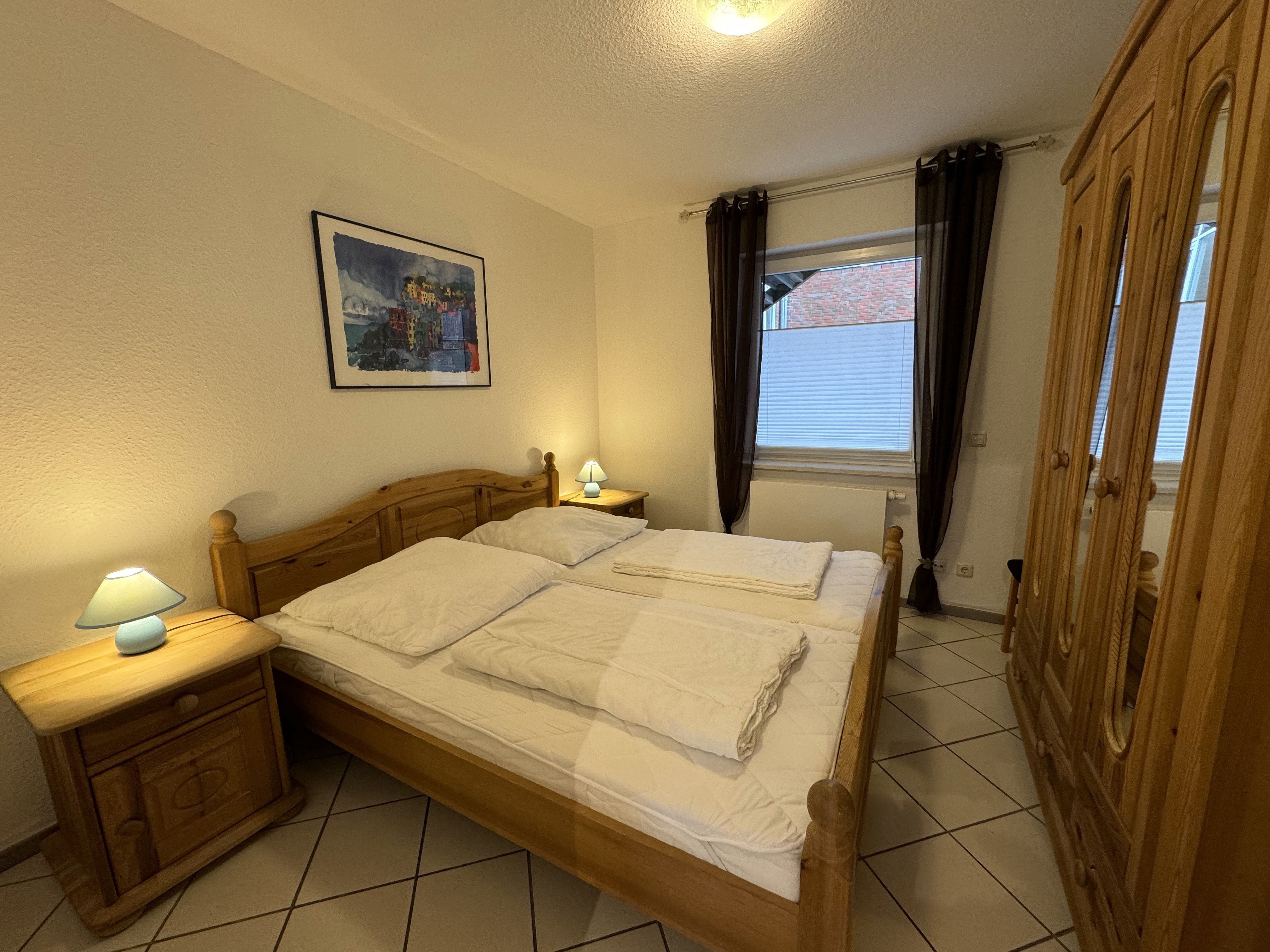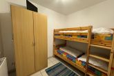 Ferienwohnung Seekuh, Wohnzimmer mit Essbereich und Küche, Flur, Badezimmer mit Dusche und WC, Elternschlafzimmer, Kinderschlafzimmer mit Etagenbett, Balkon, Tiefgaragenstellplatz
