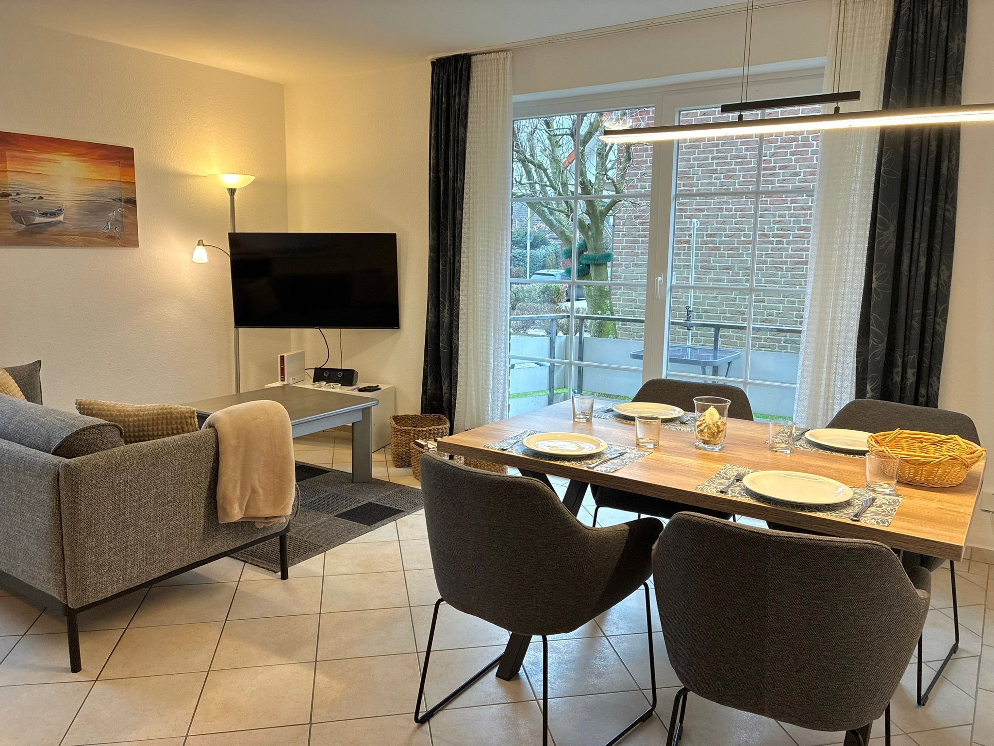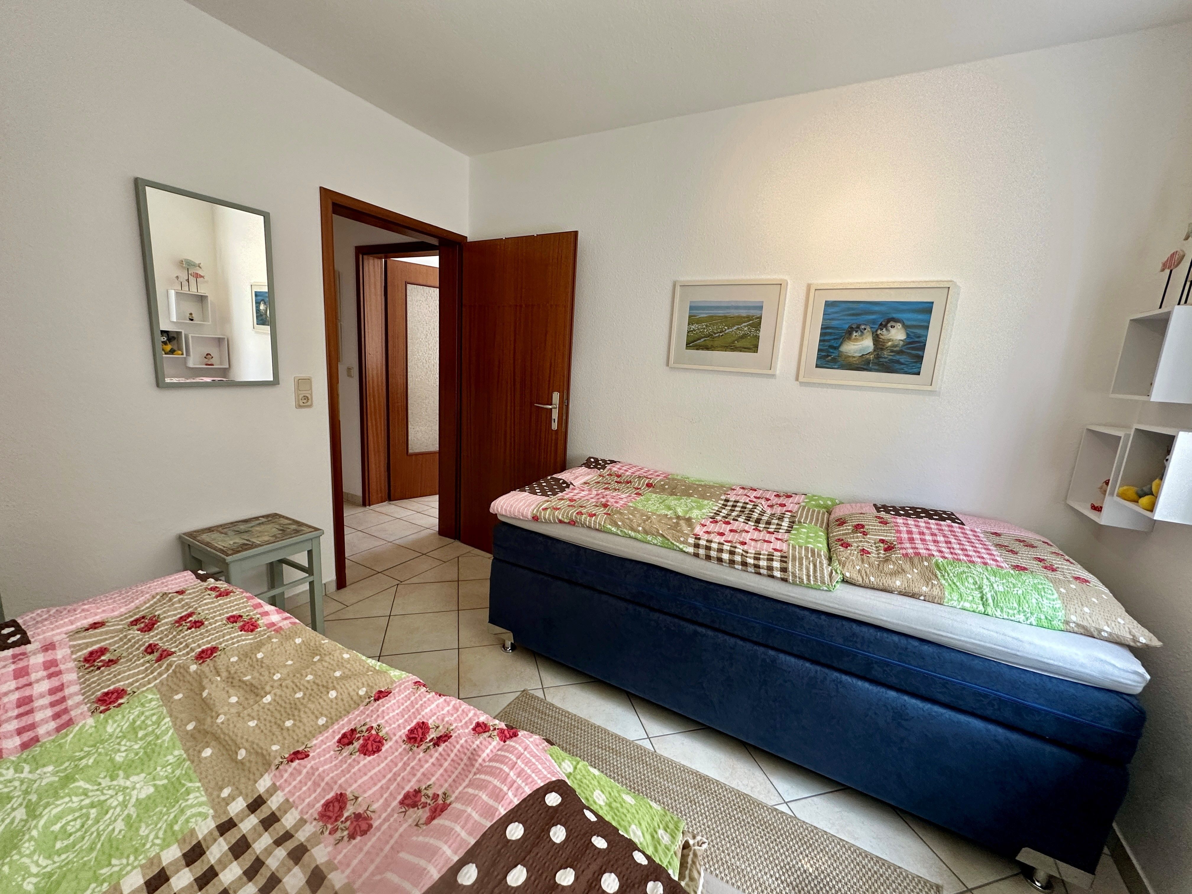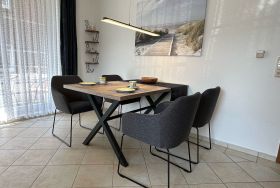 Sie wohnen in einem hübschen 3-Zimmer-Appartement im Erdgeschoss auf ca. 50 m² Wohnfläche. Ein Schlafraum mit Doppelbett und TV Gerät, ein Schlafraum mit zwei Einzelbetten, Wohnraum mit bequemer Sitzgarnitur und 50“ Smart TV Gerät mit dem die Gäste mit ihrem eigenen Account Netflix und Co. schauen können, WLAN, separater Essplatz, voll ausgestattete Einbauküche mit Geschirrspüler, Dusche/WC (Dusche mit flacher Duschtasse), Balkon, mit Einzelgarage. Die Wohnung ist nur wenige hundert Meter vom Hundestrand an der Kugelbake mit Sand- oder Rasenstrand und der Hundespielwiese am Beach House entfernt.