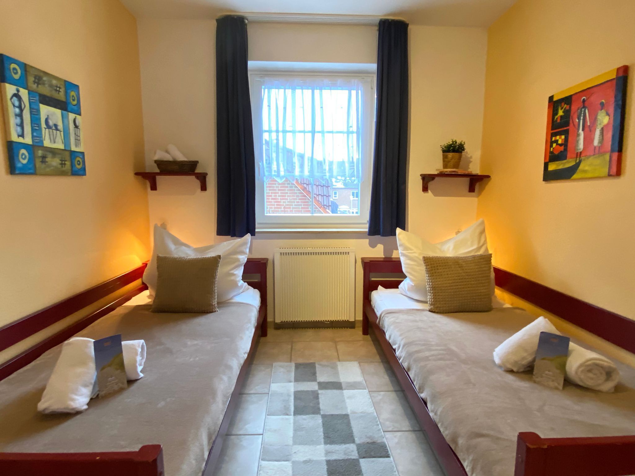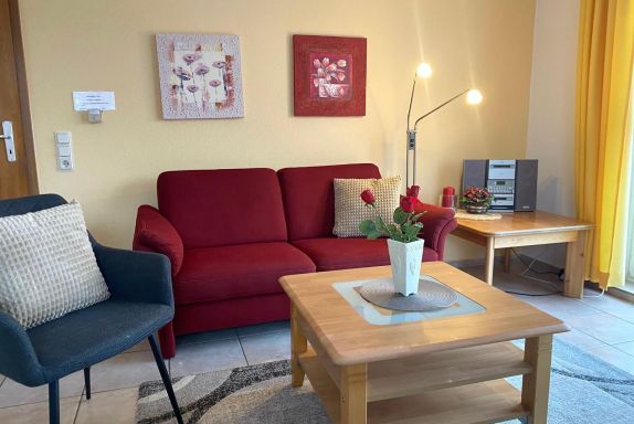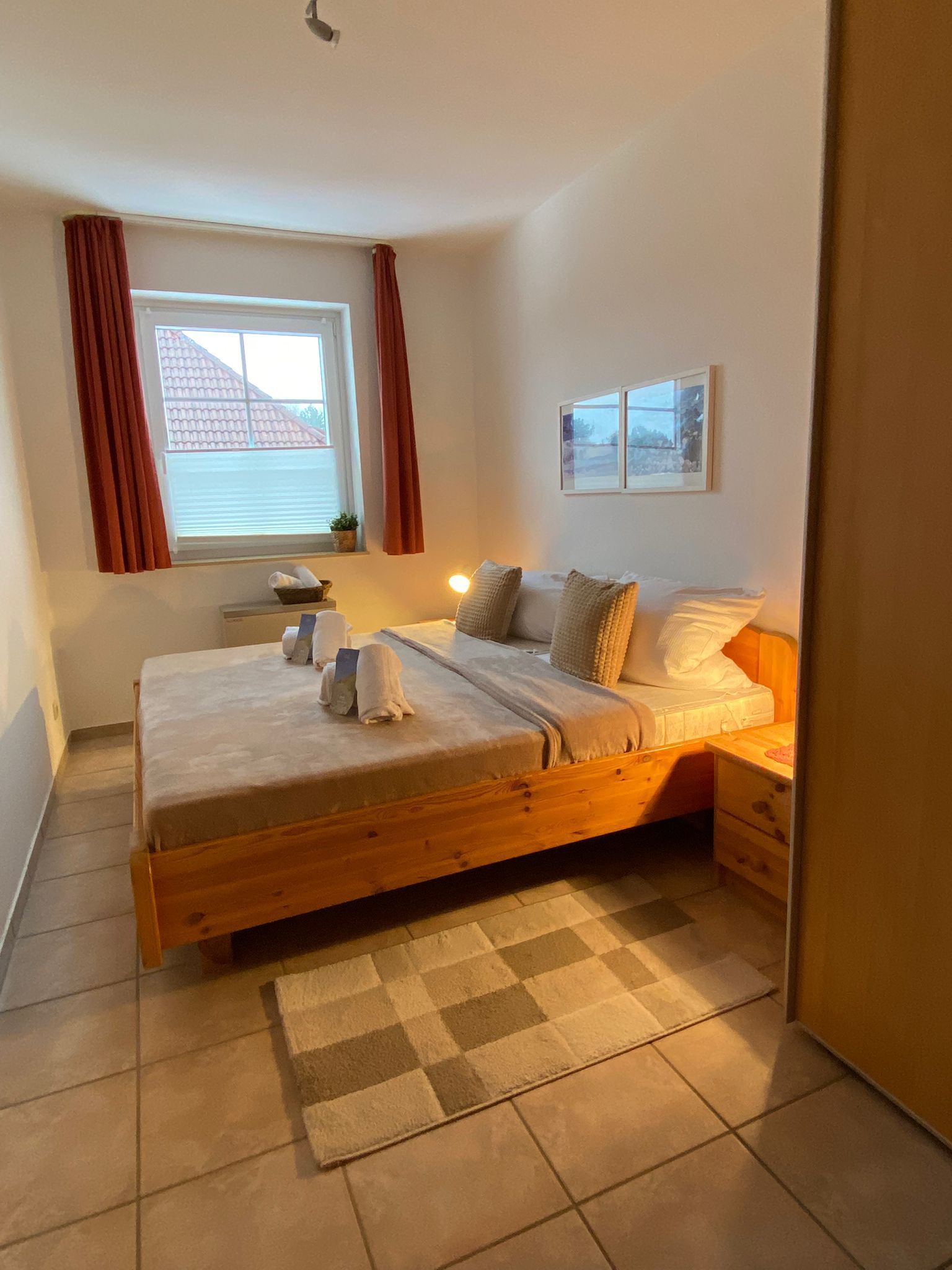 Unsere gemütlich und komplett eingerichtete Ferienwohnung befindet sich in der 1. Etage, bestehend aus drei Zimmern mit ca. 51 m² Wohnfläche und Balkon. Sie bietet Platz für bis zu 4 Personen. Die Einbauküche ist vollständig eingerichtet: 4-Platten-Ceran-Elektroherd, Backofen, Mikrowelle, Geschirrspüler, Kühlschrank, Kaffeemaschine, Geschirr, Besteck, usw. Der Wohnraum hat LCD-TV, DVD-Player, Mini-Hifi-Anlage, Essplatz und eine gemütliche Sitzecke. Für schlechtes Wetter stehen eine Spielesammlung und Bücher zur Verfügung. Im Elternschlafzimmer befindet sich ein großer Kleiderschrank und ein weiteres TV-Gerät.
