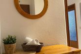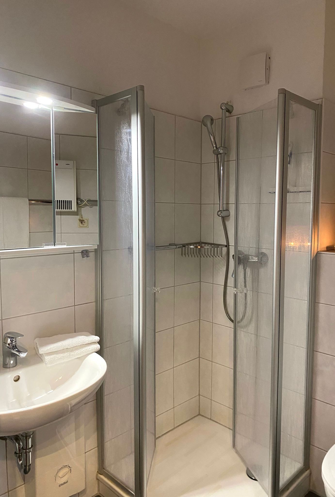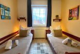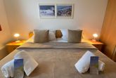 Das Kinderzimmer hat zwei getrennte große Betten, die auch für Erwachsene geeignet sind. Das funktionell eingerichtete Bad besteht aus Dusche, WC und Waschbecken. Die Wohnung ist komplett gefließt. In den Schlafräumen und unter der Sitzecke befinden sich Läufer bzw. ein Teppich.