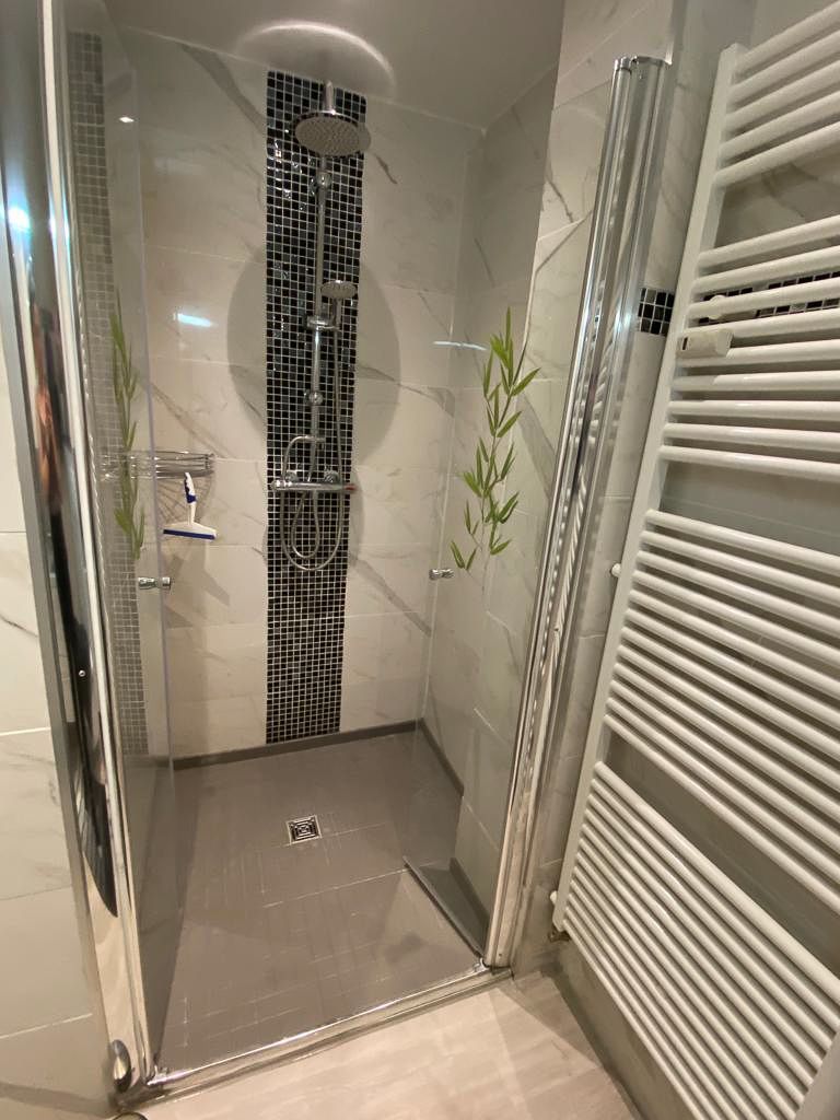 Badezimmer mit Dusche, Waschtisch und WC