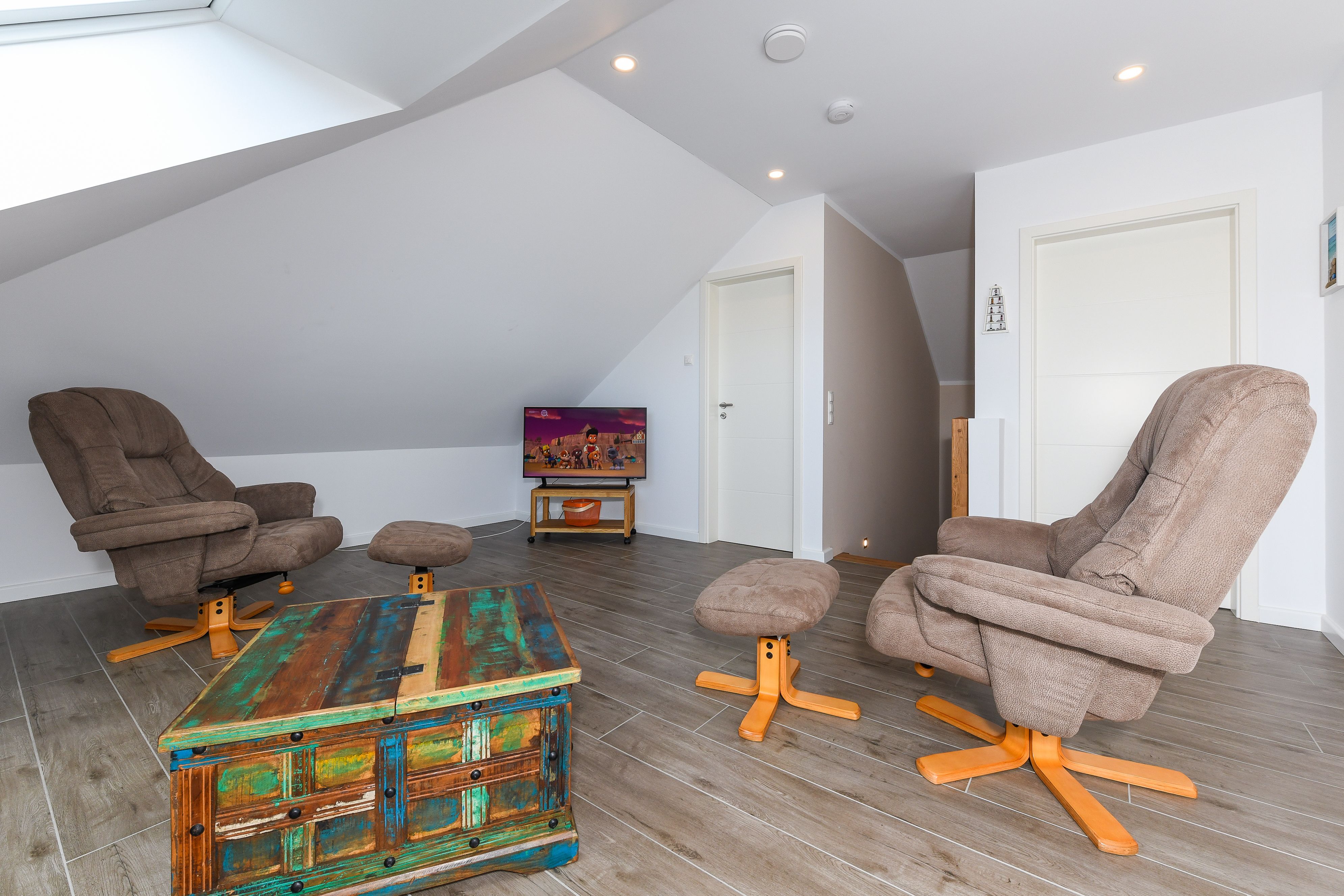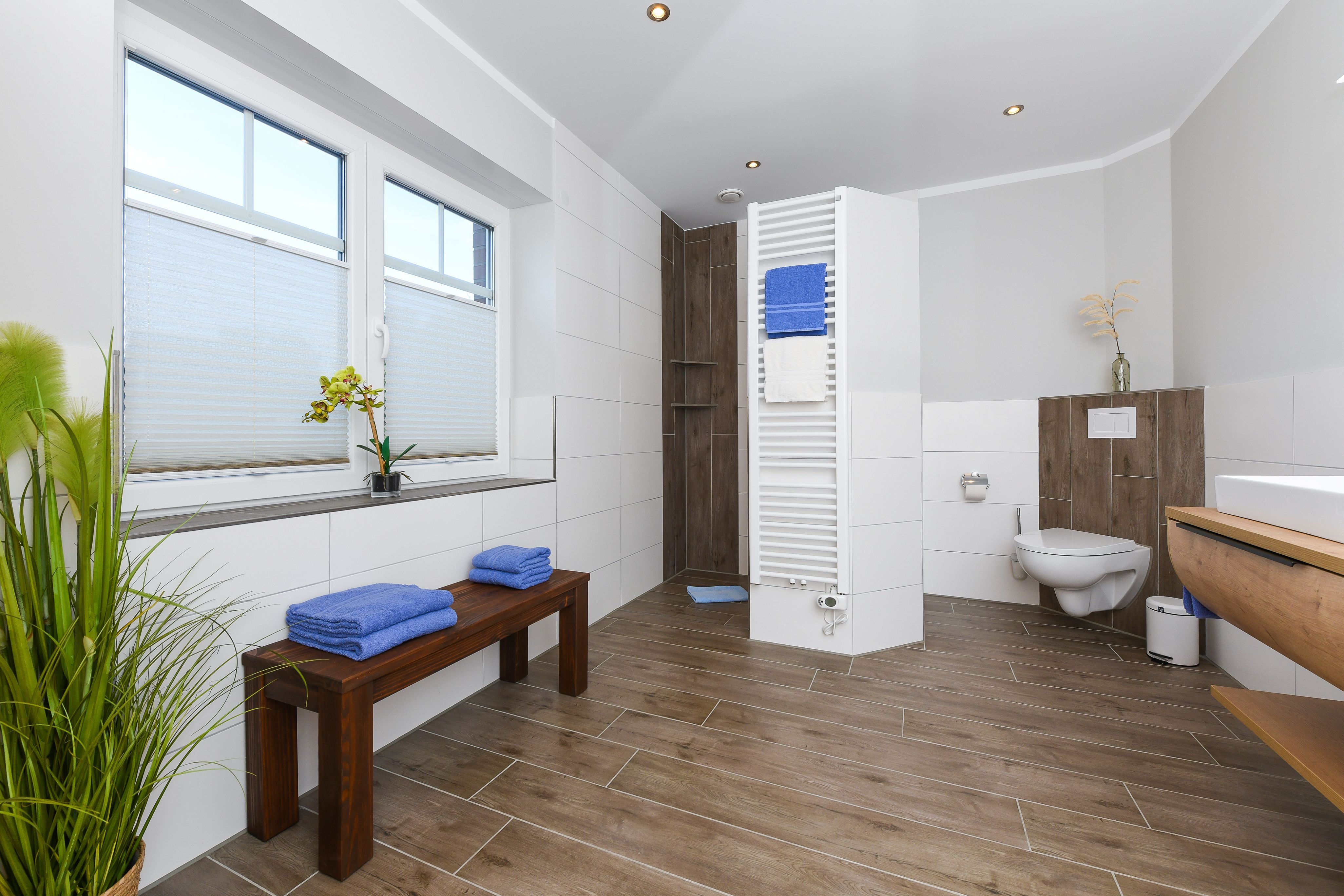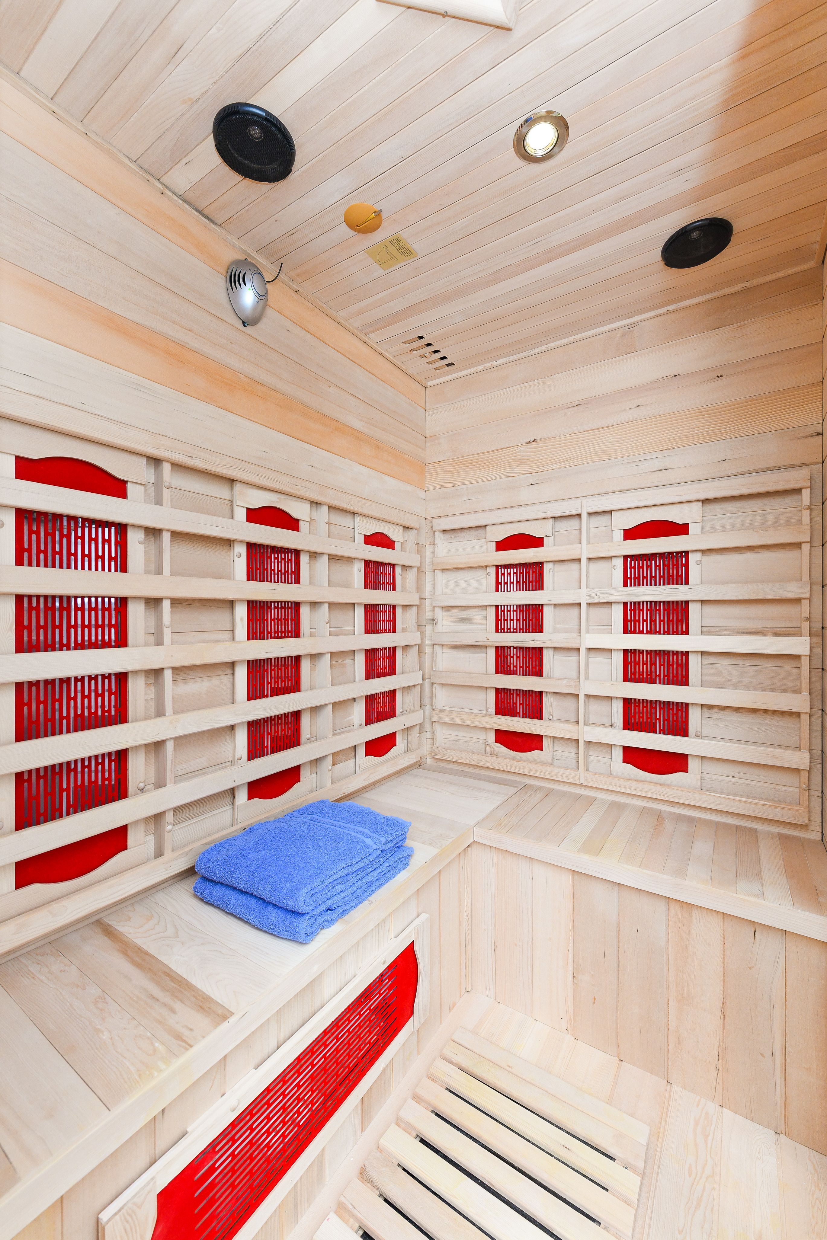 Ein ganz besonderes Highlight ist das Badezimmer im Erdgeschoss. Hier gibt es eine Infrarot-Sauna, die bequem 2 Personen Raum zur Entspannung bietet.