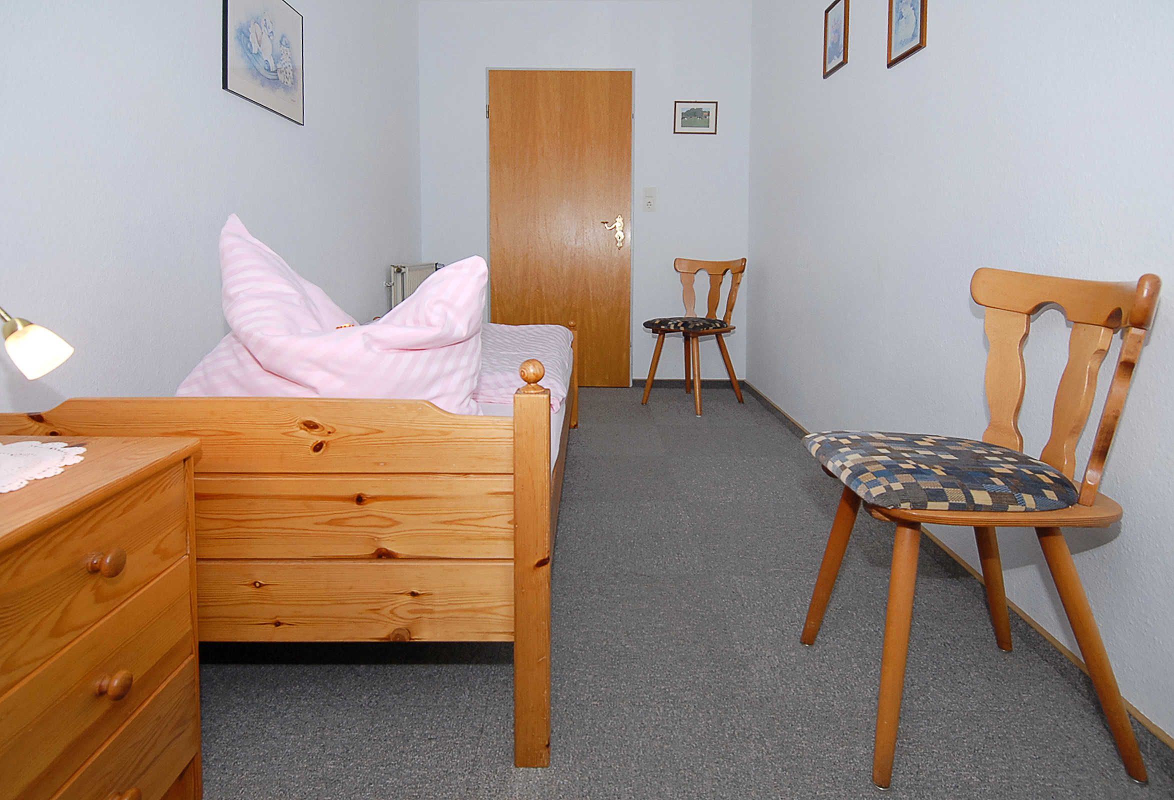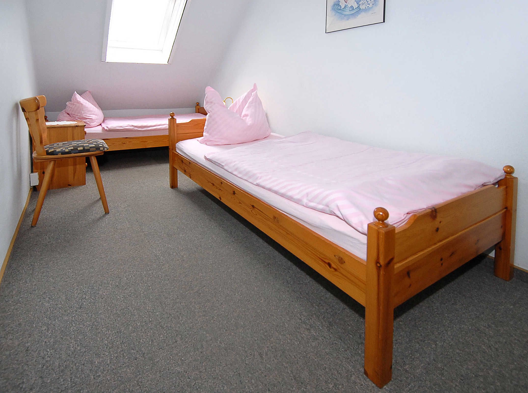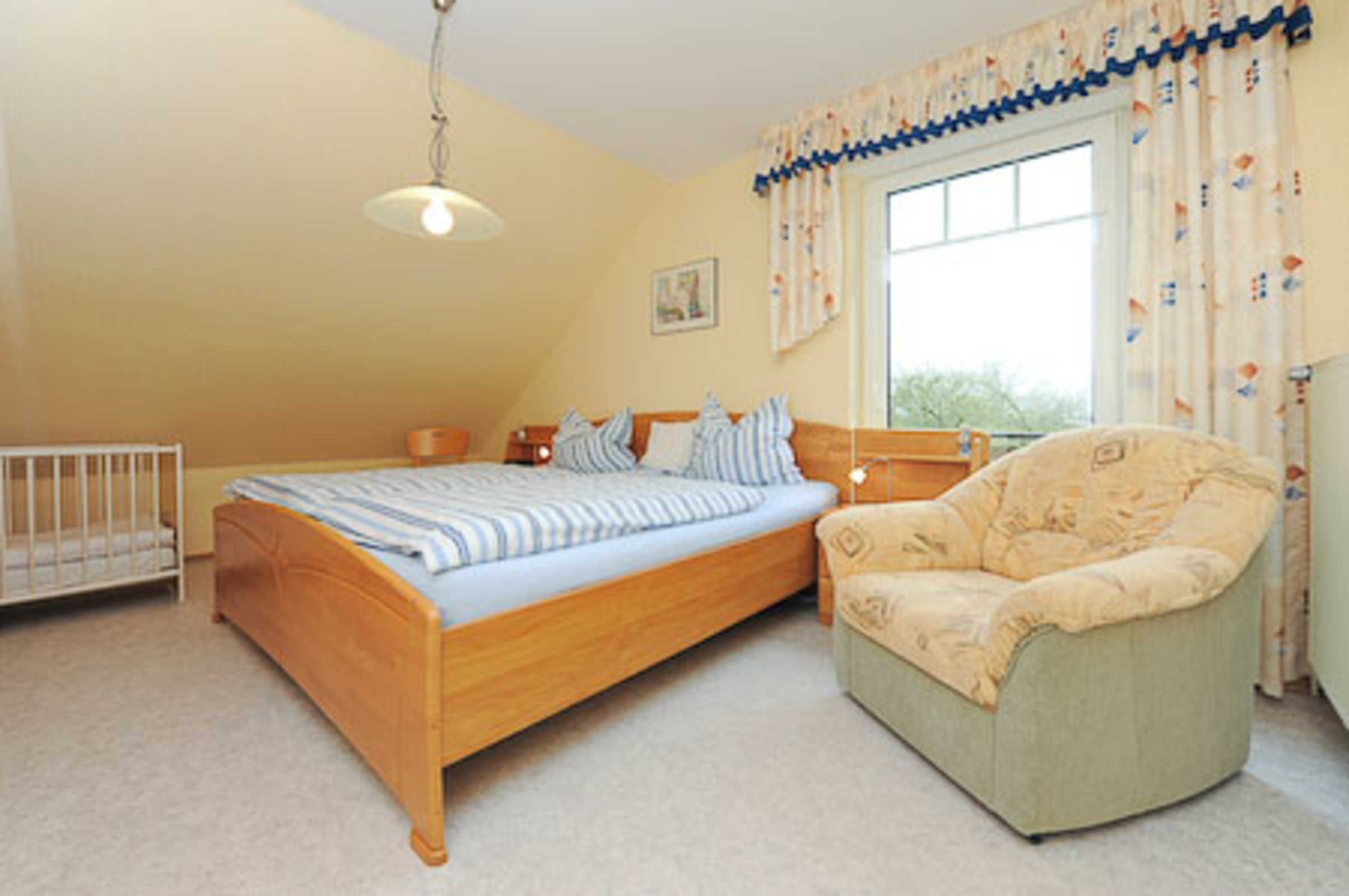 Größe ca. 70 Quadratmeter, Wohnraum mit integrierter Küche, Schlafzimmer, zweites separates Schlafzimmer/Kinderzimmer, Badezimmer mit Dusche, Waschtisch und WC, Obergeschoss, Balkon, optimal für 2 bis 4 Personen.
