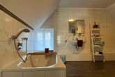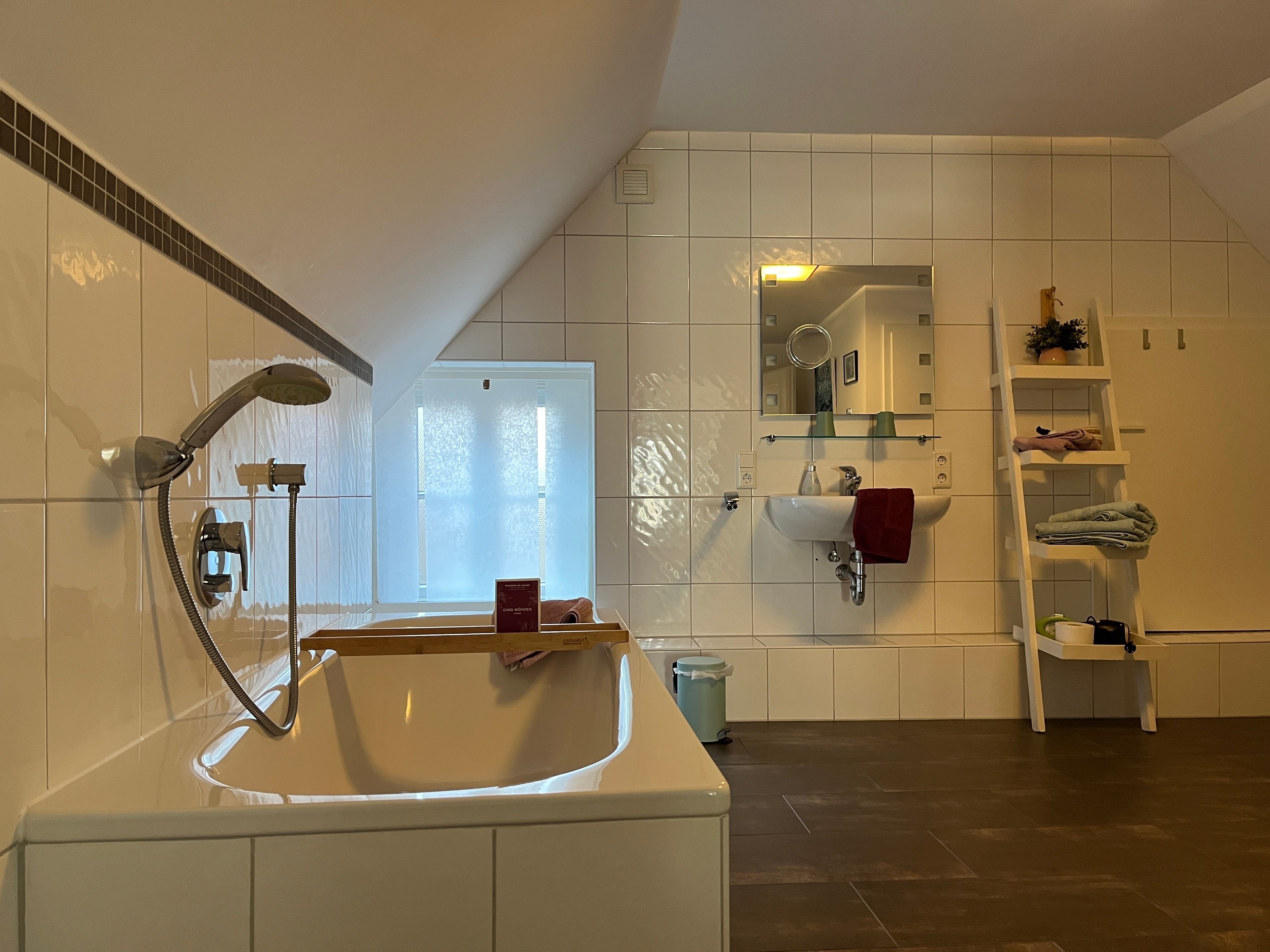 Über eine Holztreppe gelangen Sie zum Obergeschoss. Hier erwartet Sie ein großes Wannenbad und ein Schlafzimmer mit einem Doppelbett (2 x 0,90m x 2,00m). Ein Kinderbett kann zugestellt werden.