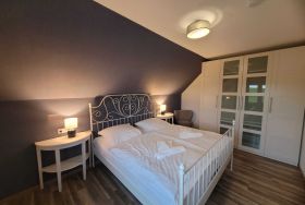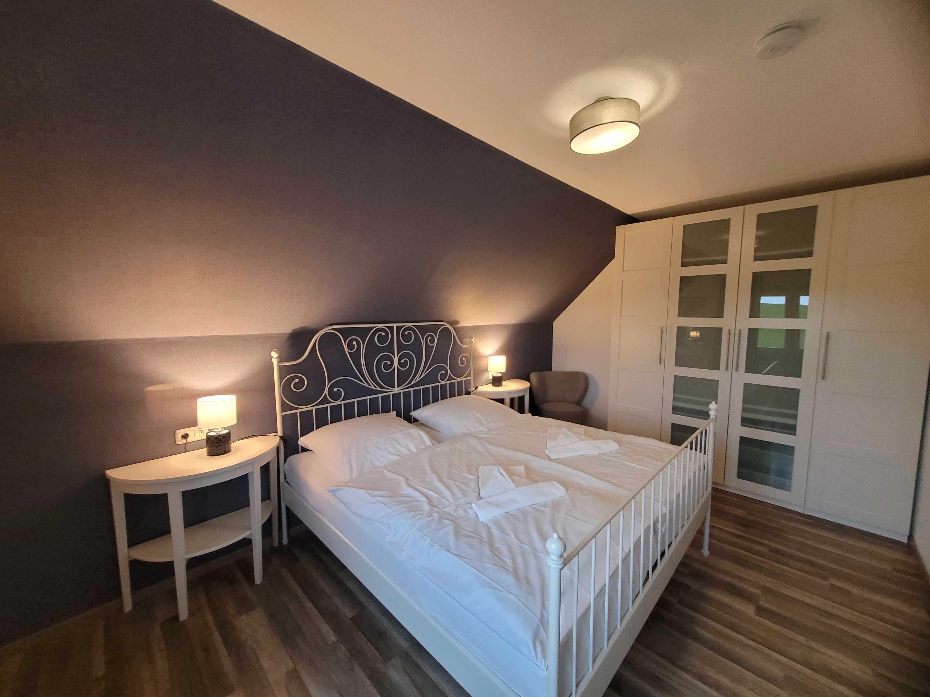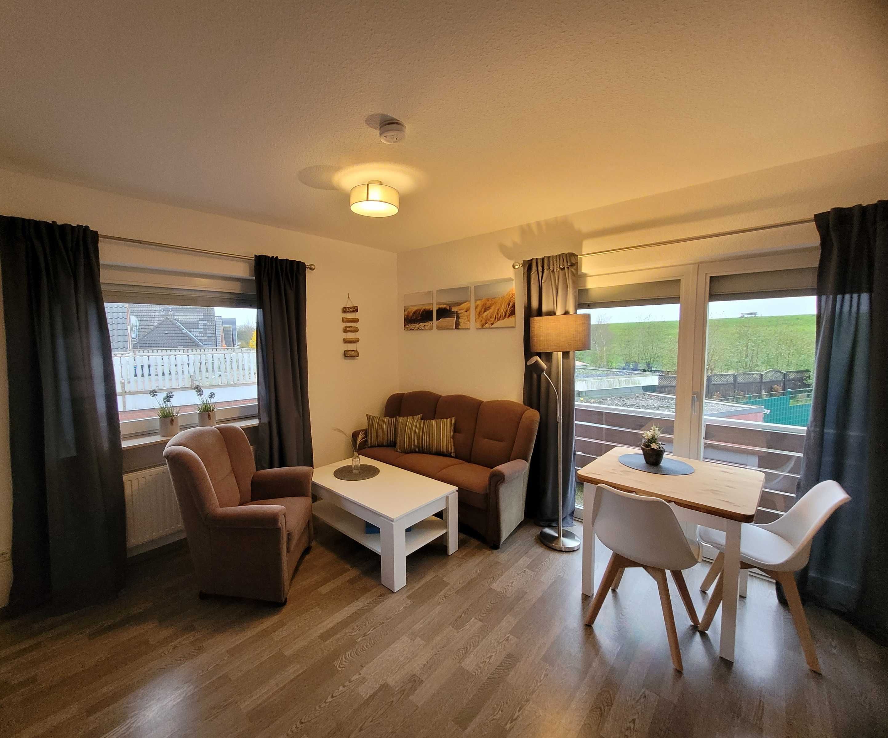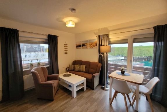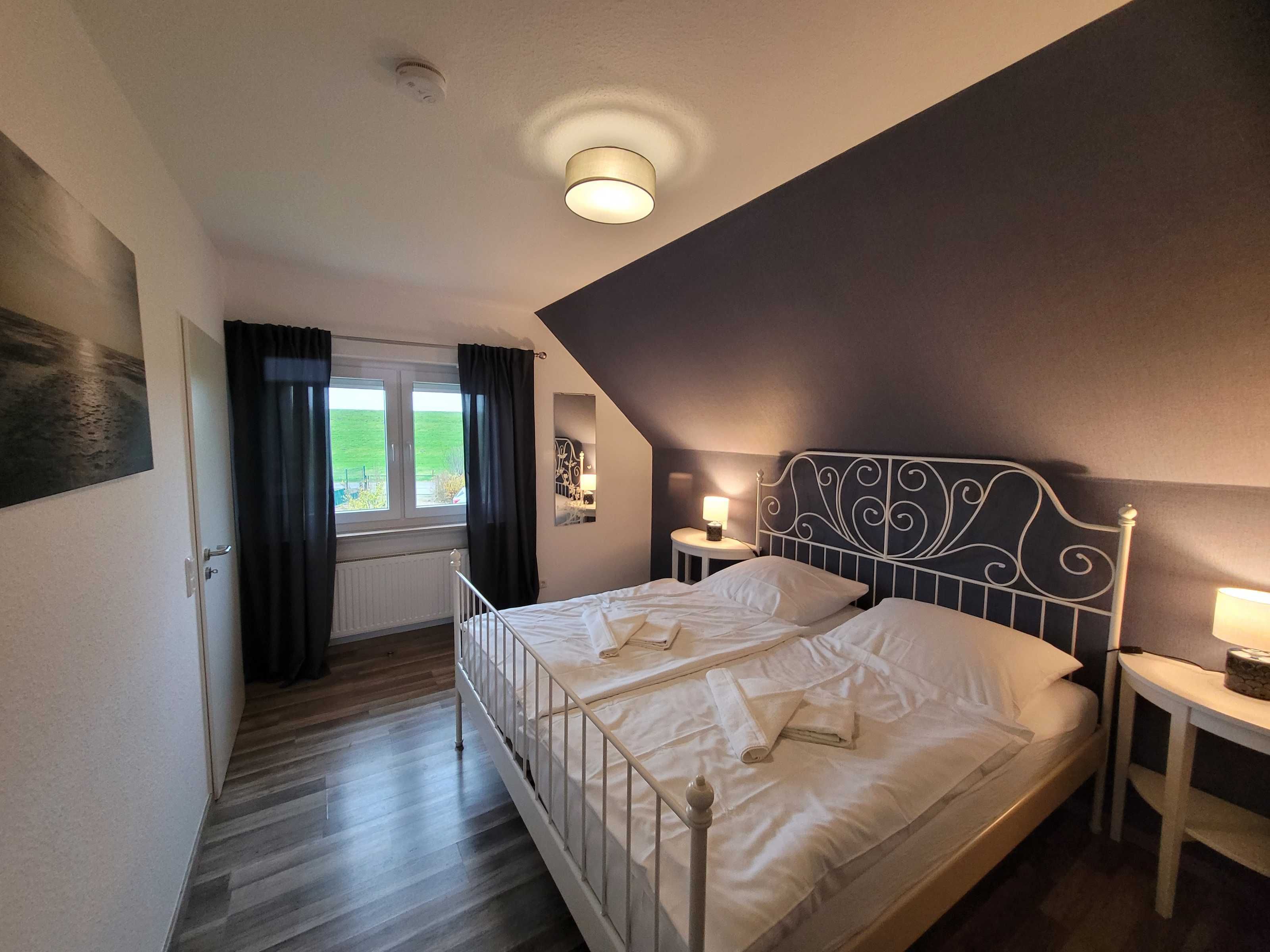 Außerdem haben Sie vom vorhandenen Balkon einen Blick in unseren Garten sowie auf den Deich und können den Sonnenuntergang von dort aus genießen.