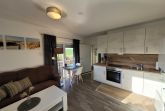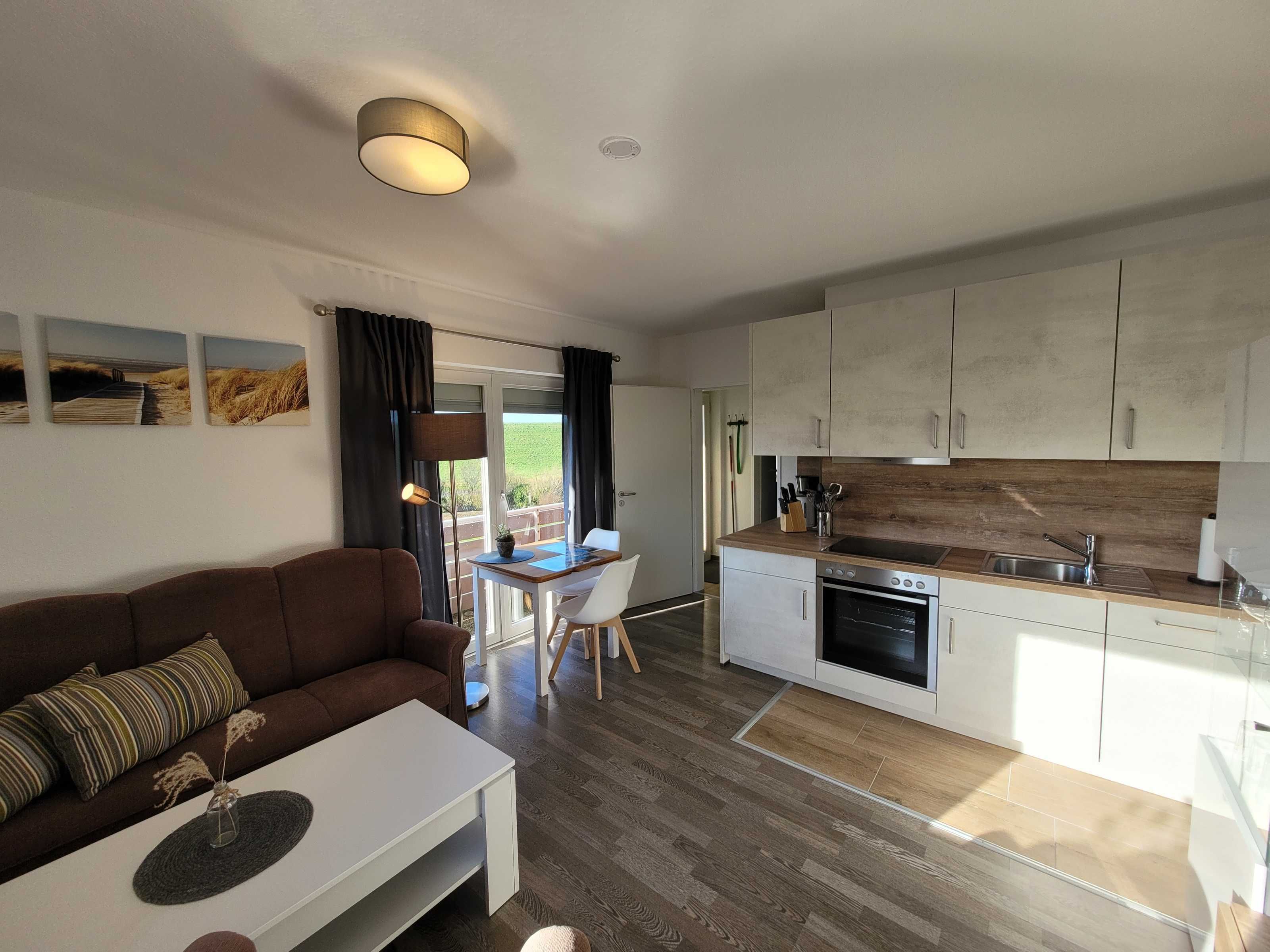 1 Schlafzimmer mit 1 Doppelbett und Bettwäsche, Wohnküche mit Sitzbereich, 1 Badezimmer