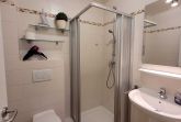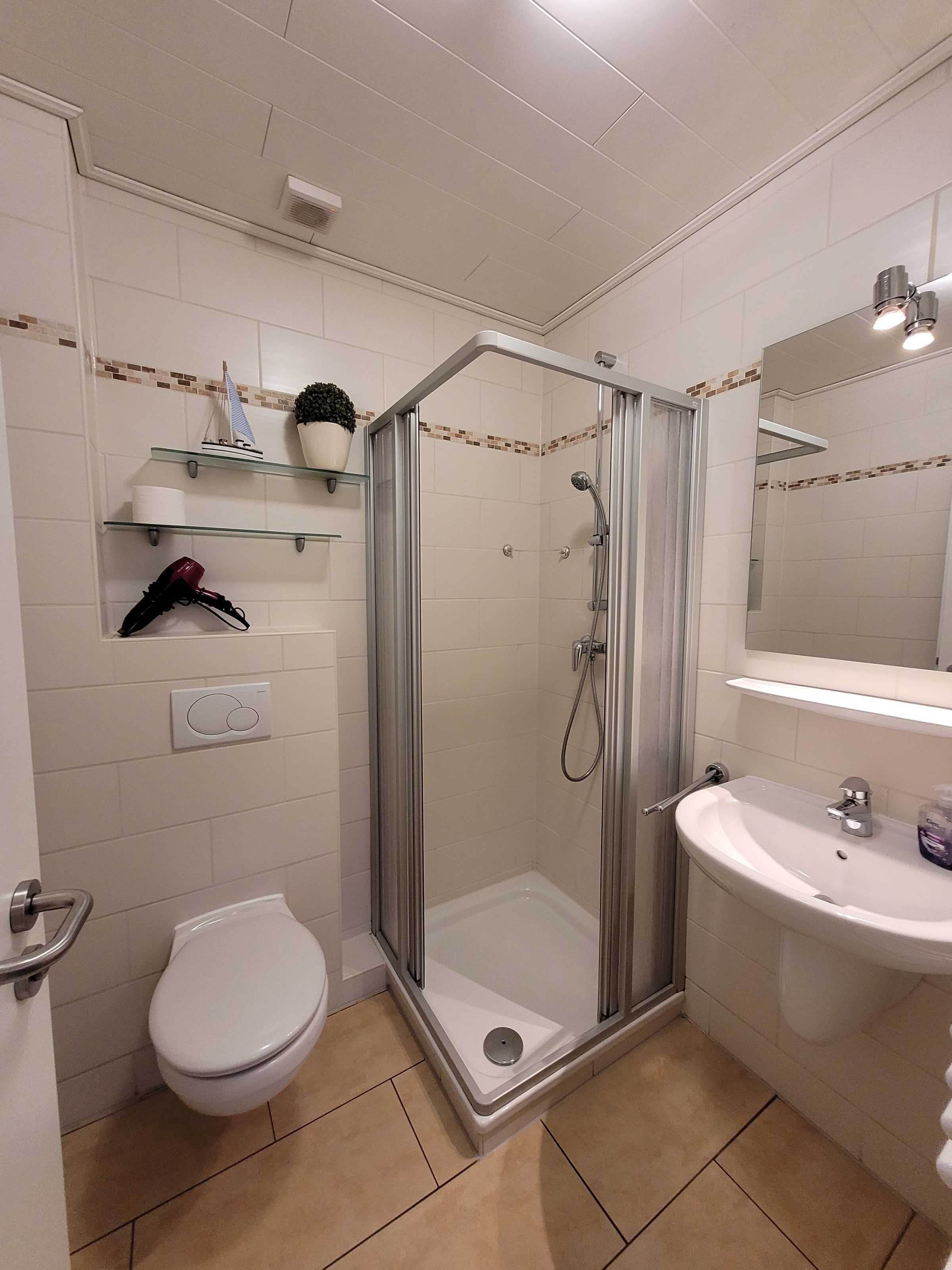 Dusche, WC, Handtücher, Haartrockner und Toilettenpapier
