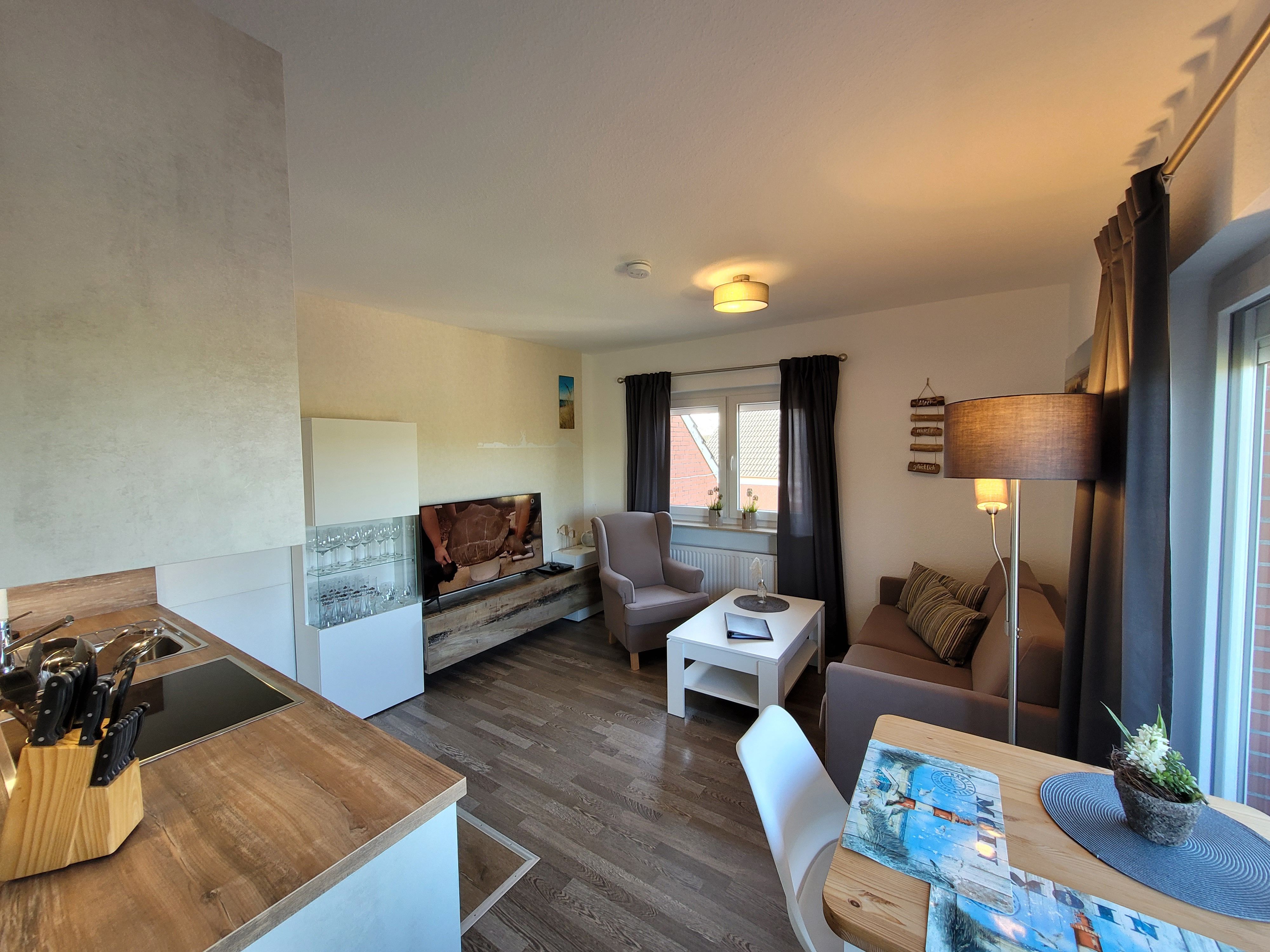 Die Fewo verfügt über ein Schlafzimmer mit Bettwäsche, ein Badezimmer mit Handtüchern und Fön, einen Flachbild-Smart-TV/extra DVD-Player und eine voll ausgestattete offene Küche mit integrierter Spülmaschine und separaten Essbereich.