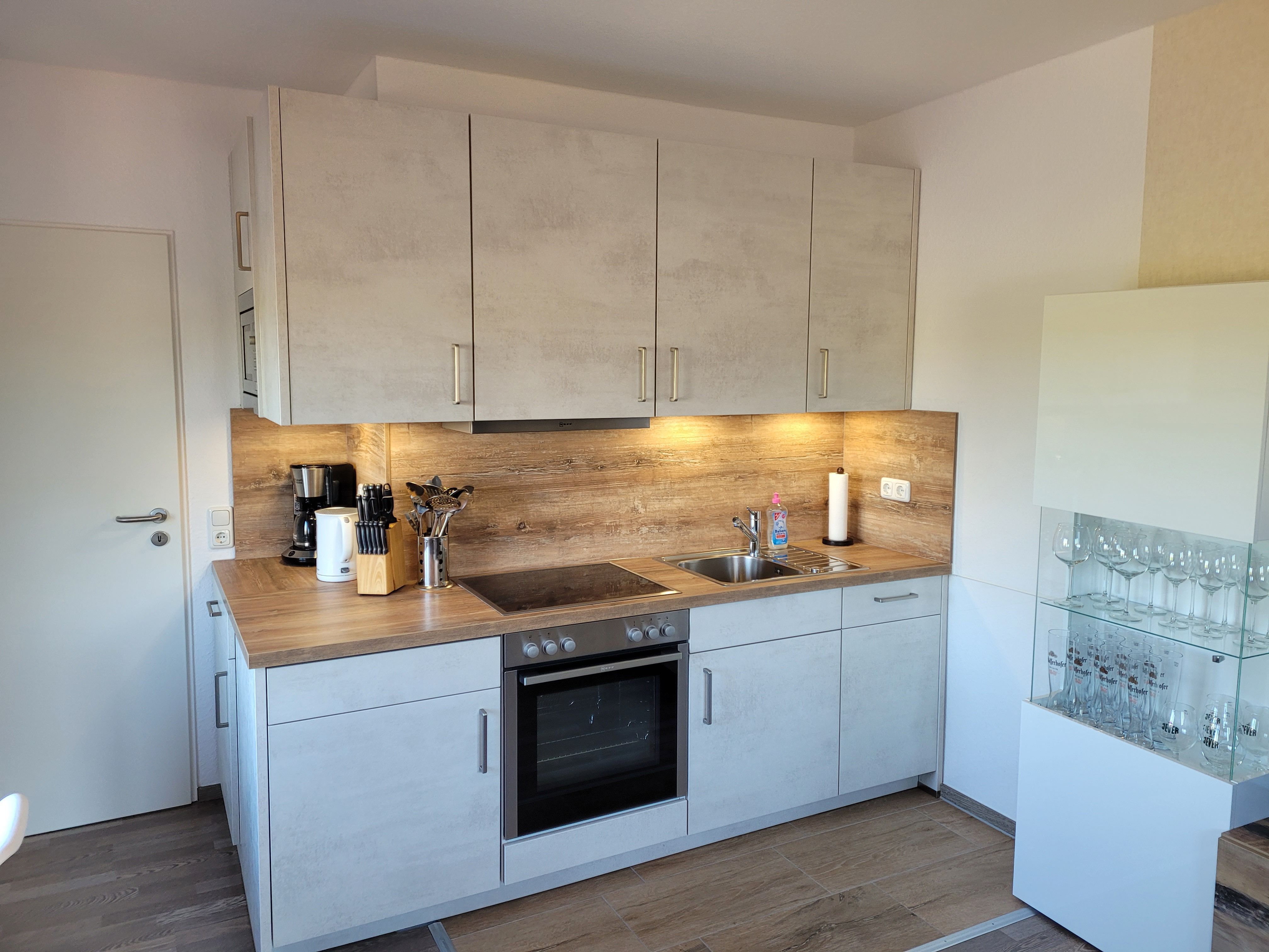 Kühlschrank, Mikrowelle, Kaffeemaschine, Wasserkocher, Herdplatte, Küchenutensilien, Toaster, Spülmaschine, Esstisch und Backofen