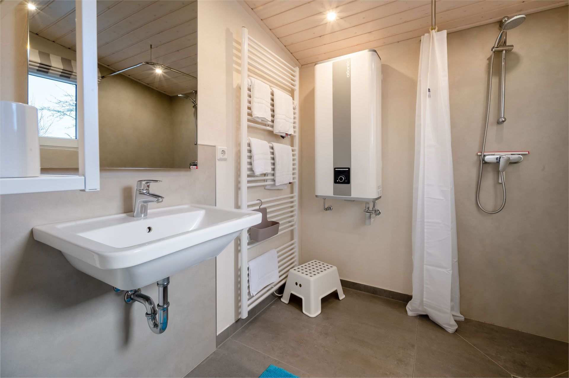 Das Schlafzimmer verfügt über ein Doppelbett (180x200cm) und ein weiteres Schlafzimmer mit ausziehbarem Doppelbett (160x200cm) sorgen für angenehmen Schlafkomfort für bis 4 Personen. Ein schönes Duschbad mit ebenerdiger Dusche, Fön, hängendem WC und beheiztem Handtuchwärmer bieten modernes Urlaubswohngefühl. Ein eigener PKW-Stellplatz, der mit dem Namen des Hauses gekenzzeichnet ist und Waschmaschine/Trockner im Gemeinschaftsserviceraum stehen ebenfalls zur Verfügung. Fahrräder können geschützt abgestellt werden. EIne Erstausstattung an Bettwäsche und Handtüchern kann optional für 20€ pro Person hinzugebucht werden.