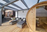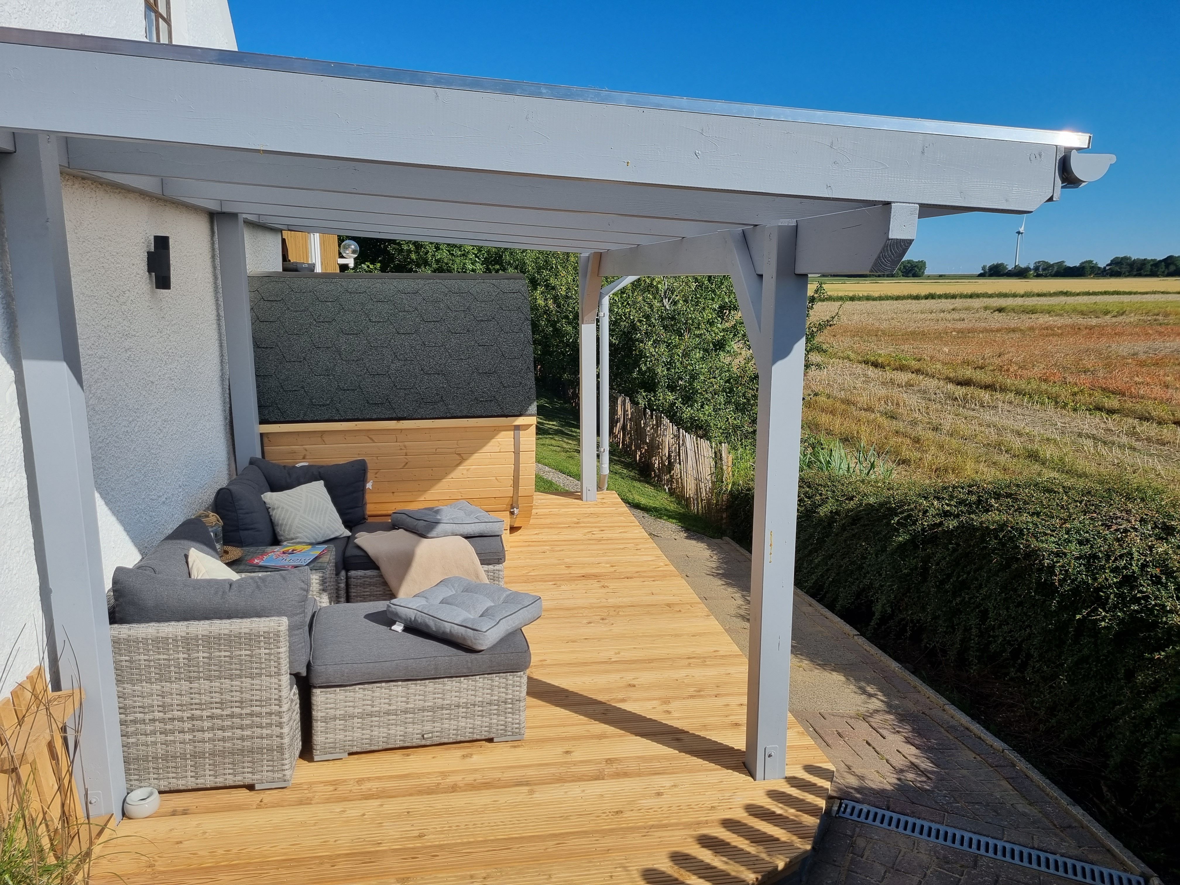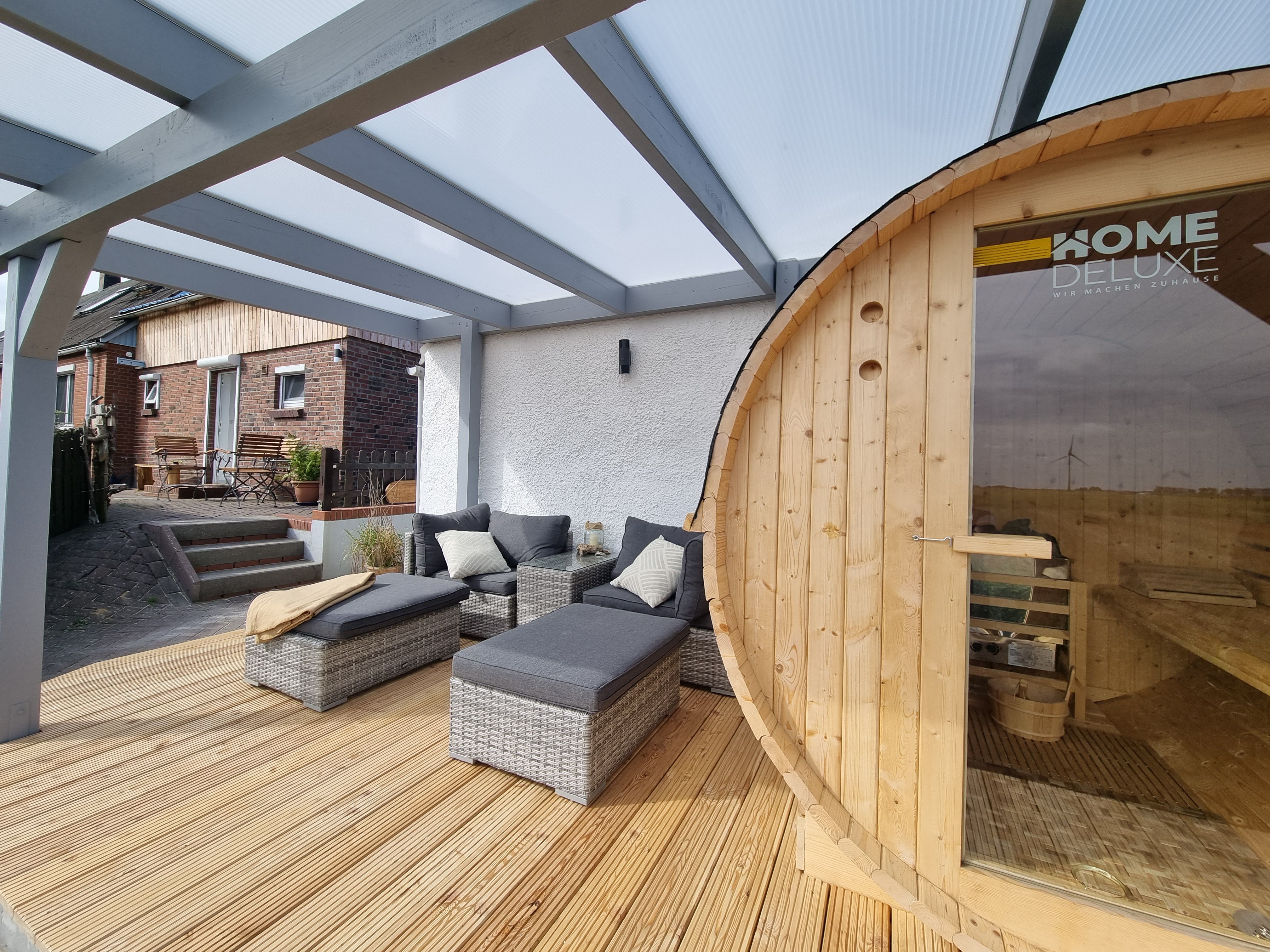 Der Bullaugen-Strandkorb des Gartens auf dem insgesamt ca. 800 m² großen Grundstück, in dem man geschützt sitzt und gleichzeitig den Blick über den Deich schweifen lassen kann, lädt zum Entspannen ebenso ein wie die Terrasse und die Fass-Sauna! im Garten.