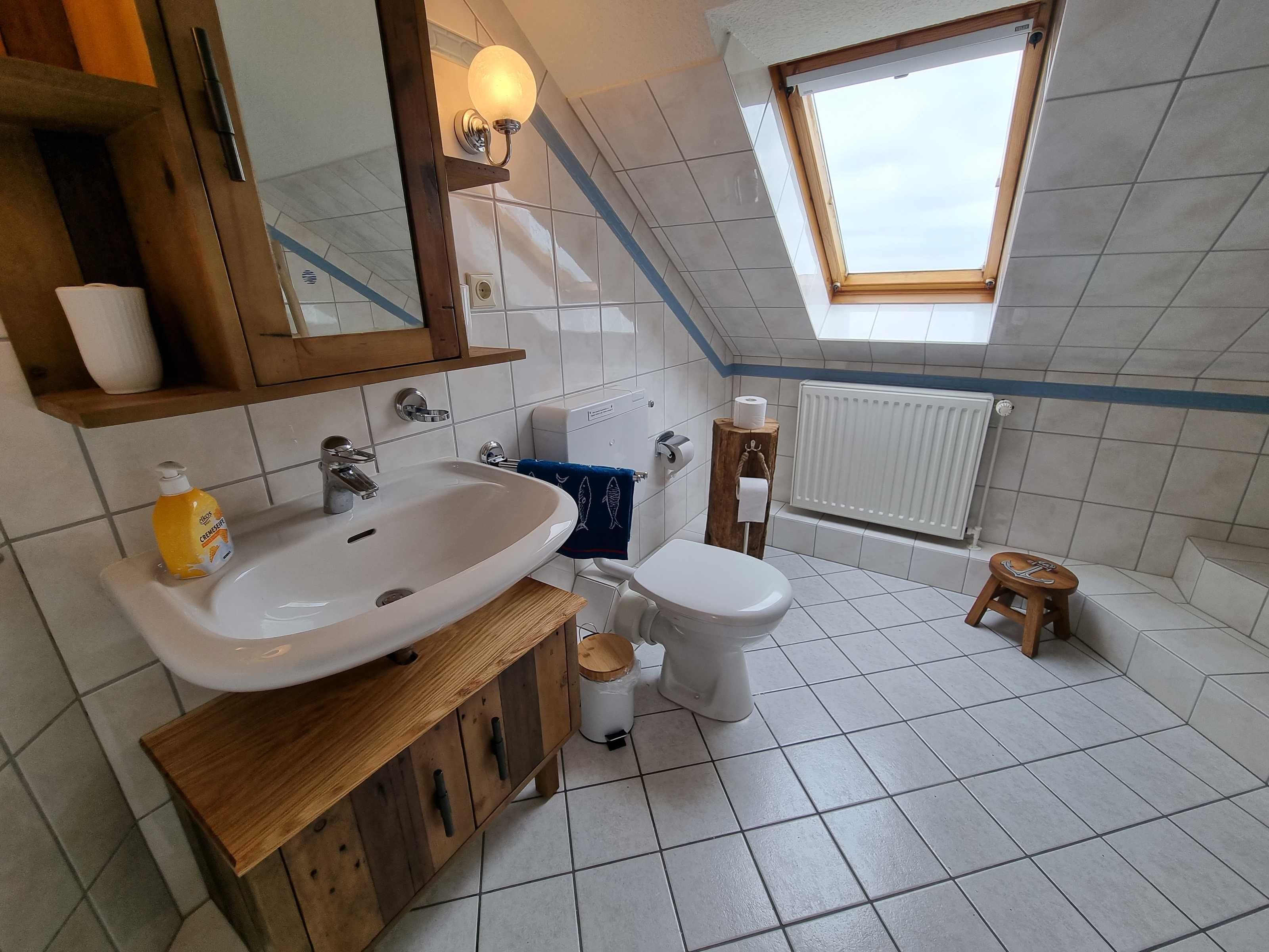 Es verfügt außerdem über 2 geräumige Bäder, je mit WC (1 pro Etage, unten mit Badewanne, oben mit Dusche).
