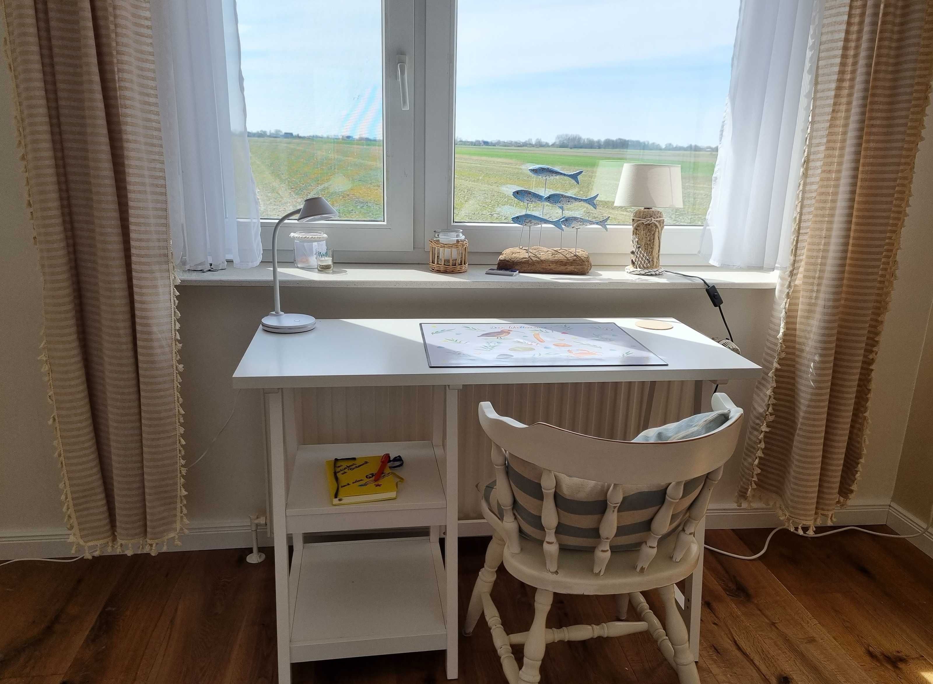 bevor es weitergeht zur Leseecke, dem Schreibtisch mit Weitblick über die Felder Nordstrands und dem runden ausziehbaren Esstisch mit ausladender Couch-Landschaft, die man bei Bedarf auch zum Doppel-Bett umfunktionieren kann.