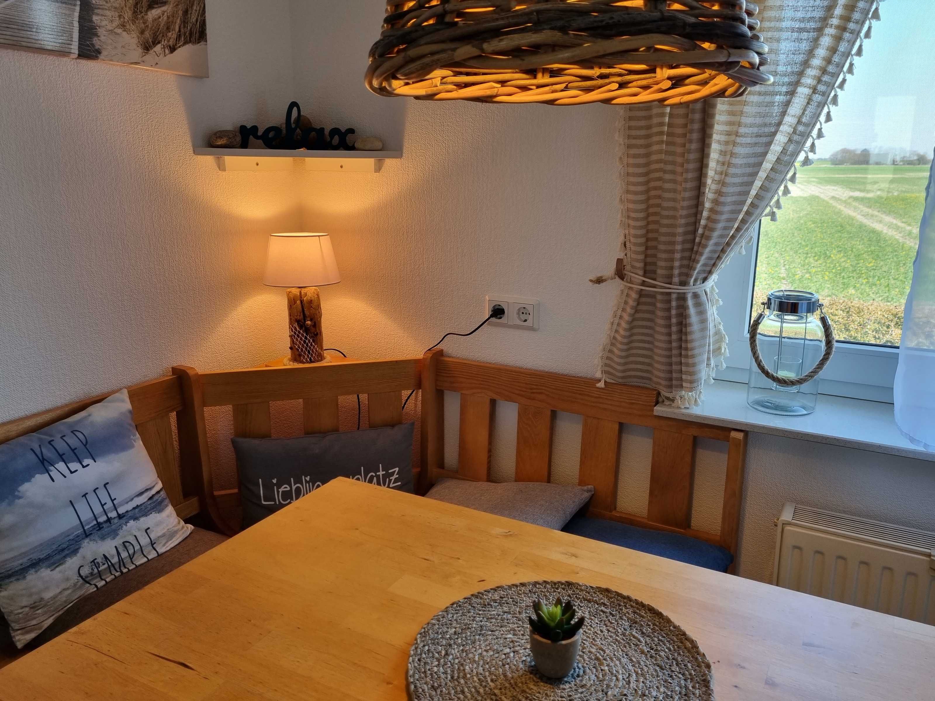 Über die einladende Diele, die schon Strand-Atmosphäre verbreitet, erreicht man die weiße Einbauküche mit gemütlicher Sitzecke samt Eckbank,
