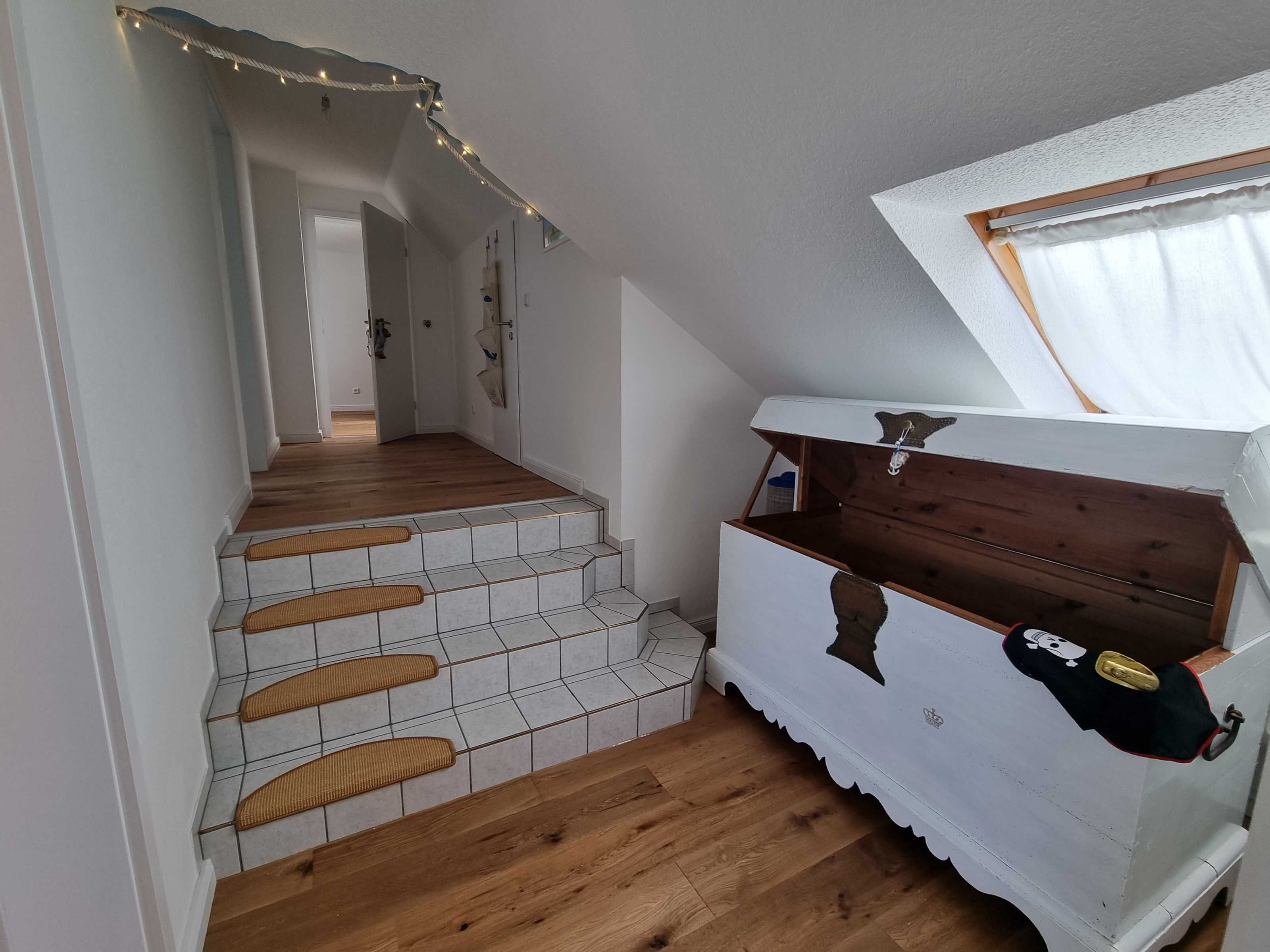 Ein wunderbares Versteck unweit der Nordsee bietet das Haus auf dem Hamburger Deich auch für seine kleinen Feriengäste mit dem „Piratennest“, einem kleinen Paradies für Kinder, das als eines der 2 „Schlaf-Gut-Zimmer“ im 1. OG als erstes der Zimmer auf sie wartet. Mit Piratenbetten und unzähligem Spielzeug.