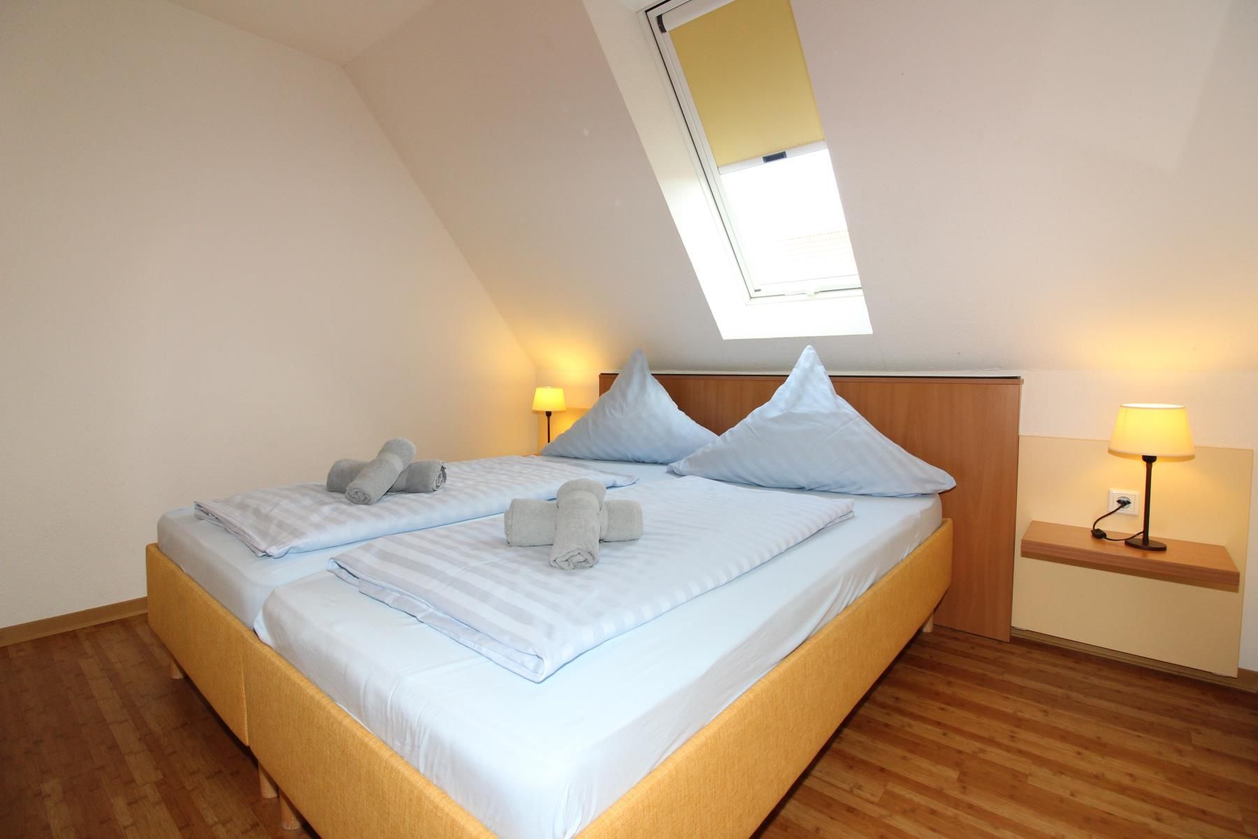 Im Obergeschoss befinden sich ein Schlafzimmer mit Doppelbett, TV-Gerät und Radiowecker sowie ein zweiter Schlafraum mit zwei Einzelbetten. Beide Zimmer verfügen über viel Stauraum. Ein seperates Kinderbett ist ebenfalls vorhanden. Sowohl im Erdgeschoss als auch im Obergeschoss befinden sich jeweils ein großzügiges Bad mit Dusche und WC und beleuchteten Spiegeln.