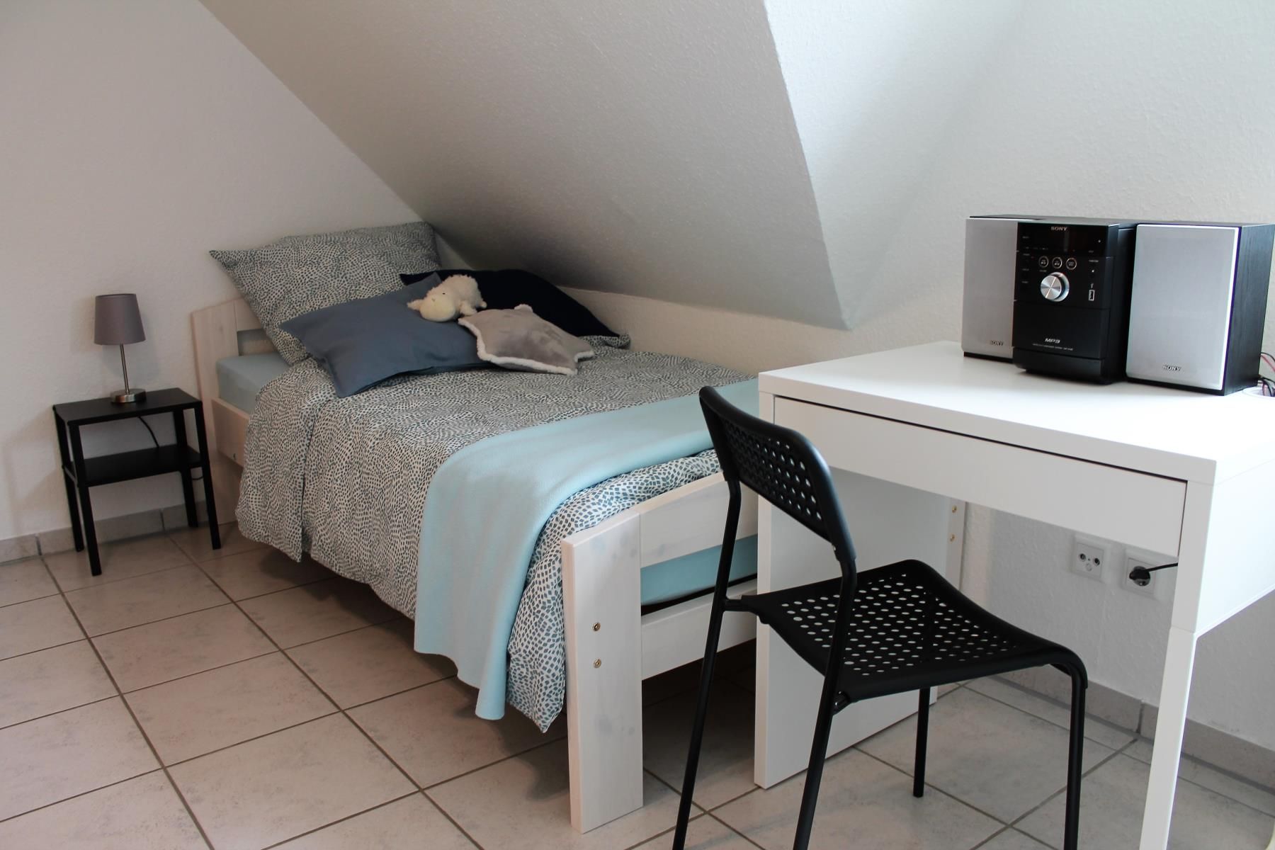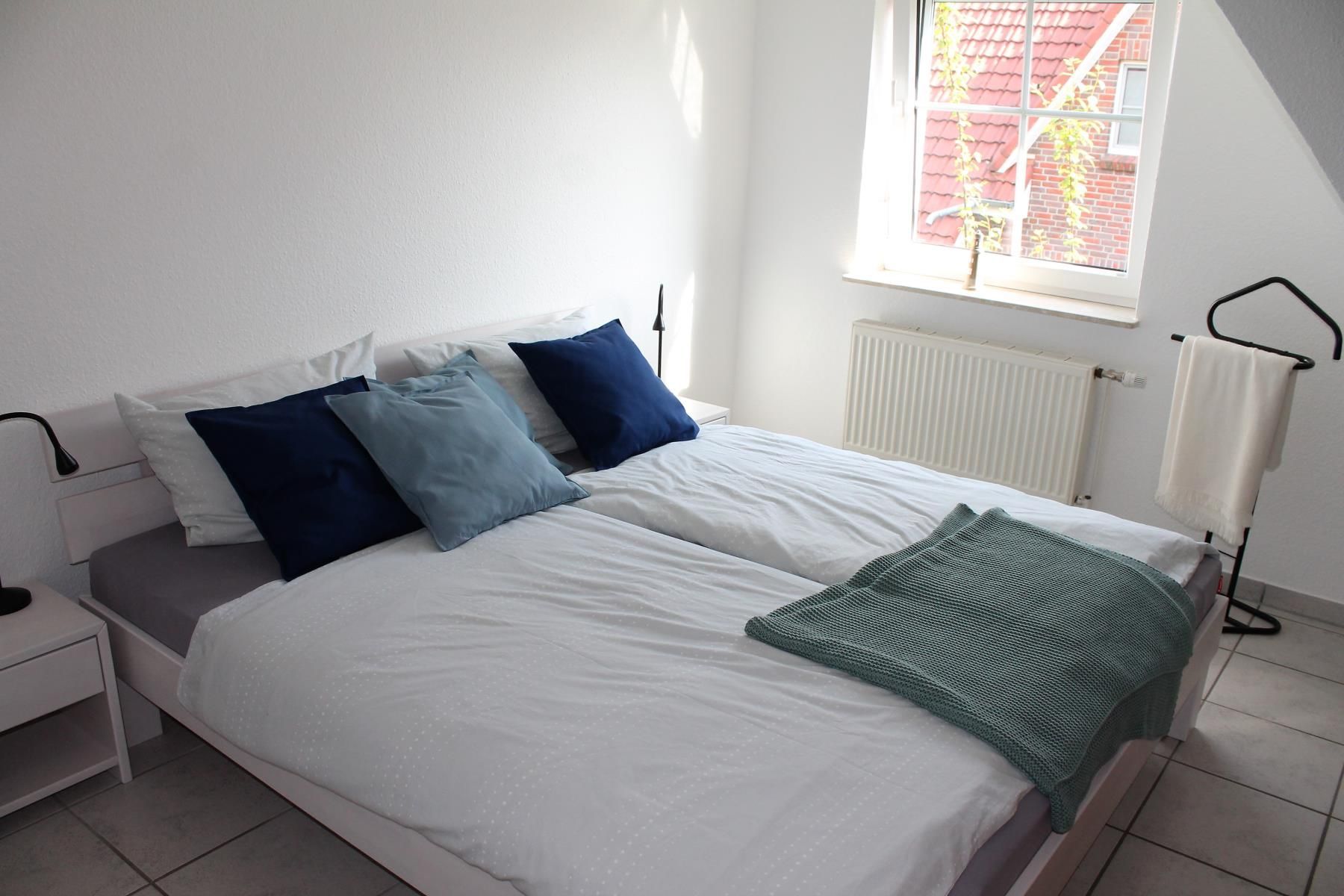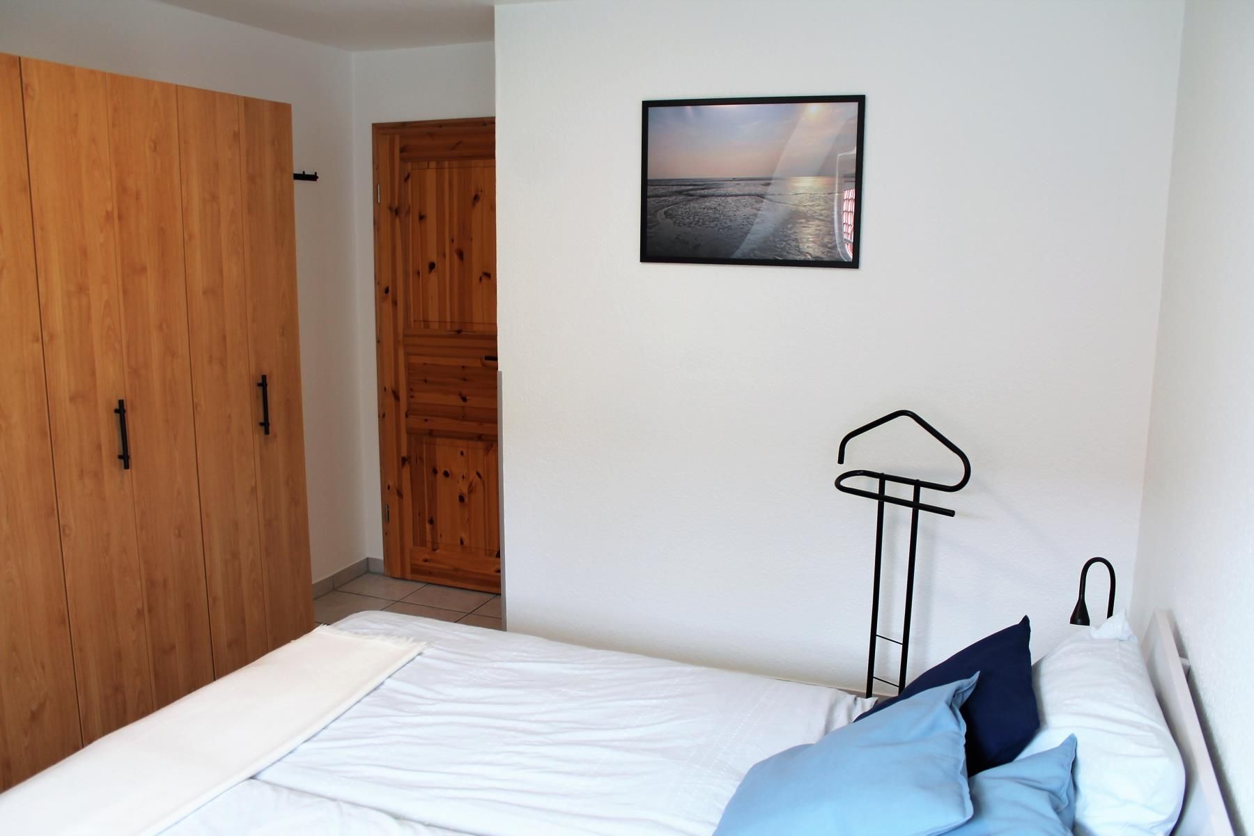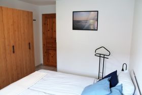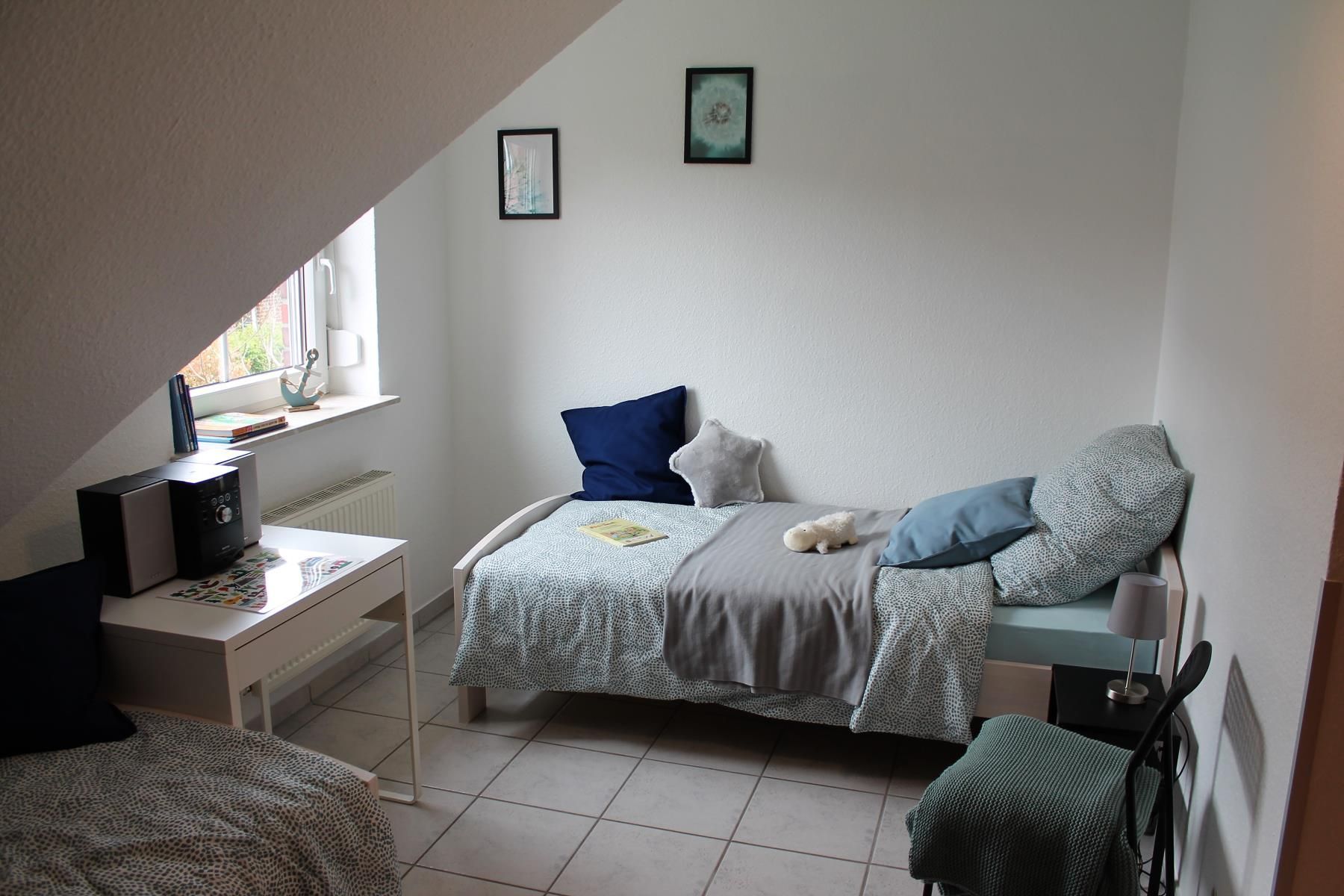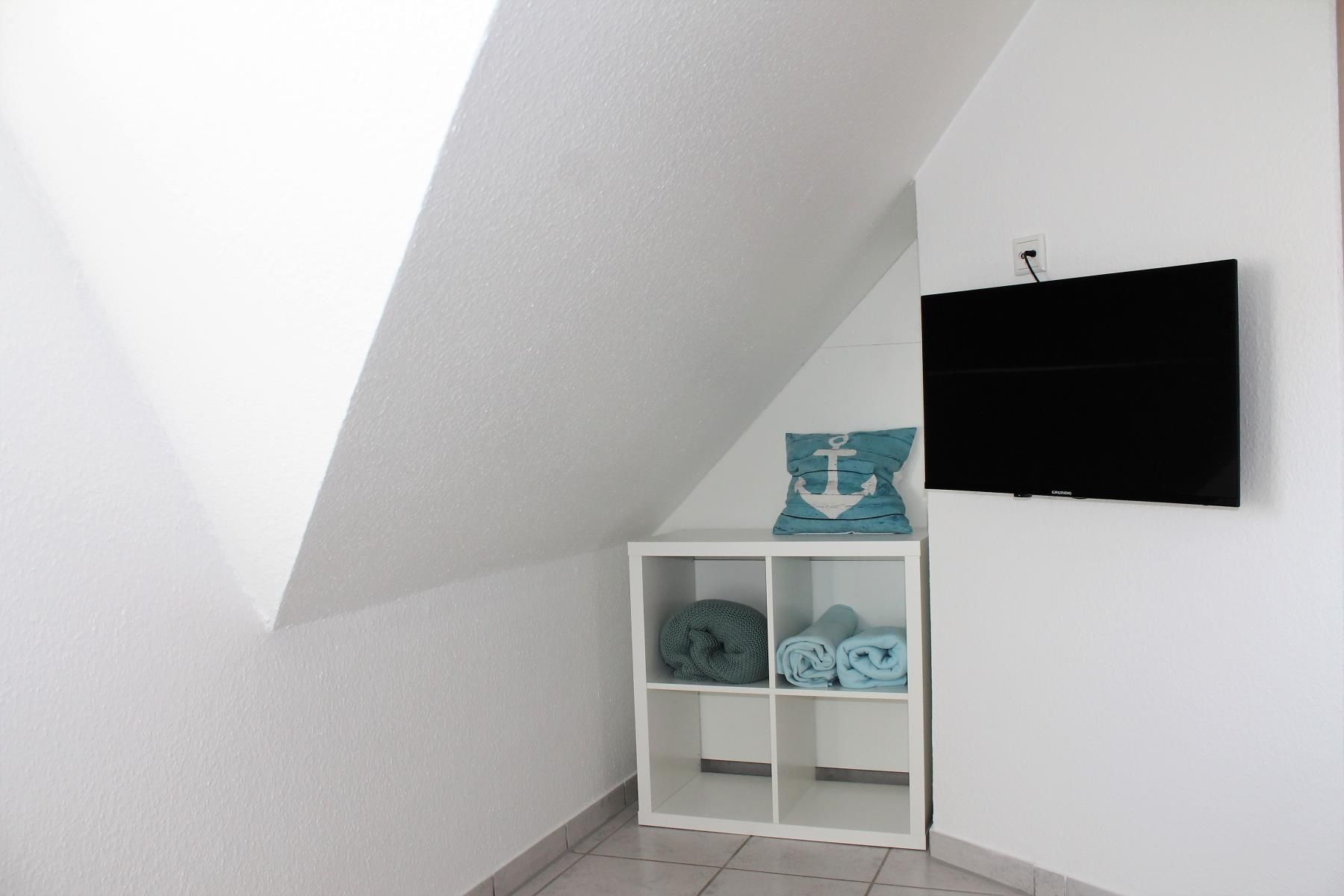 Im Obergeschoss haben wir ein Schlafzimmer mit Doppelbett (180 cm x 200 cm) und weiterem Flachbildbild-TV (32 Zoll) sowie ein Schlafzimmer mit zwei Einzelbetten (90 cm x 200 cm).