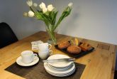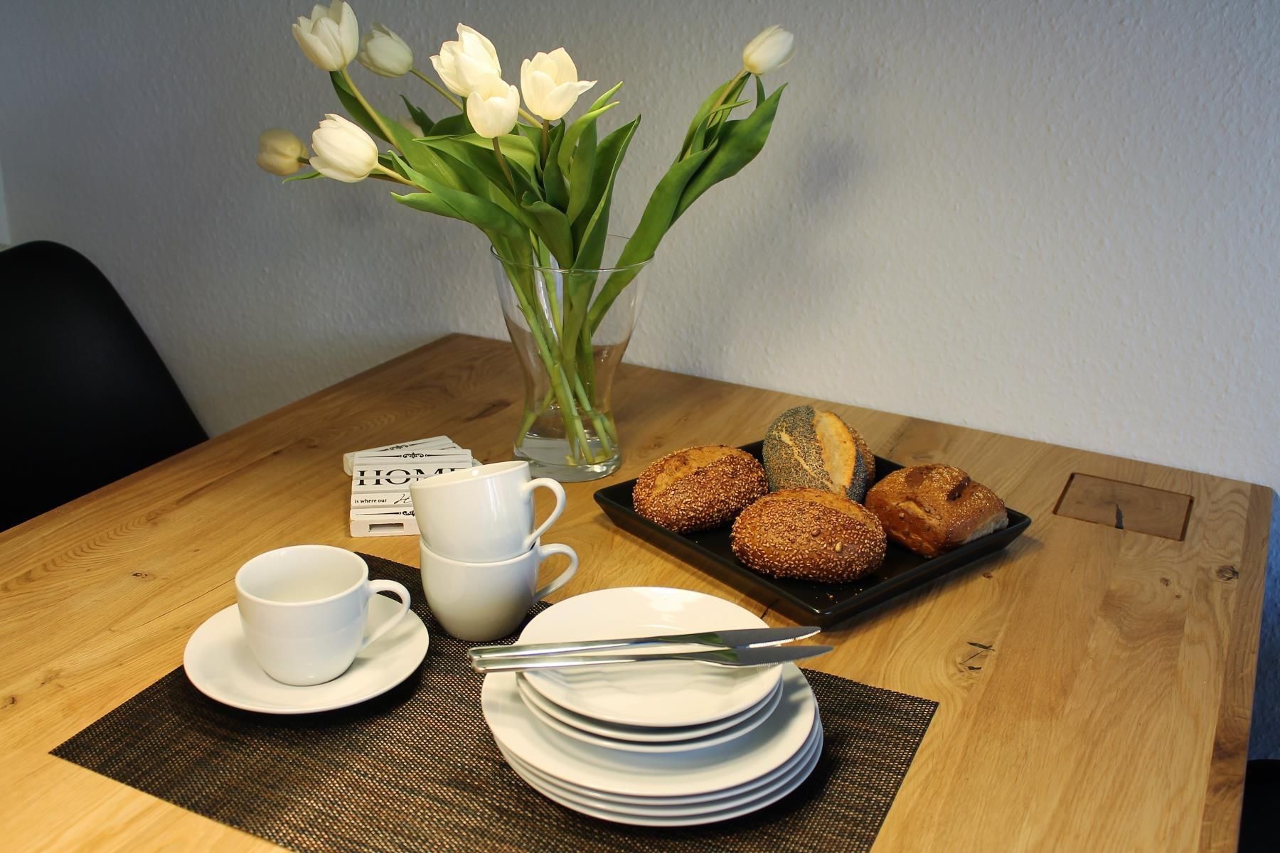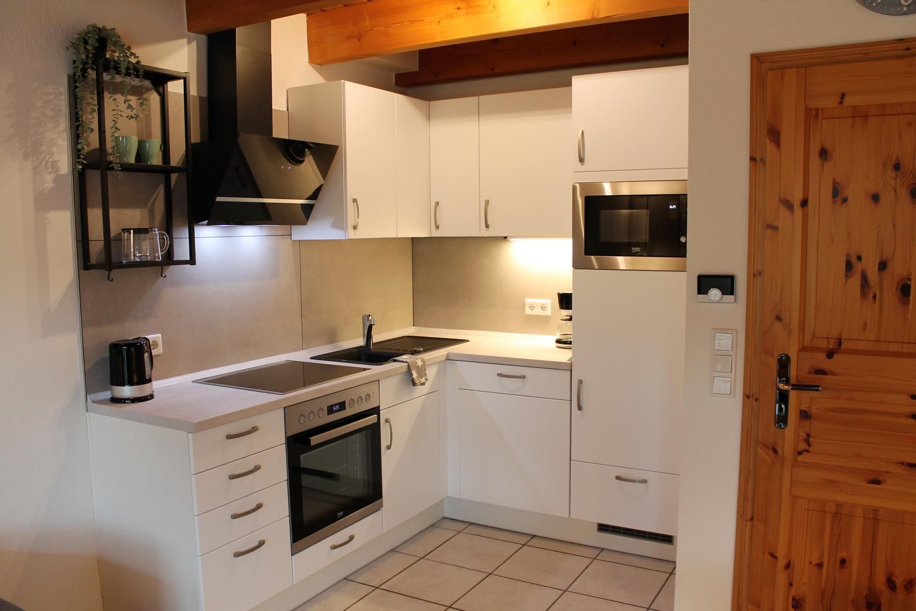 Die offene Küche ist mit allem ausgestattet, was Sie als Selbstversorger erwarten können. Ceranfeld, Backofen, Geschirrspüler, Mikrowelle, Kühlschrank mit Gefrierfach usw. Und natürlich ausreichend Geschirr, Besteck und viel weiteres Küchenzubehör (Kaffeemaschine, Wasserkocher, Toaster, Eierkocher, digitale Küchenwaage etc.). Hier macht das gemeinsame Kochen wirklich Spaß.