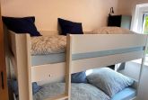 Weiter gibt es im Erdgeschoss ein Schlafzimmer mit Etagenbett (90 cm x 200 cm) und ein extra Gäste-WC mit Handwaschbecken und schickem Unterschrank, der viel Platz bietet. Der Abstellraum gleich an der Haustür ist u.a. mit Safe, Reinigungsutensilien, Bügelbrett und Bügeleisen ausgestattet.