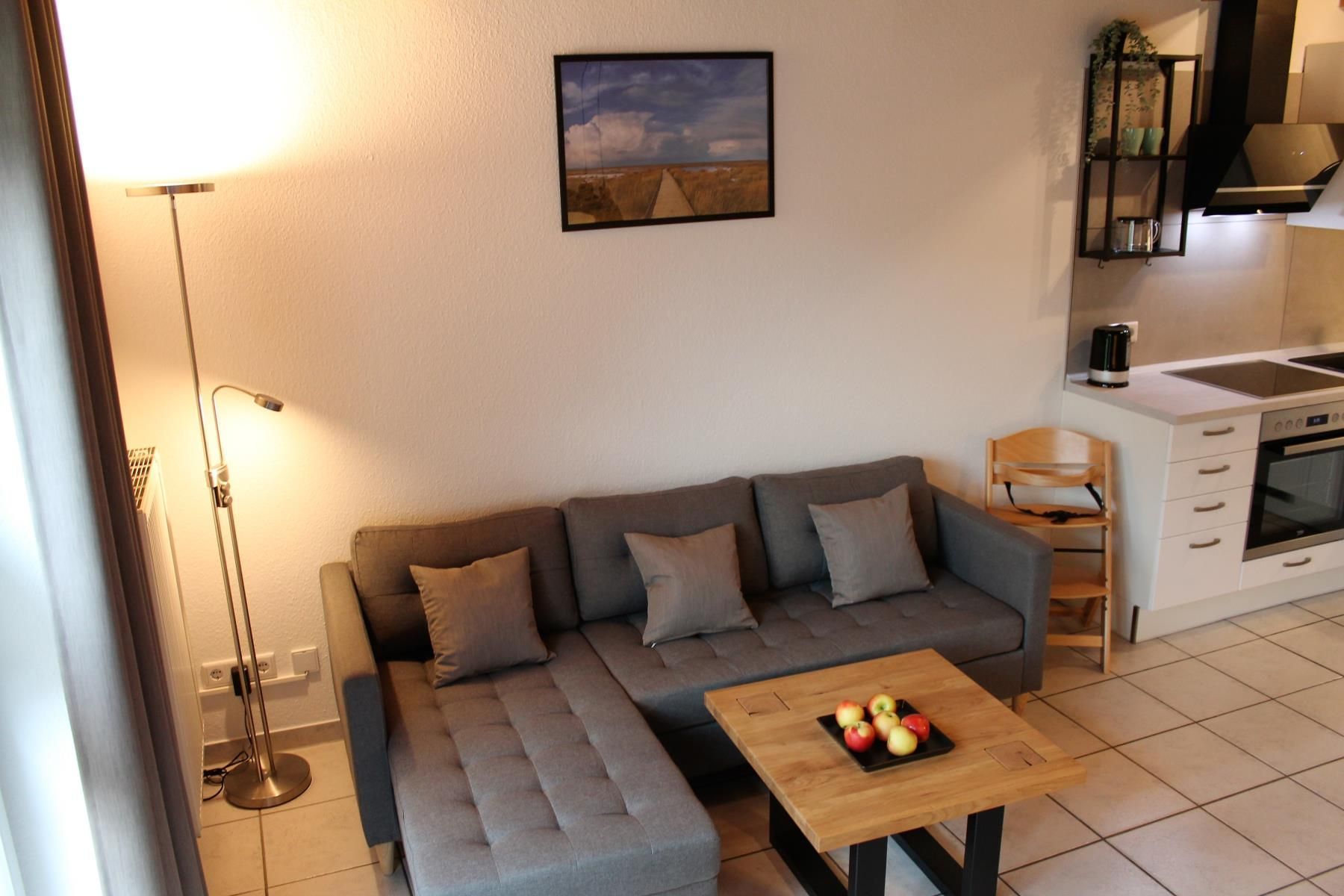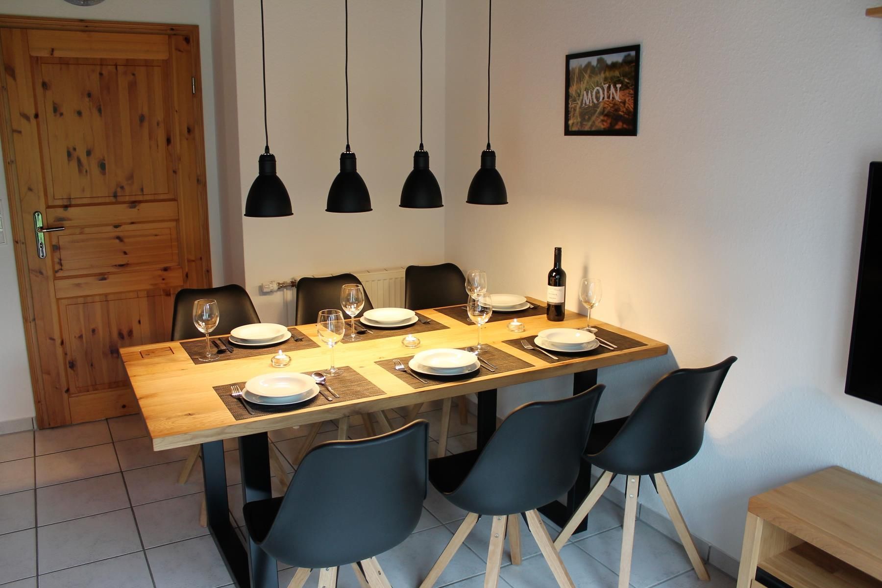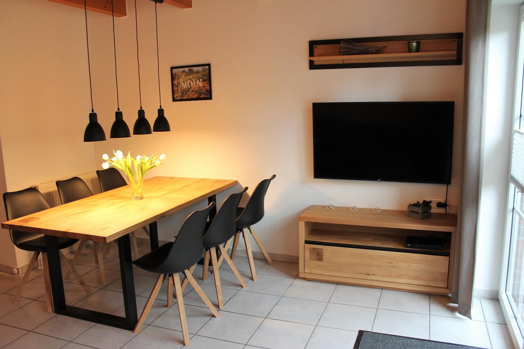 Im Wohnzimmer mit Essbereich erwarten Sie ein gemütliches Sofa, Sessel und Couchtisch. Ein großer Flachbild-TV (49 Zoll) und ein Blu-Ray-Player sorgen für Ihre Unterhaltung. Zum gemeinsamen Essen und Trinken lädt der große Esstisch mit sechs Stühlen ein.