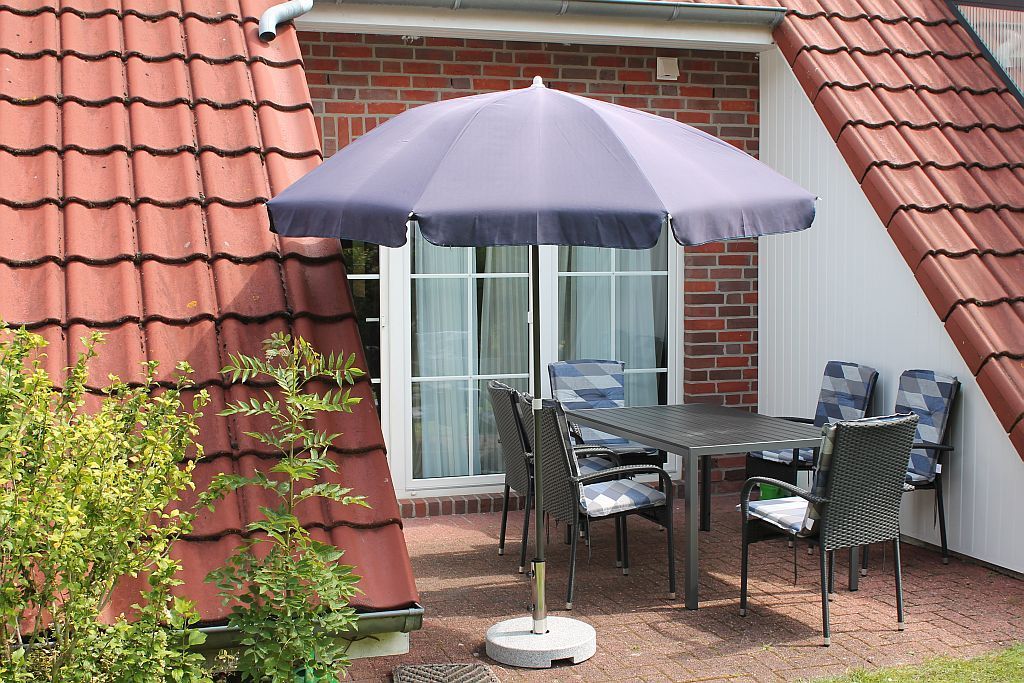 Vom Wohnbereich aus gelangen Sie auf die schöne Südwest-Terrasse, die mit sechs Stühlen (inkl. Polster), Tisch, Sonnenschirm, zwei Sonnenliegen und Grill ausgestattet ist.