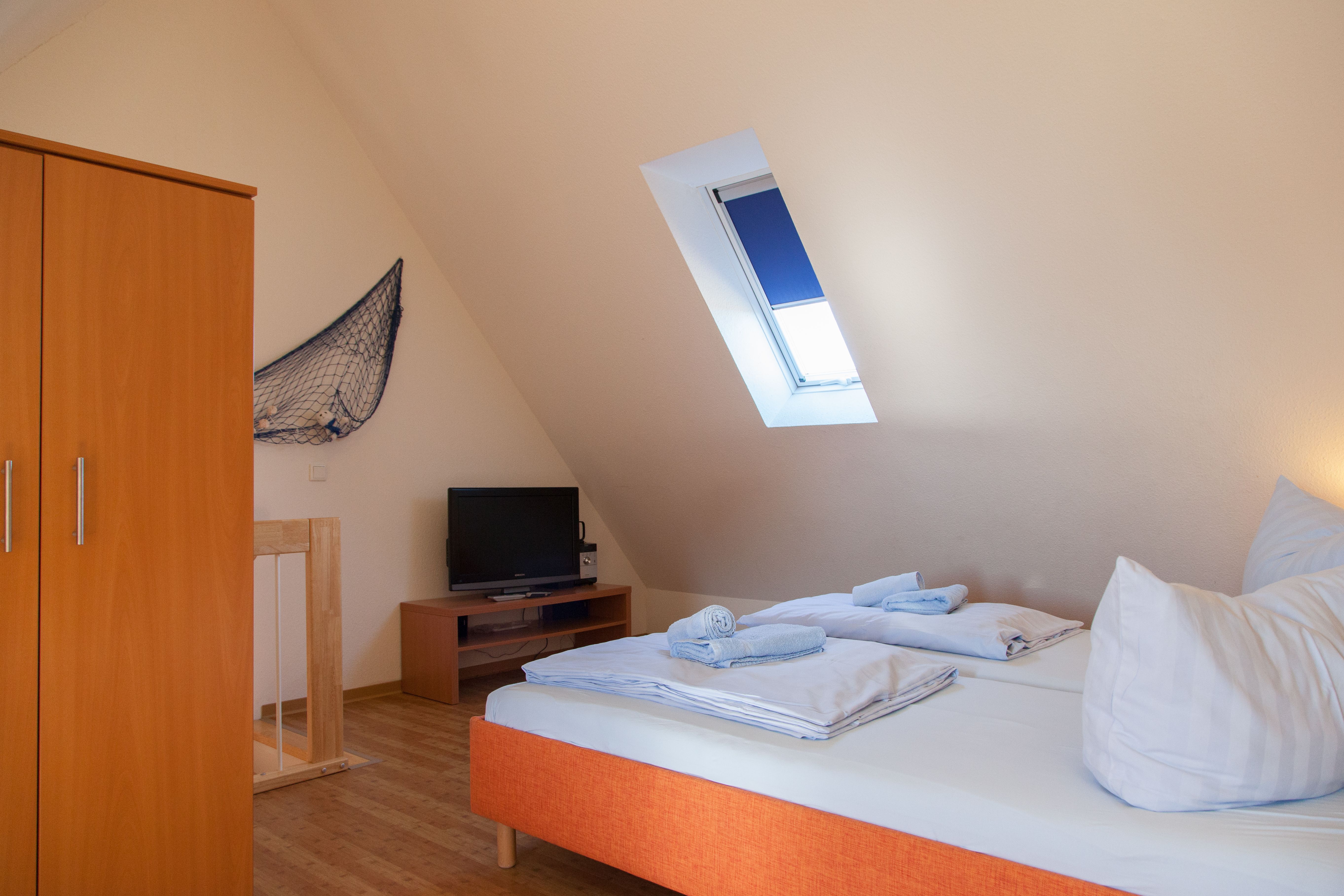 Das ist die Ausstattung: gemütliche Schlafgelegenheiten für bis zu 8 Personen und ein Kleinkind, davon zwei Betten im vollausgebauten Spitzboden. Dort finden Sie auch eine zusätzliche Spielecke für Ihre Kinder oder für die Älteren eine behagliche Rückzugsmöglichkeit im bequemen Sessel mit Leselampe zum Schmökern, Musik hören (Stereoanlage) oder Fernsehen (Plasma-Bildschirm, der mit allen erforderlichen Anschlüssen für moderne Spielekonsolen ausgestattet - natürlich nur für die jüngeren Älteren...)