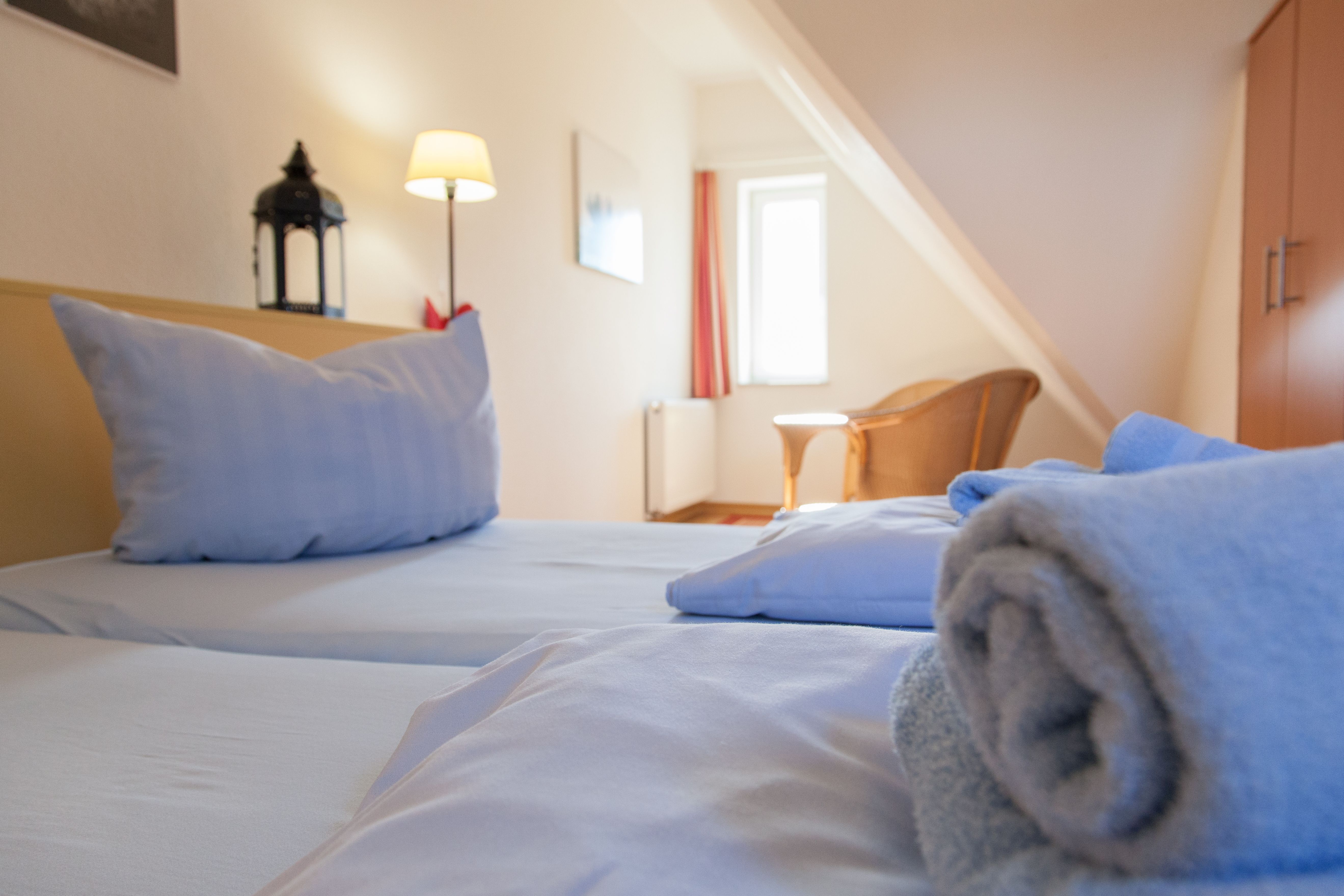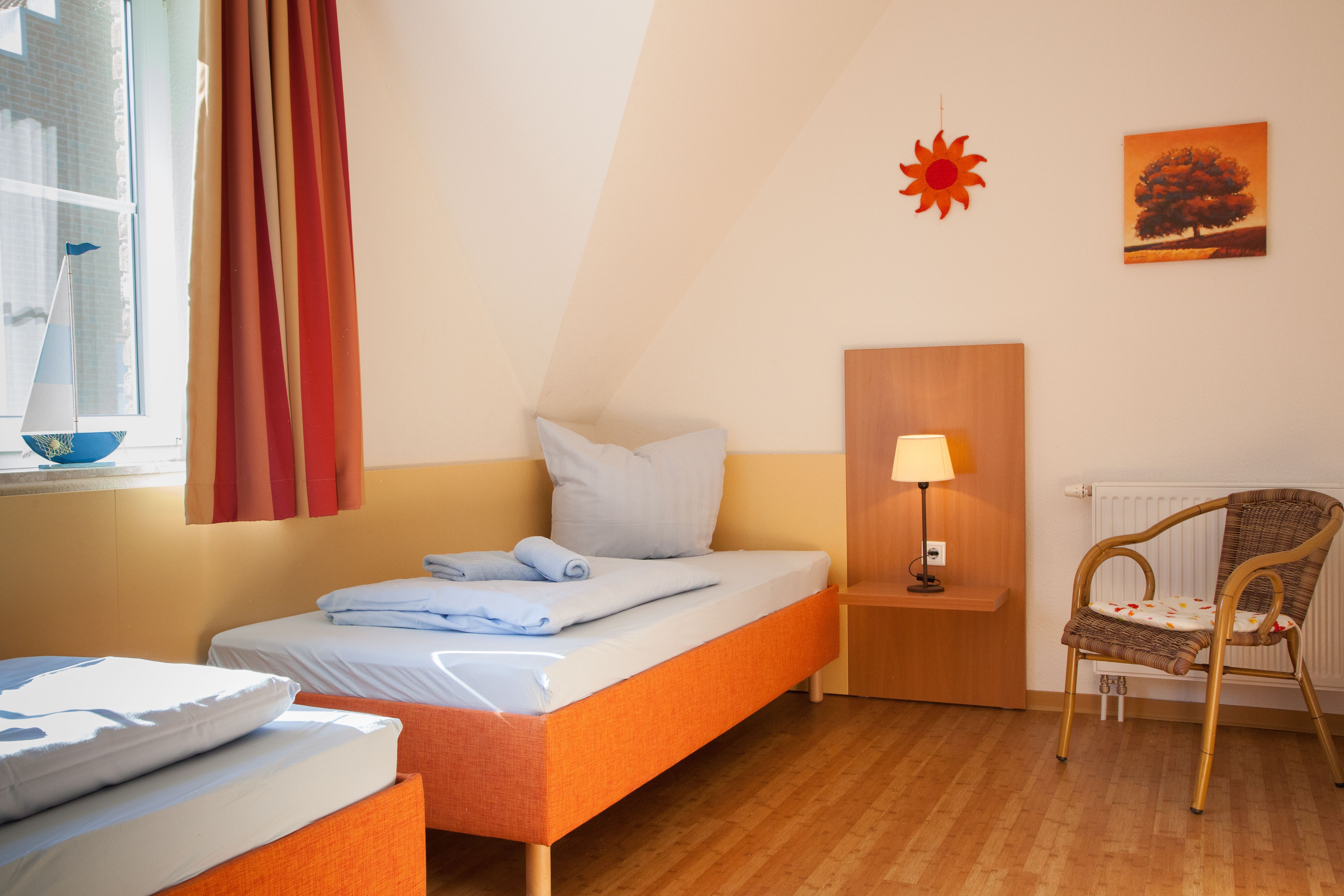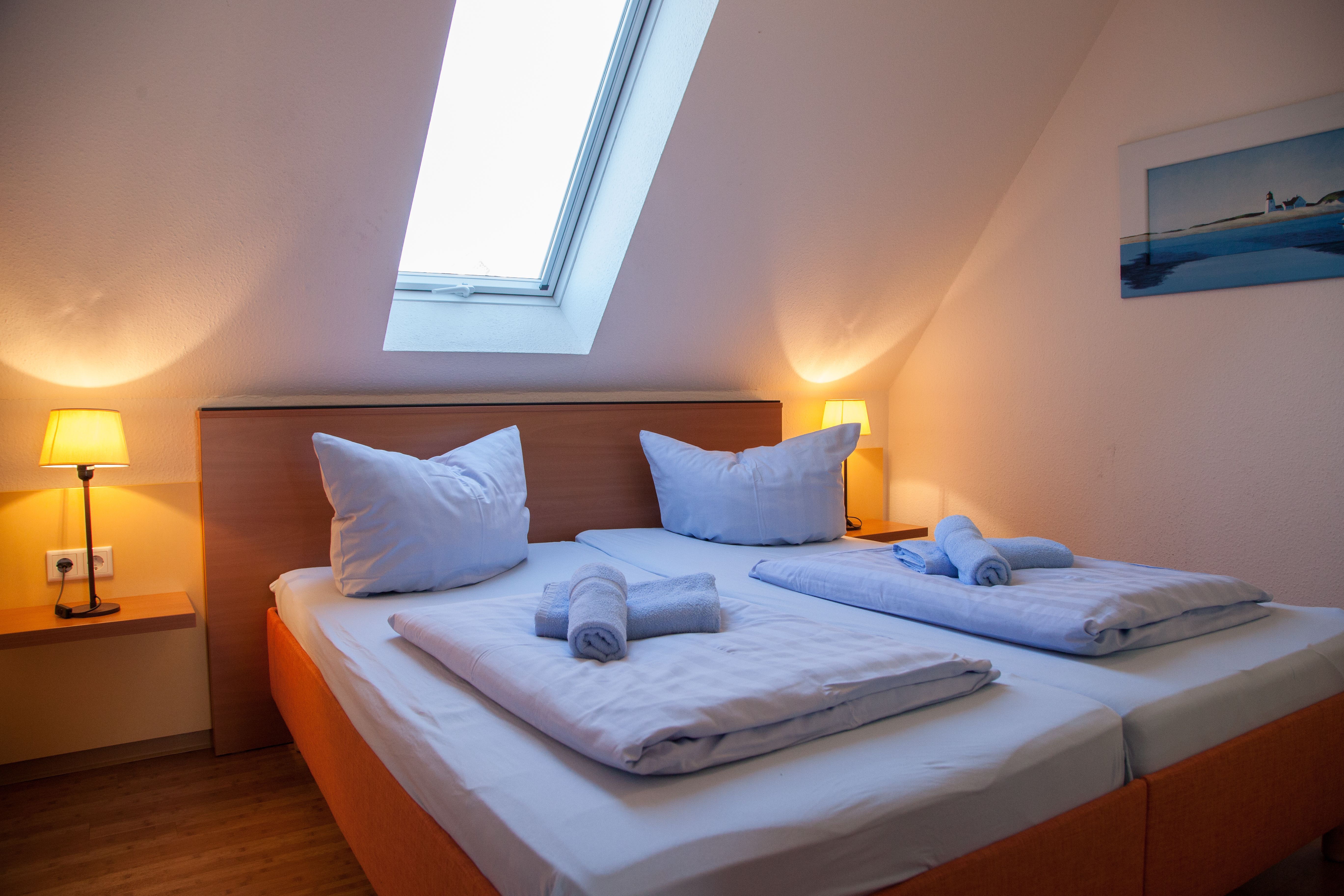 Im Obergeschoss zwei freundlich eingerichtete Schlafzimmer mit stimmungsvoller Beleuchtung, einmal mit Doppelbett, einmal mit zwei Einzelbetten. Große Kleiderschränke und viel Extra-Stauraum (eigener Abstellraum für die Koffer) unterstreichen die Familienfreundlichkeit unseres Hauses.
