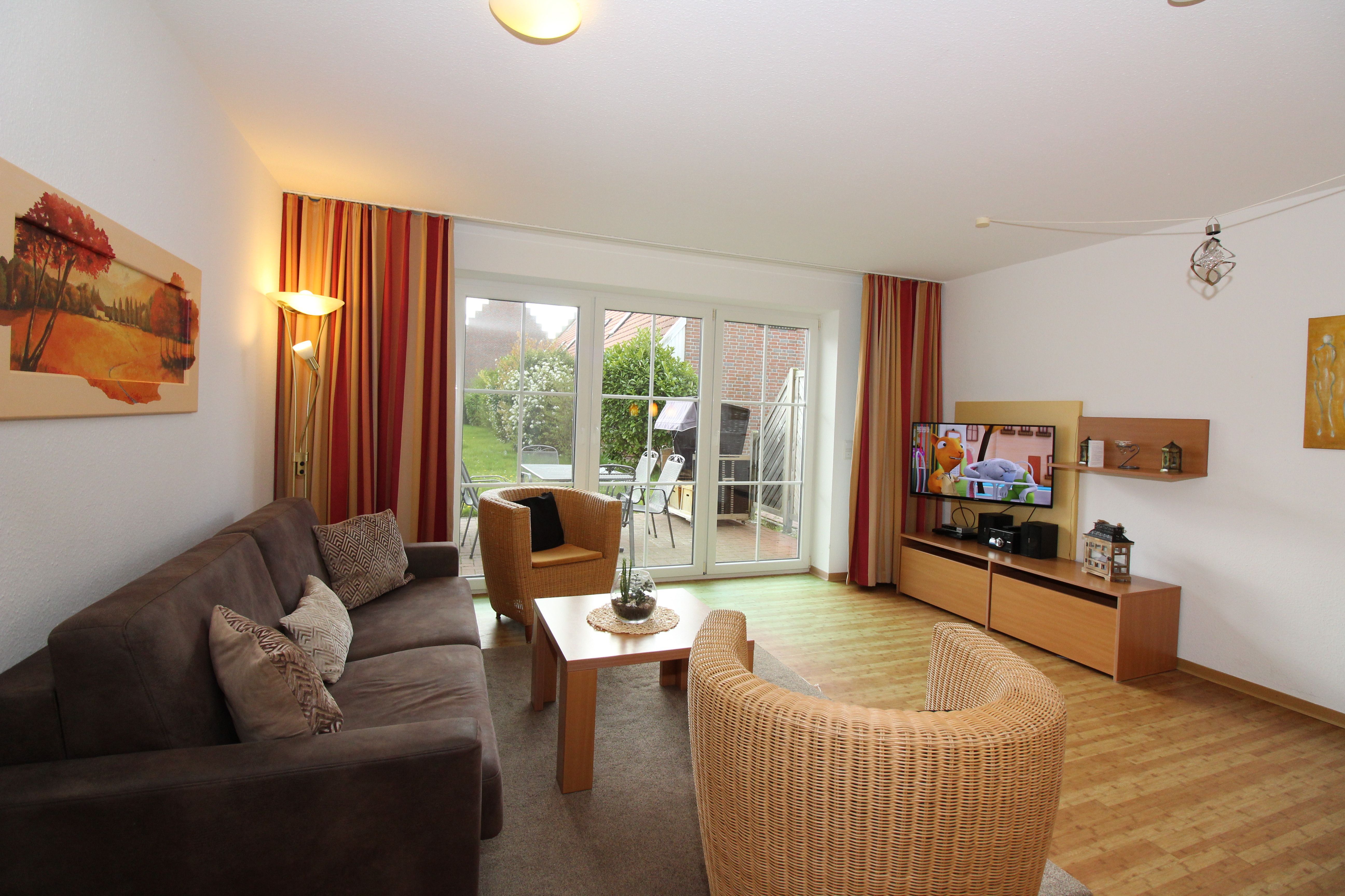 Im Erdgeschoss finden Sie ein supergemütliches Wohnzimmer mit angrenzender Sonnen-Süd-Terasse, Sofa, bequemen Korb-Sesseln und kuscheliger Beleuchtung, großem Plasma-Farbfernseher, DVD und Musikanlage, eine kleine ausgesuchte Bibliothek für Jung und Alt und verschiedene Spiele für ein fröhliches Miteinander.