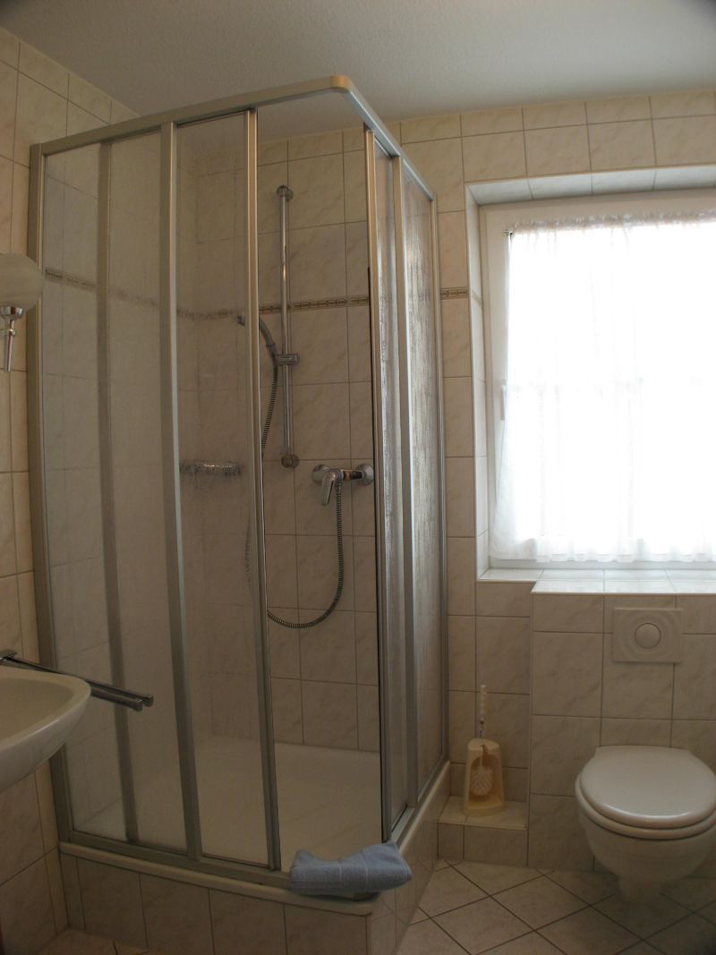 Im Bad befindet sich neben Dusche/WC, ein großes Waschbecken und ein 1,80 m hoher Badheizkörper.