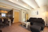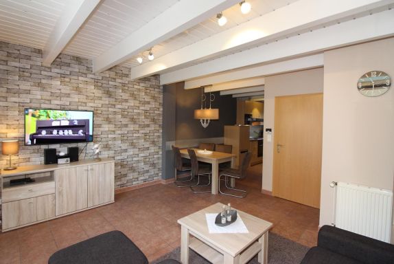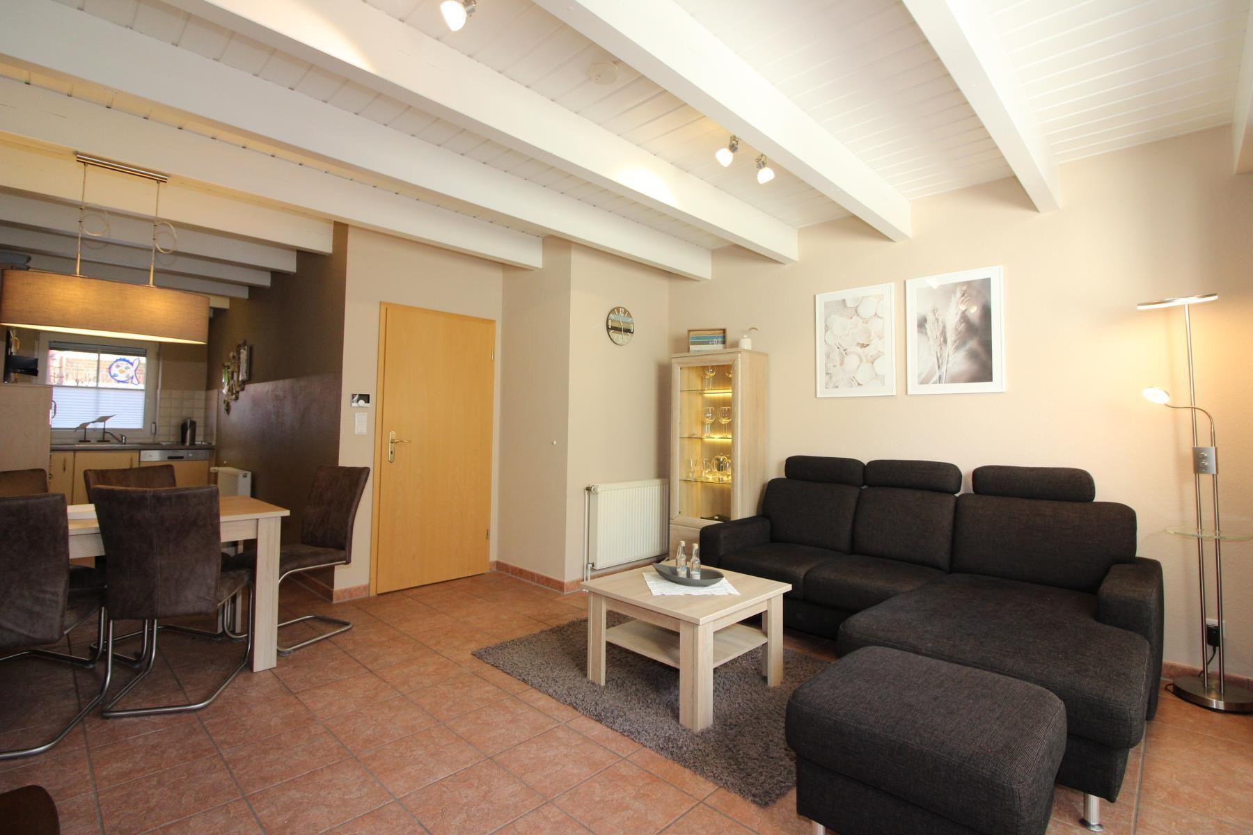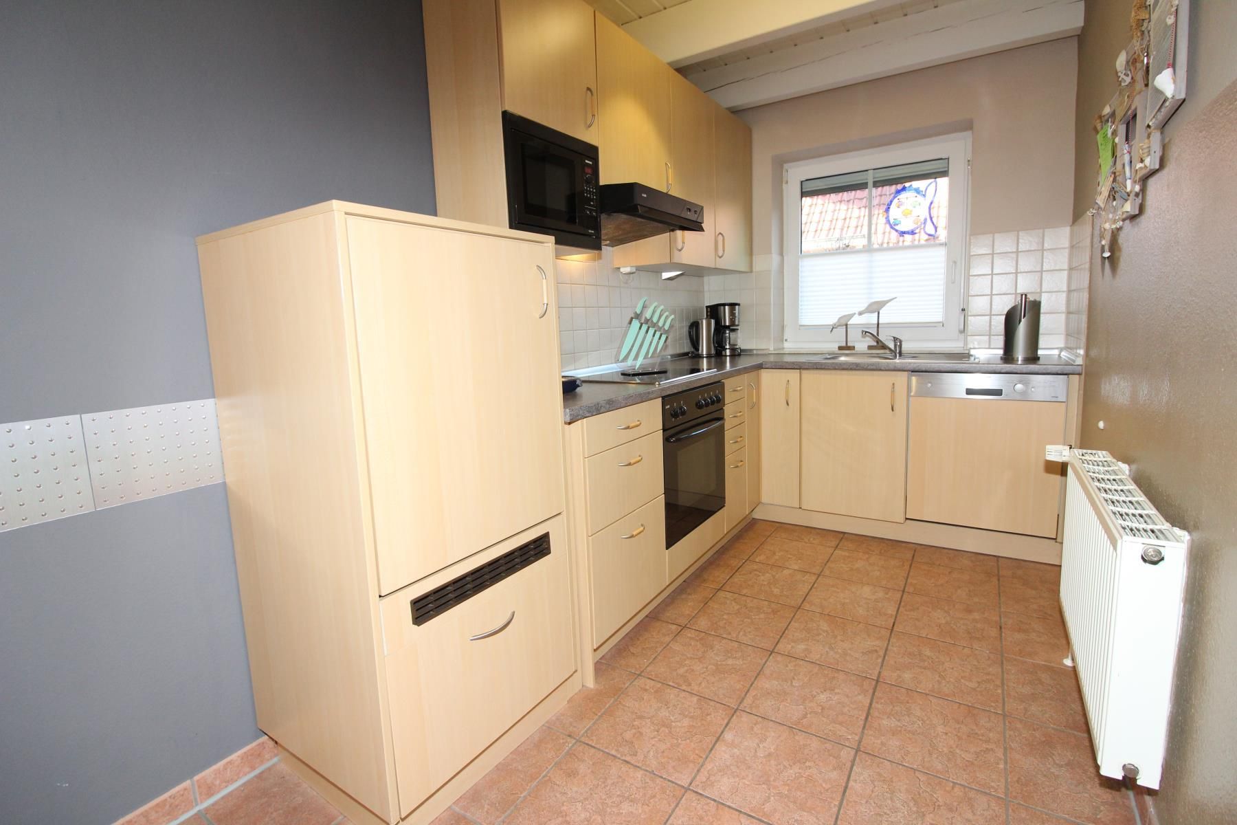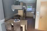 Dieoffene Küche ist ausgestattet mit Backofen, Spülmaschine, Mikrowelle, Kaffeemaschine, Wasserkocher und Toaster. Geschirr und Gläser sind ausreichend vorhanden. Der Essbereich lädt mit großem Tisch und gemütlichen Stühlen bis zu 6 Personen ein.