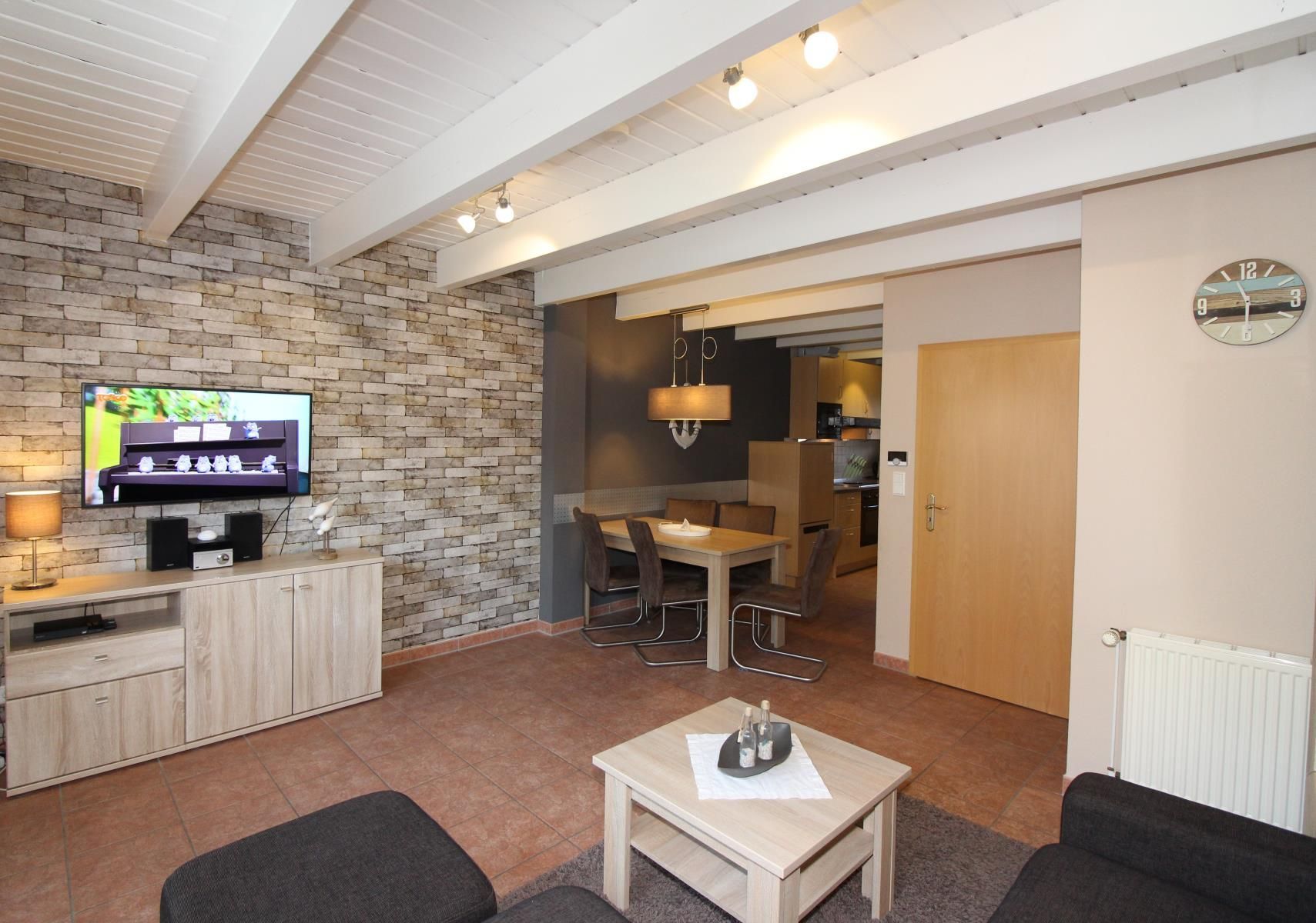 Der Wohnbereich verwöhntSie mit bequemer Couch, 43 LCD-TV mit Kabelanschluss, Blu-Ray-Player und CD-Stereoanlage mit Anschlussmöglichkeit für Smartphone.
