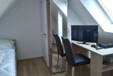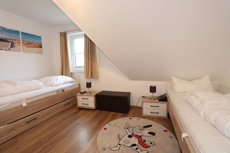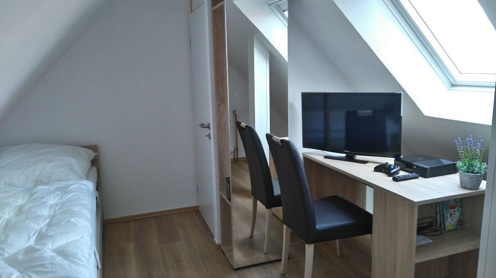 Im Dachgeschoss gibt es einen weiteren Schlafraum mit Schreibtisch und Sitzgarnitur, Flachbild TV und Spielekonsole. Der Raum ist komplett abdunkelbar.