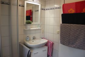 Im Obergeschoss befindet sich das Duschbad mit WC und Waschbecken. Im Erdgeschoss befindet sich das zweite Bad mit WC und Waschbecken. Beide Bäder sind mit einem Fön ausgestattet. Zu den Bädern gehören ein Kinderschemel und ein Kinder WC-Sitz.