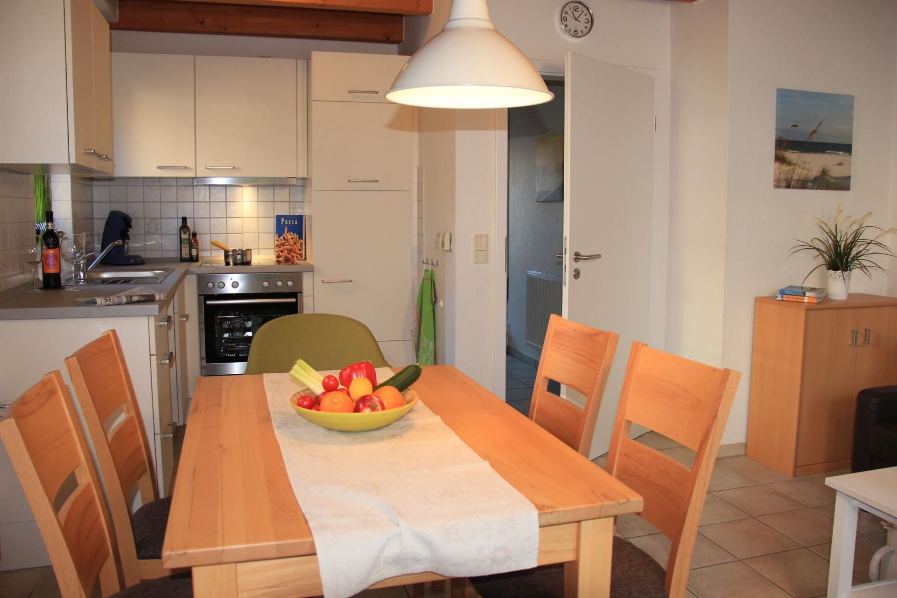 Separater Essplatz mit sechs Stühlen und ein Kinderhochstuhl, Kinderreisebett, Stereoanlage, voll ausgestattete Einbauküche mit Mikrowelle, Geschirrspüler, Toaster, Wasserkocher, Mixer, Kaffee/Senseo-Maschine, Kühlschrank mit Tiefkühlfach, Backofen, 4er Ceranfeld u.v.m.