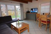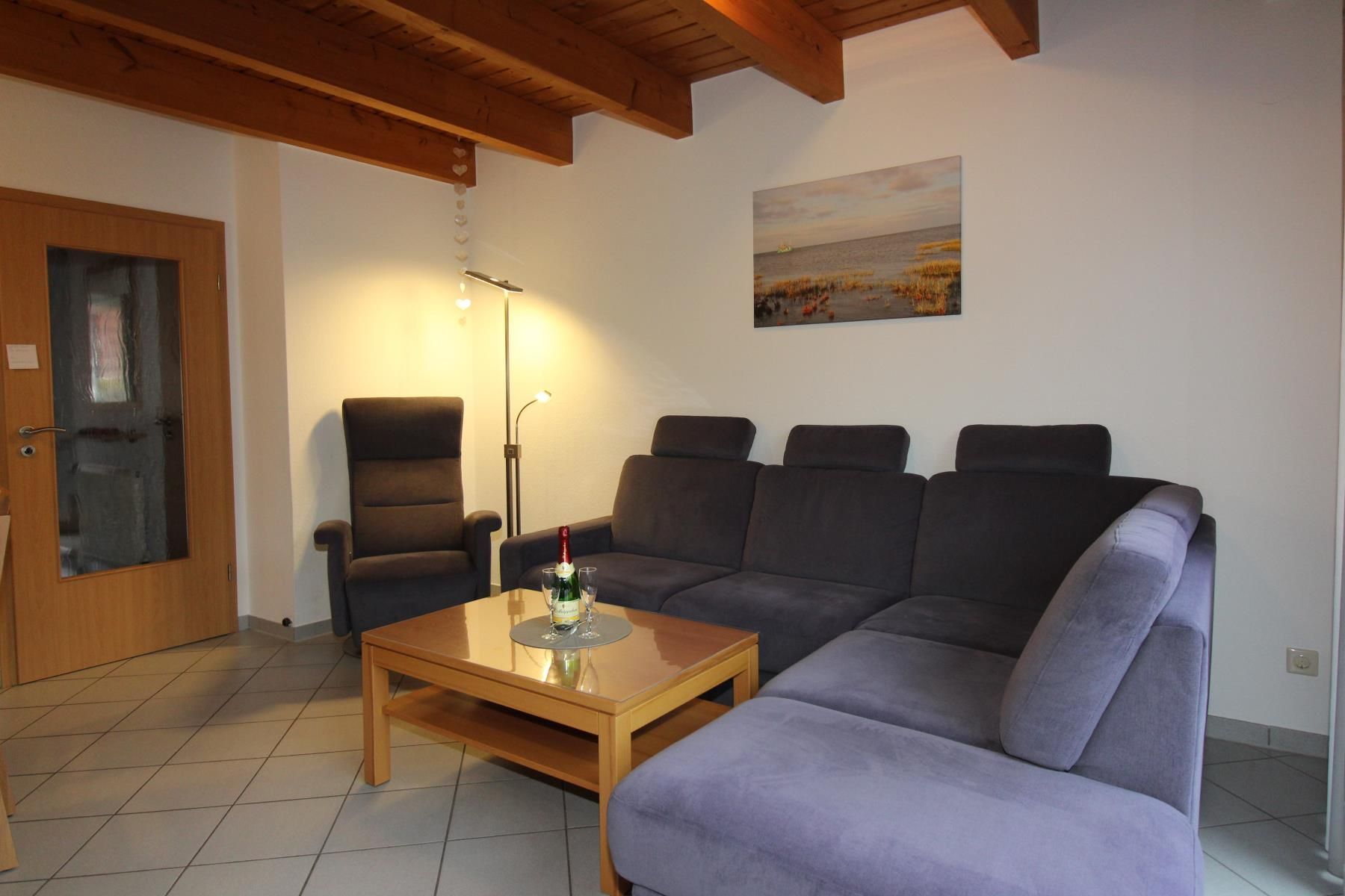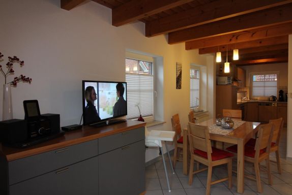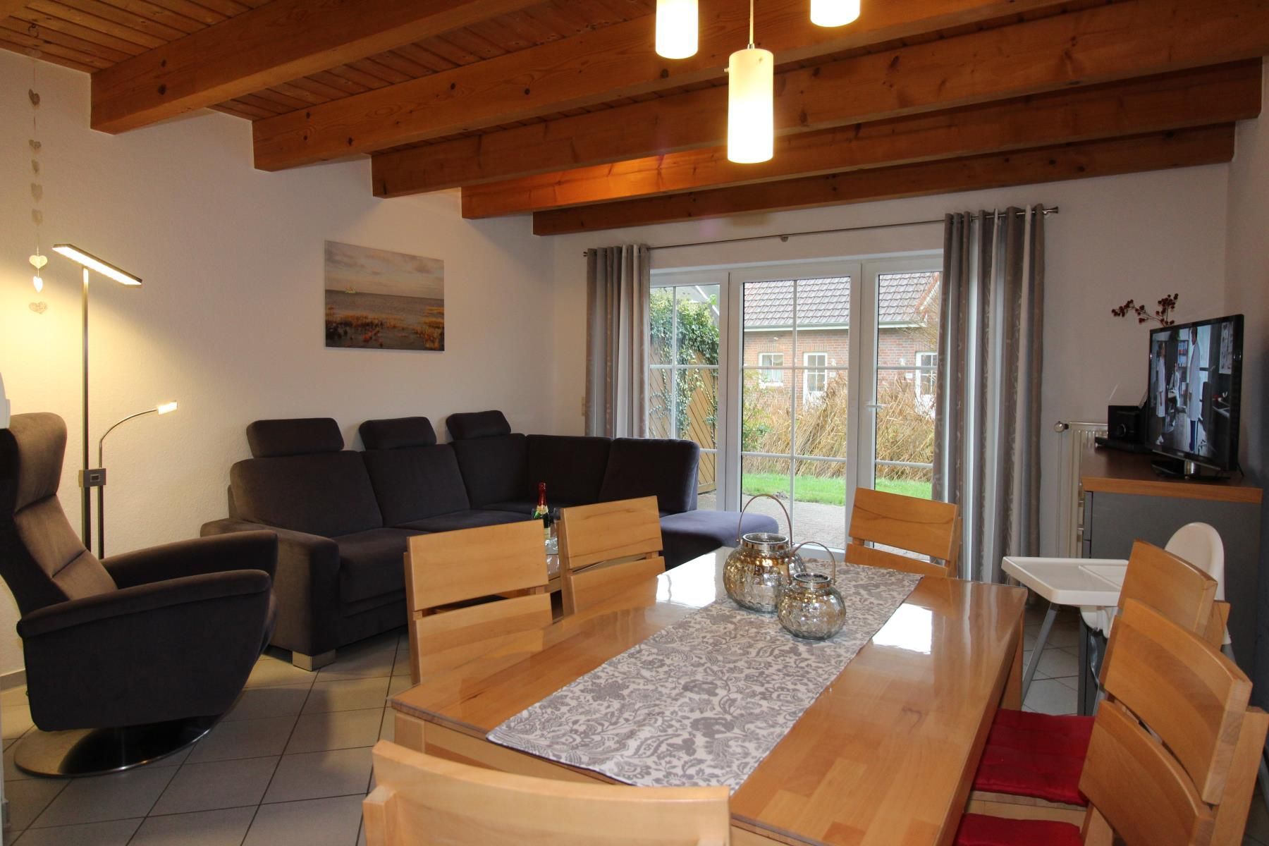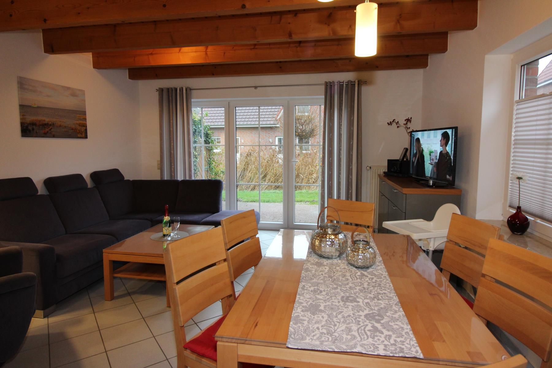 Ein Esstisch mit sechs Stühlen und zwei Kinderhochstühlen verbindet die Küche mit dem offenen Wohnbereich. Dieser ist mit großem Ecksofa, Tisch und mit einem Fernsehsessel ausgestattet. Zur Unterhaltung gehören ein großes Flachbild-TV-Gerät, DVD-Player und HiFi-Stereoanlage, sowie Bücher für Groß und Klein, Gesellschaftspiele und Kinderspielzeug.