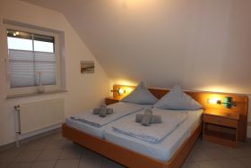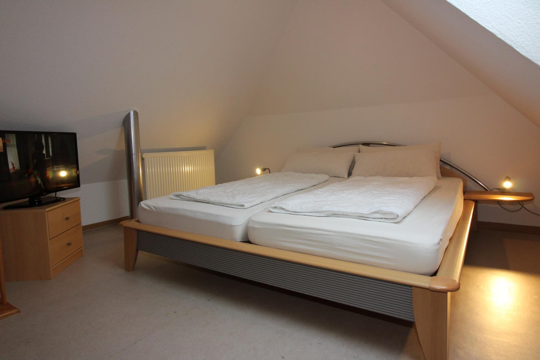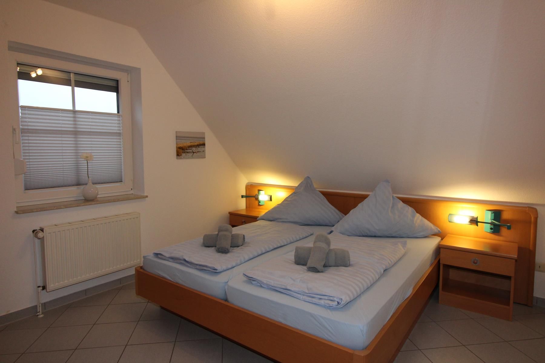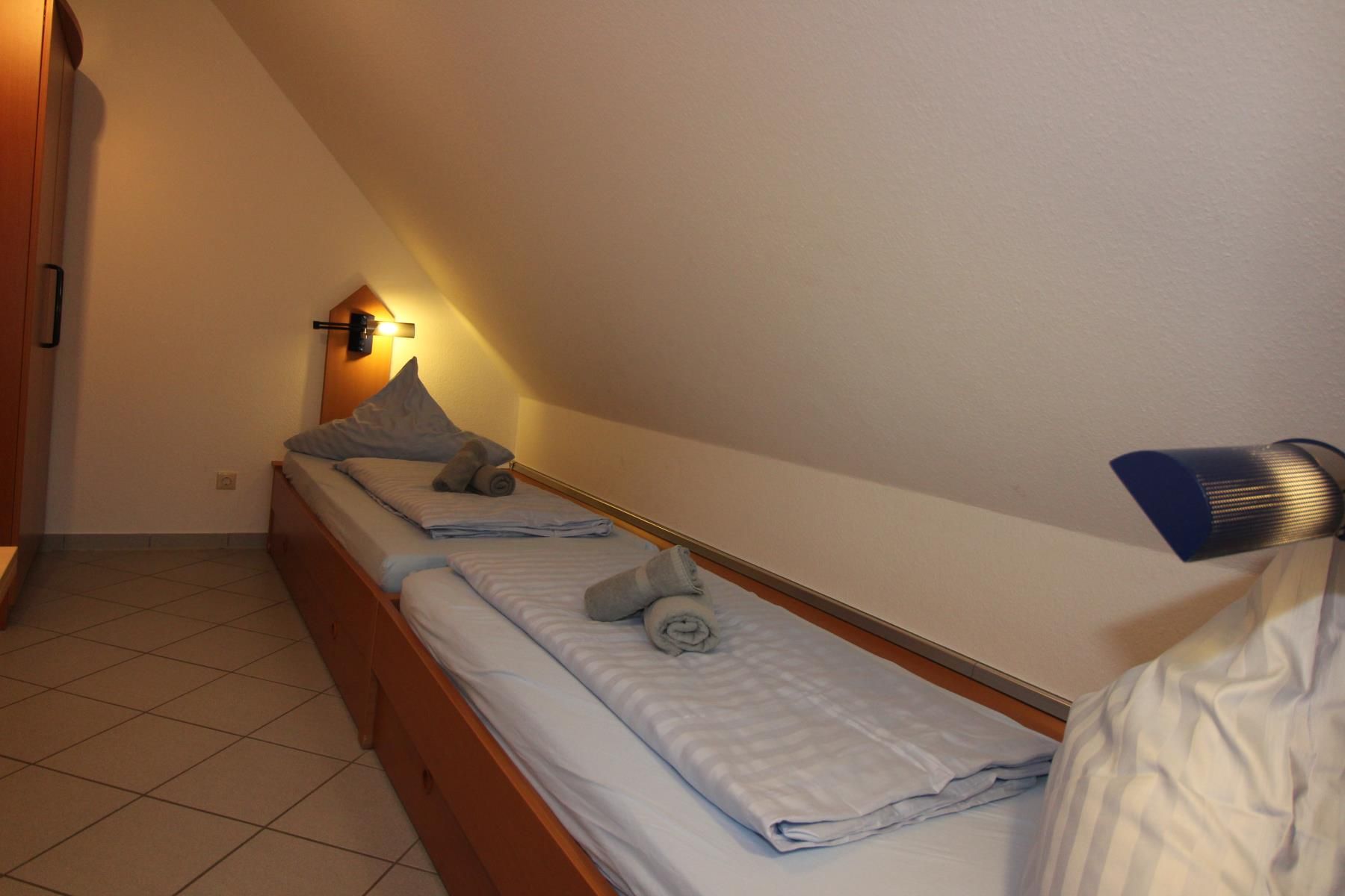 Im Obergeschoss befindet sich ein Schlafzimmer mit Doppelbett, großräumigem Schrank und Radiowecker. Das Kinderzimmer mit zwei Einzelbetten ist mit einem Kleiderschrank, einem Tisch mit zwei Stühlen, Büchern und Kassettenrekorder, inkl. CD und MC, ausgestattet.